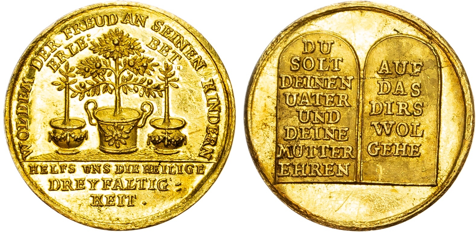 Germany, Hamburg, gold Medal of Ducat weight, early to middle 18th century, the Fourth Commandment issue: Honor thy Father and thy Mother, 3.49g (Erlanger 2447; GPH 1142). Extremely Fine.