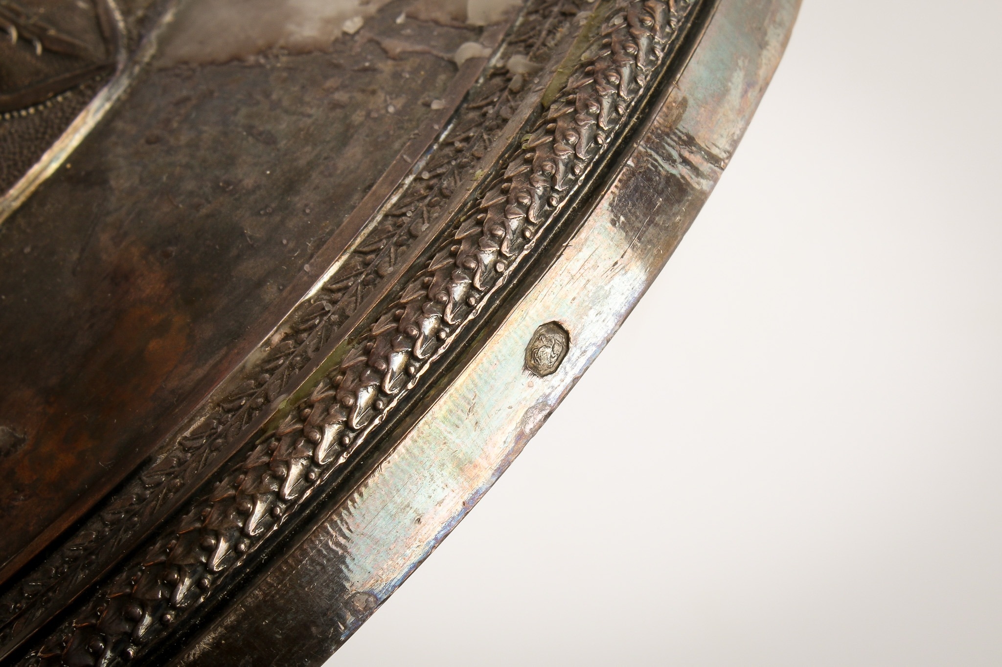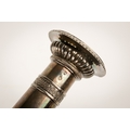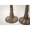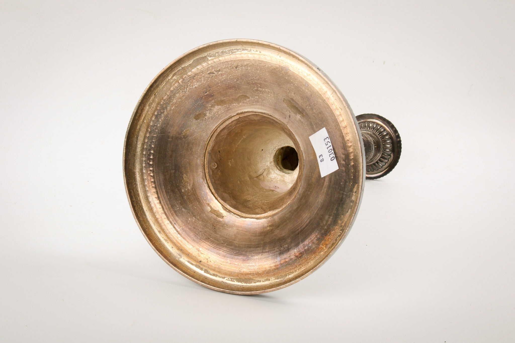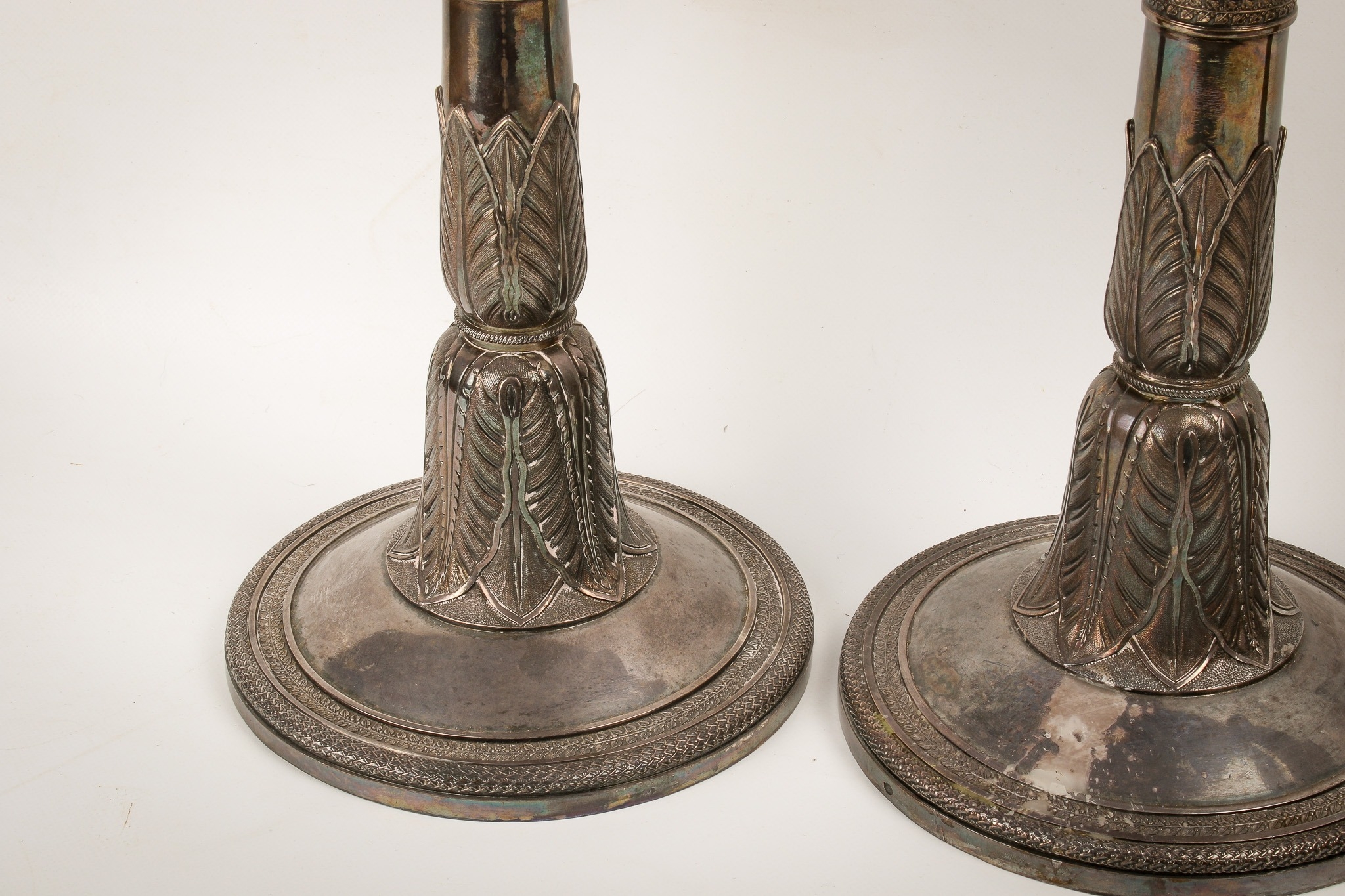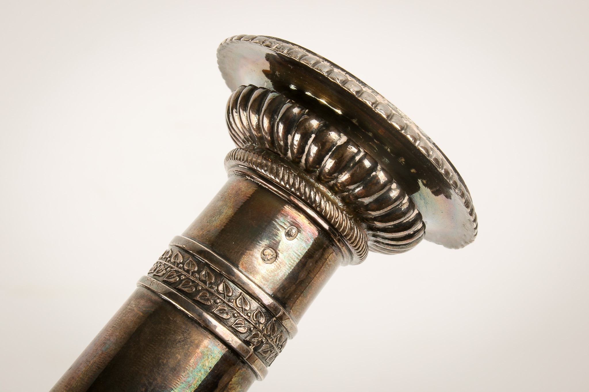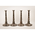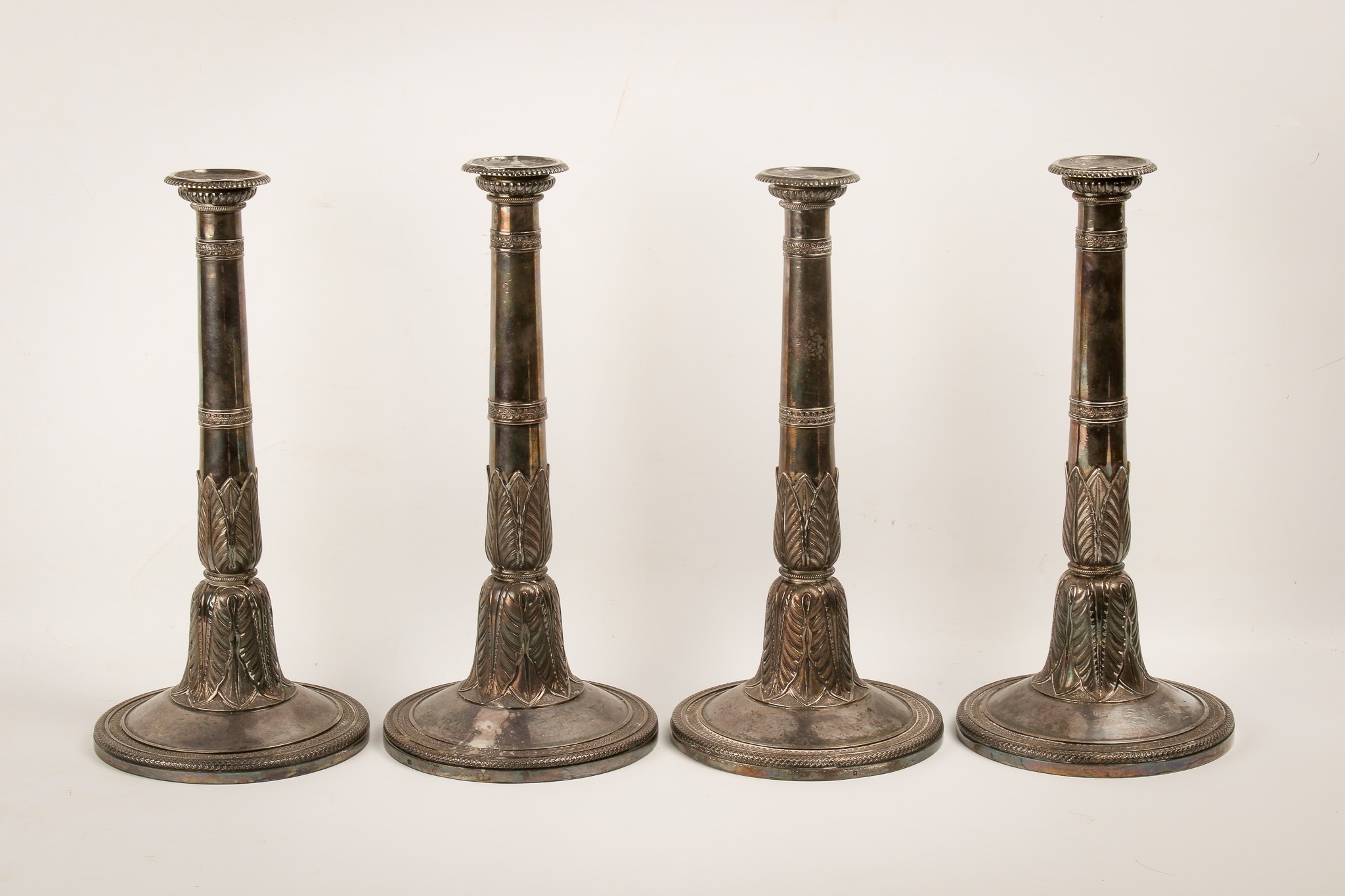 A set of four early 19th century French silver candlesticks. Of tapering form, decorated with bands of beading and leaves and central acanthus leaves border, variously marked to candlestick and drip tray with Minerva 1 head, Paris large object mark, rooster 1, and medium object head mark. H32.2cm, gross weight 4240g.