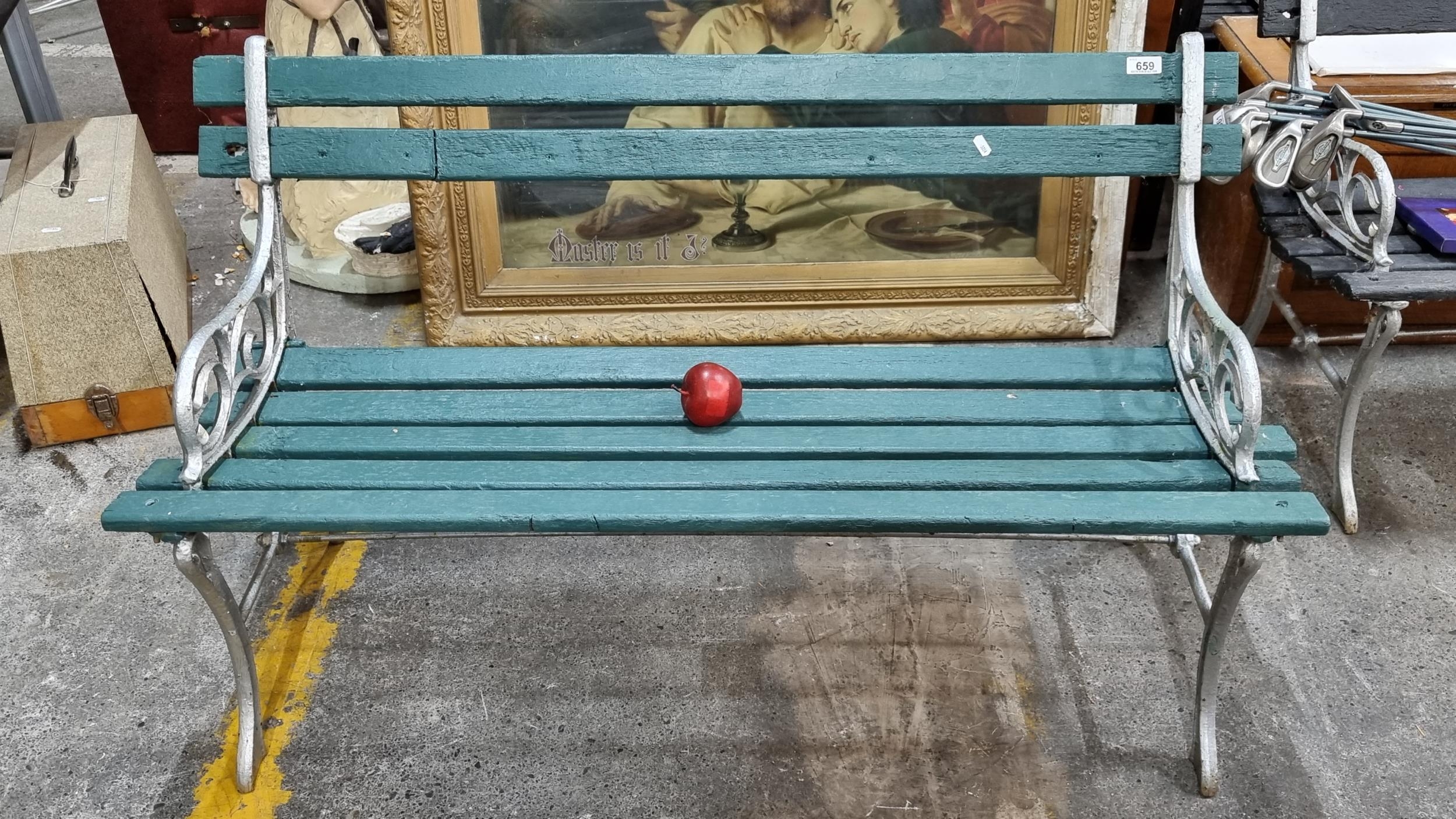 A lovely vintage garden bench with cast iron legs finished in green and silver.