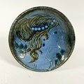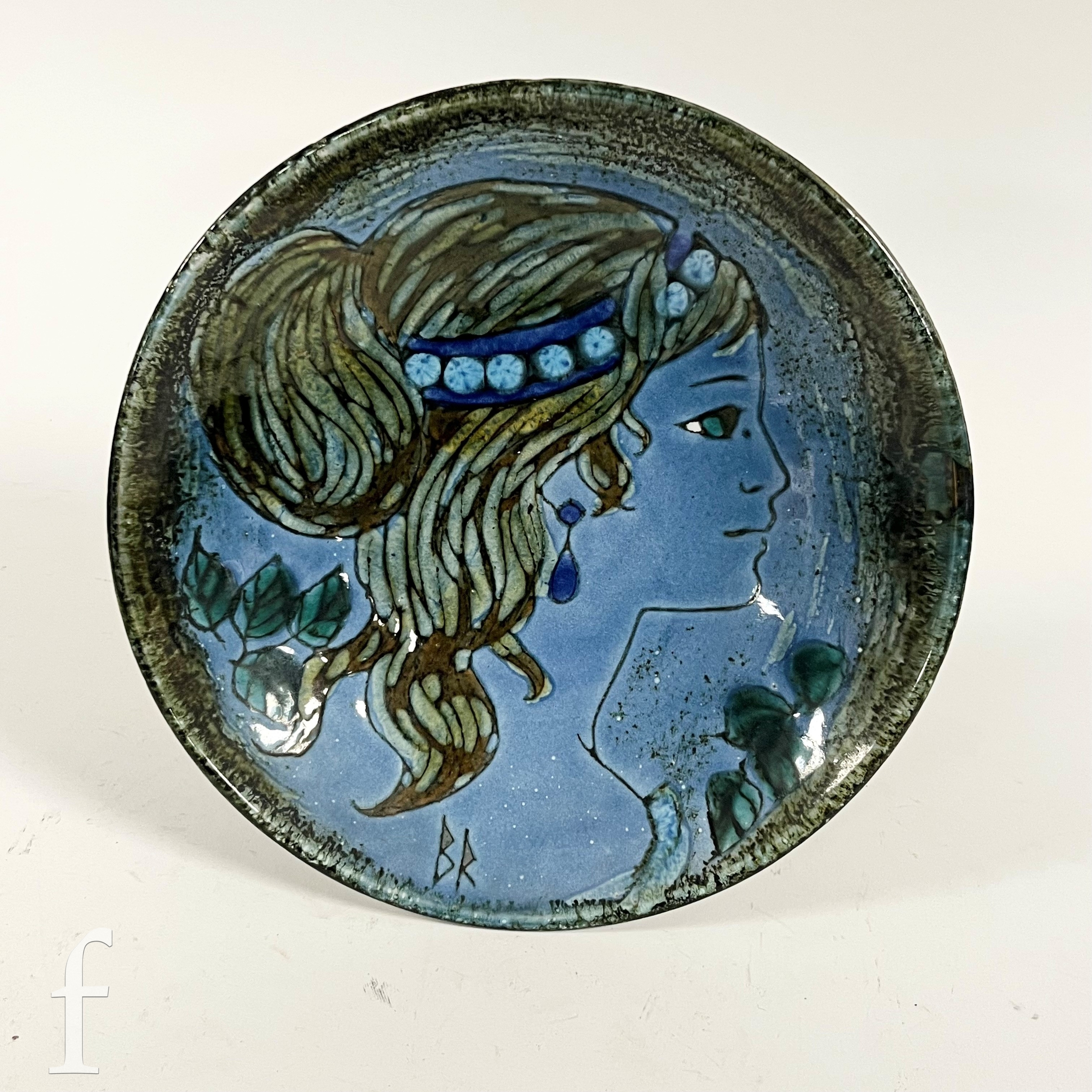 Barbara Ross for Chelsea Pottery, a mid Century shallow bowl, of circular form, incised stylised portrait of a young girl, tonal blue and ochre glaze, incised signature, diameter 24cm.