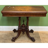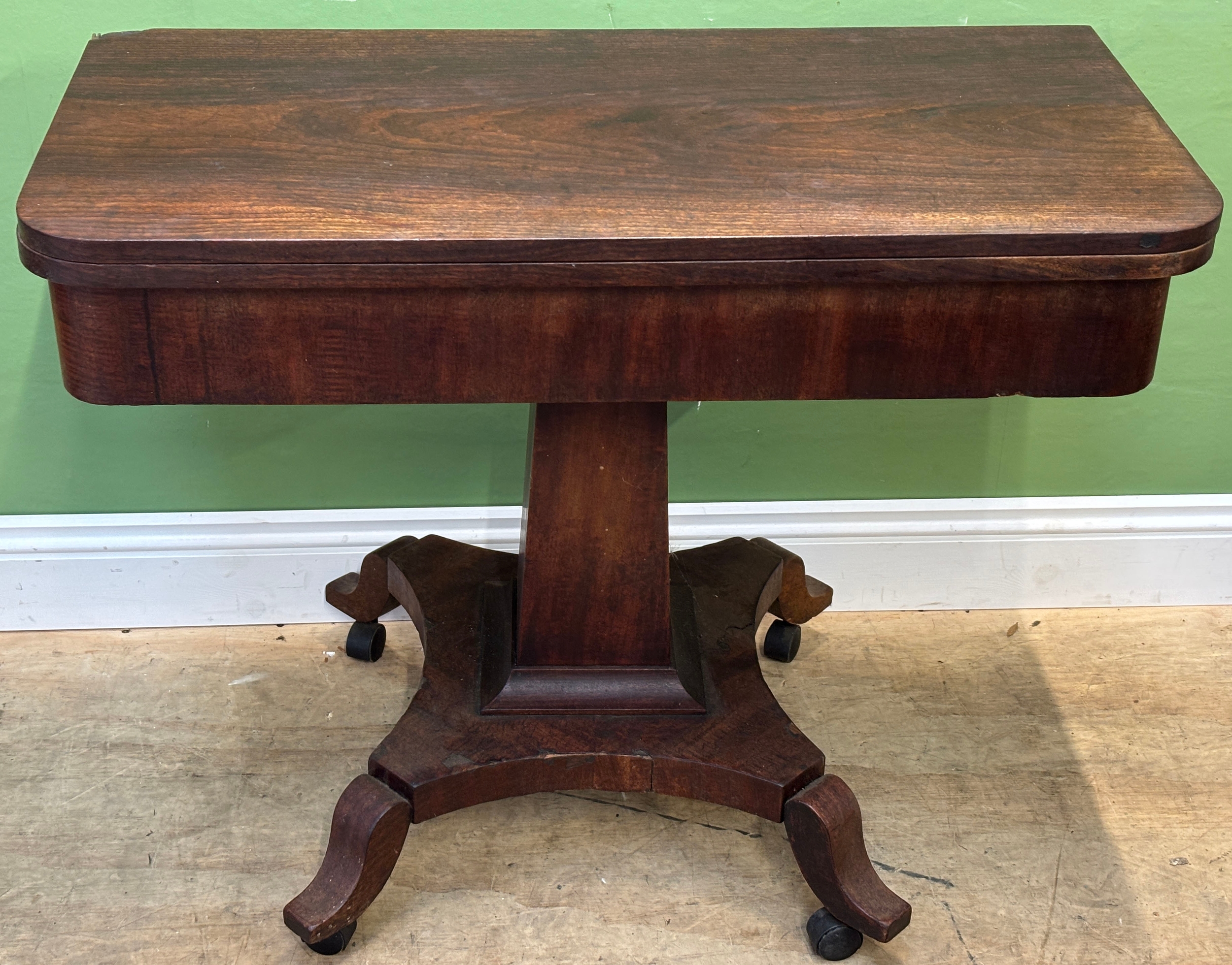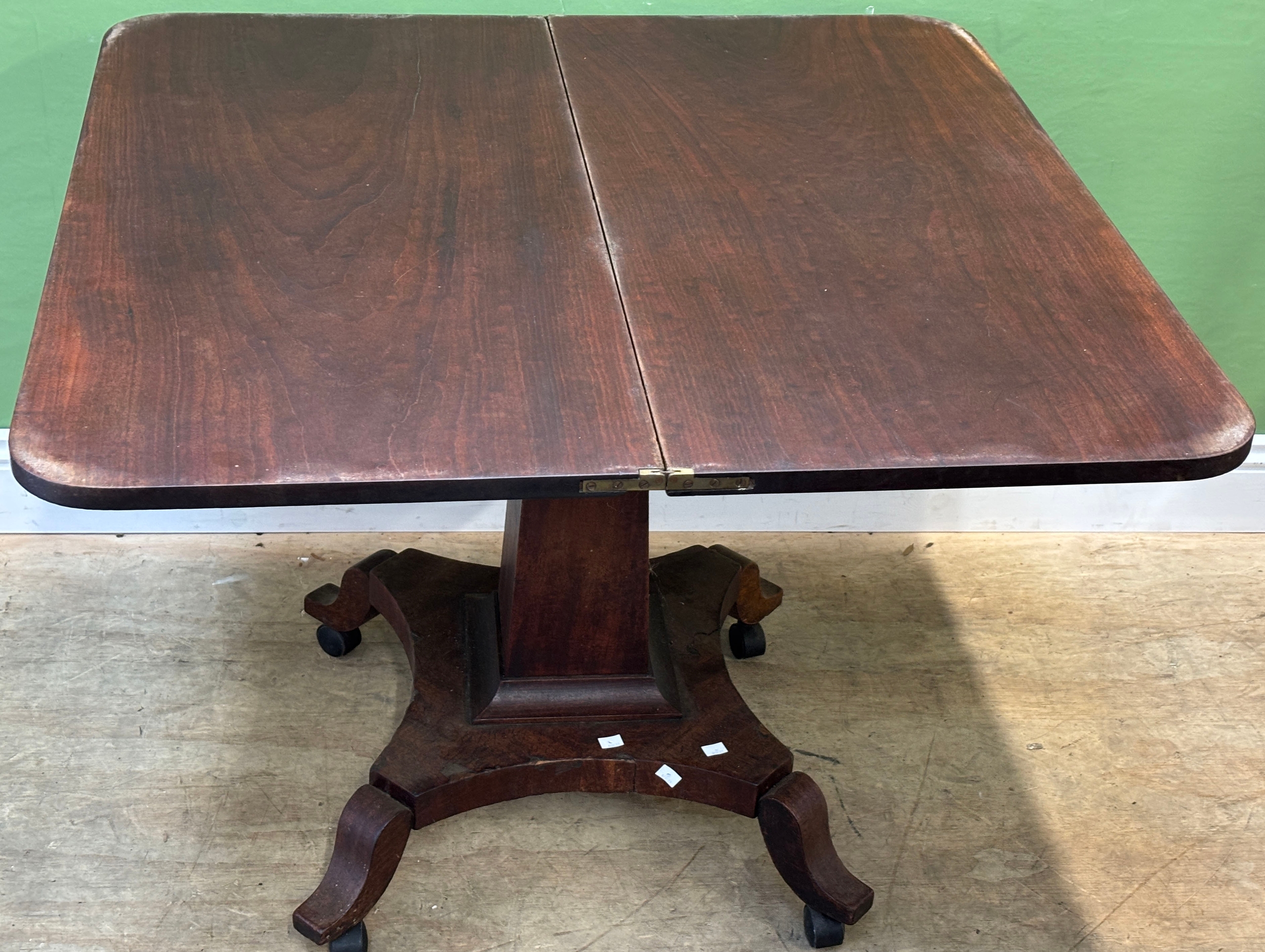 An early 19th century mahogany tea table, fold over top on tapering square column and quatrefoil base, 98x50x75cmH
