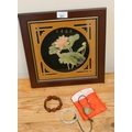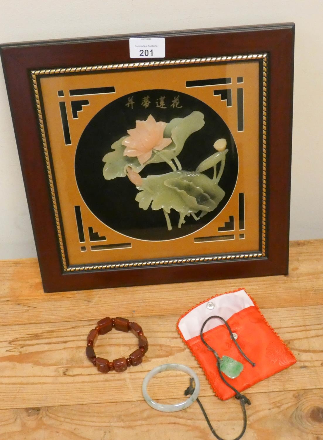 A soapstone carved panel, jade pendant, bangle and an agate stretch link bracelet
