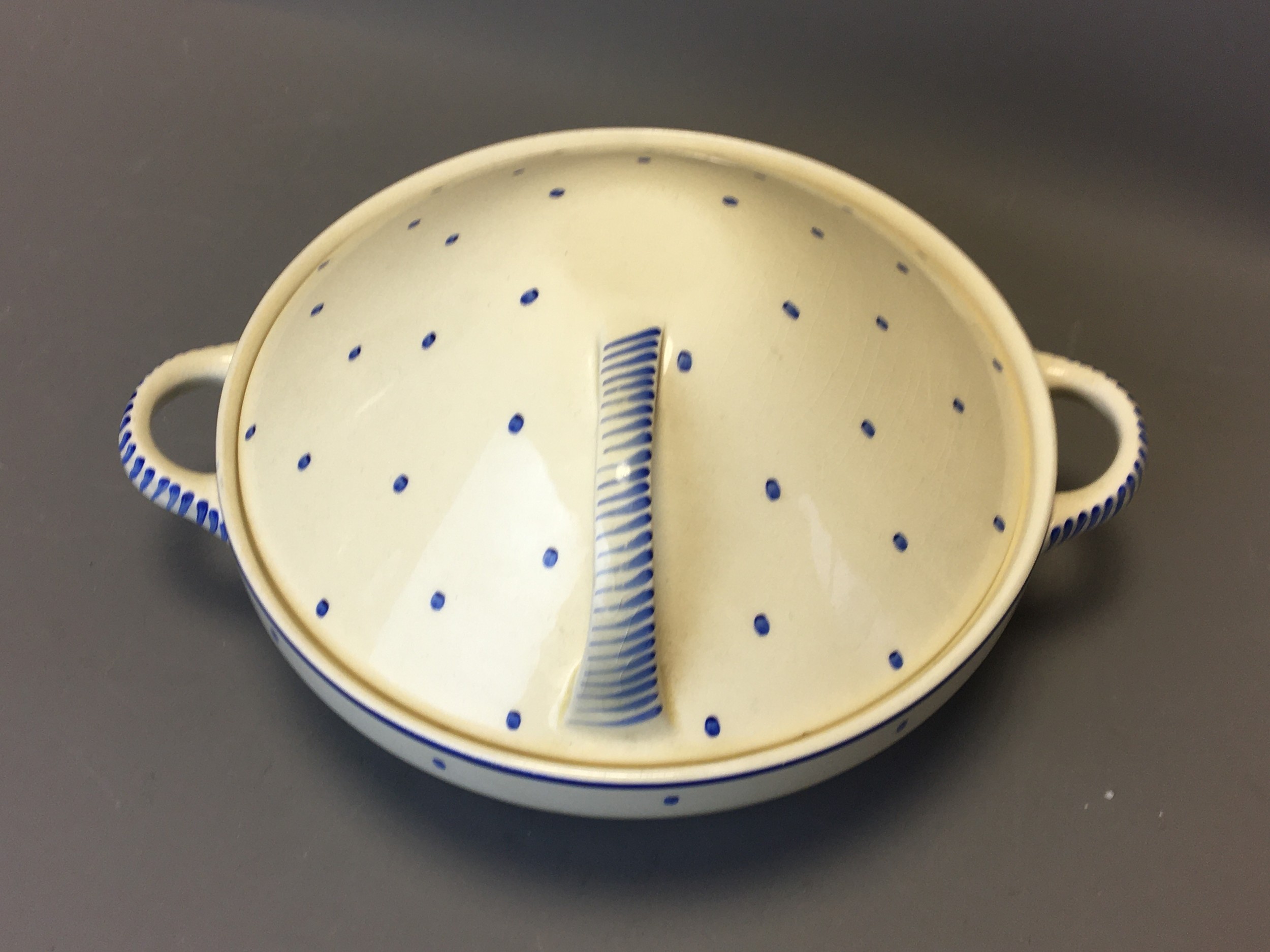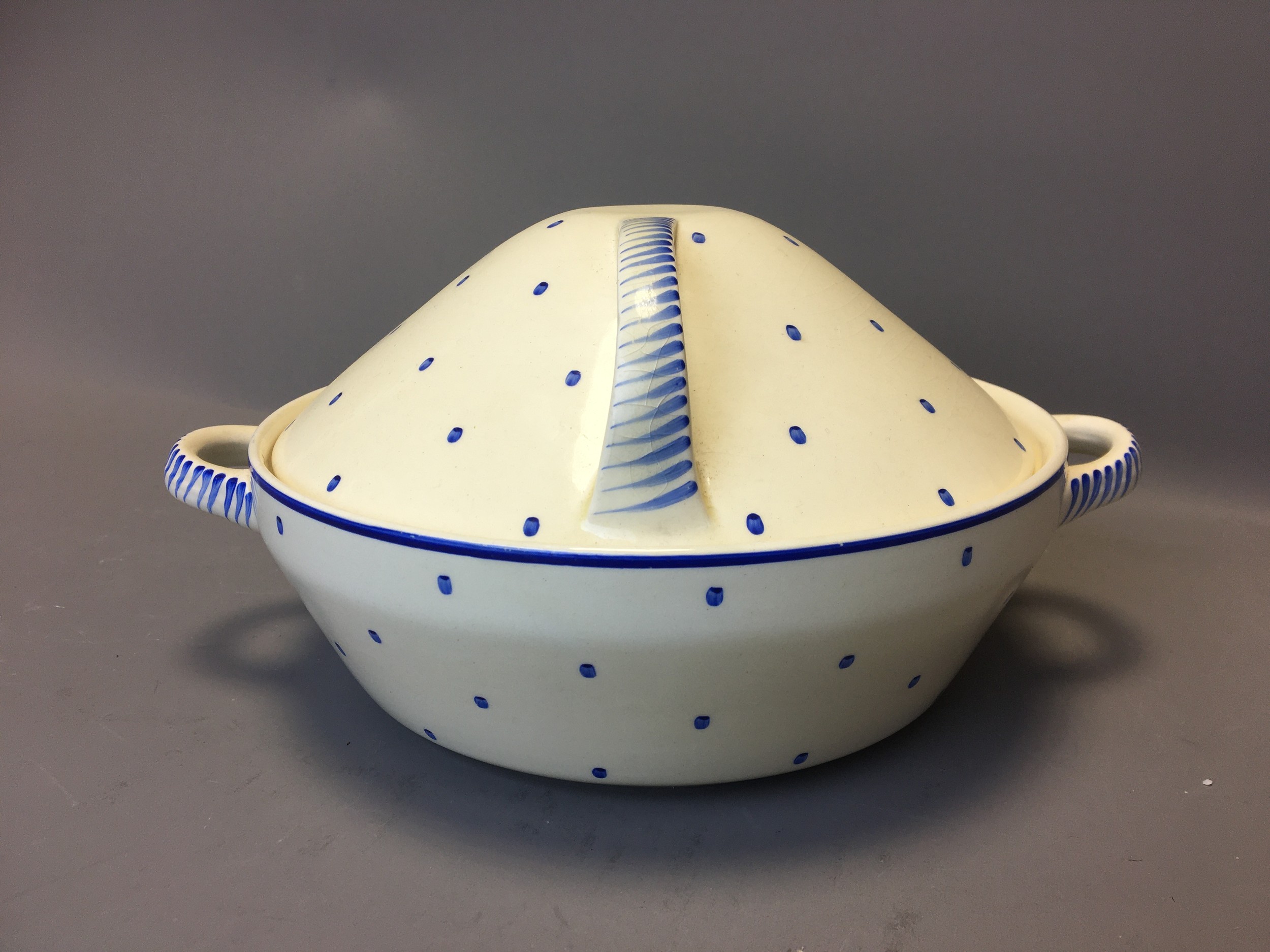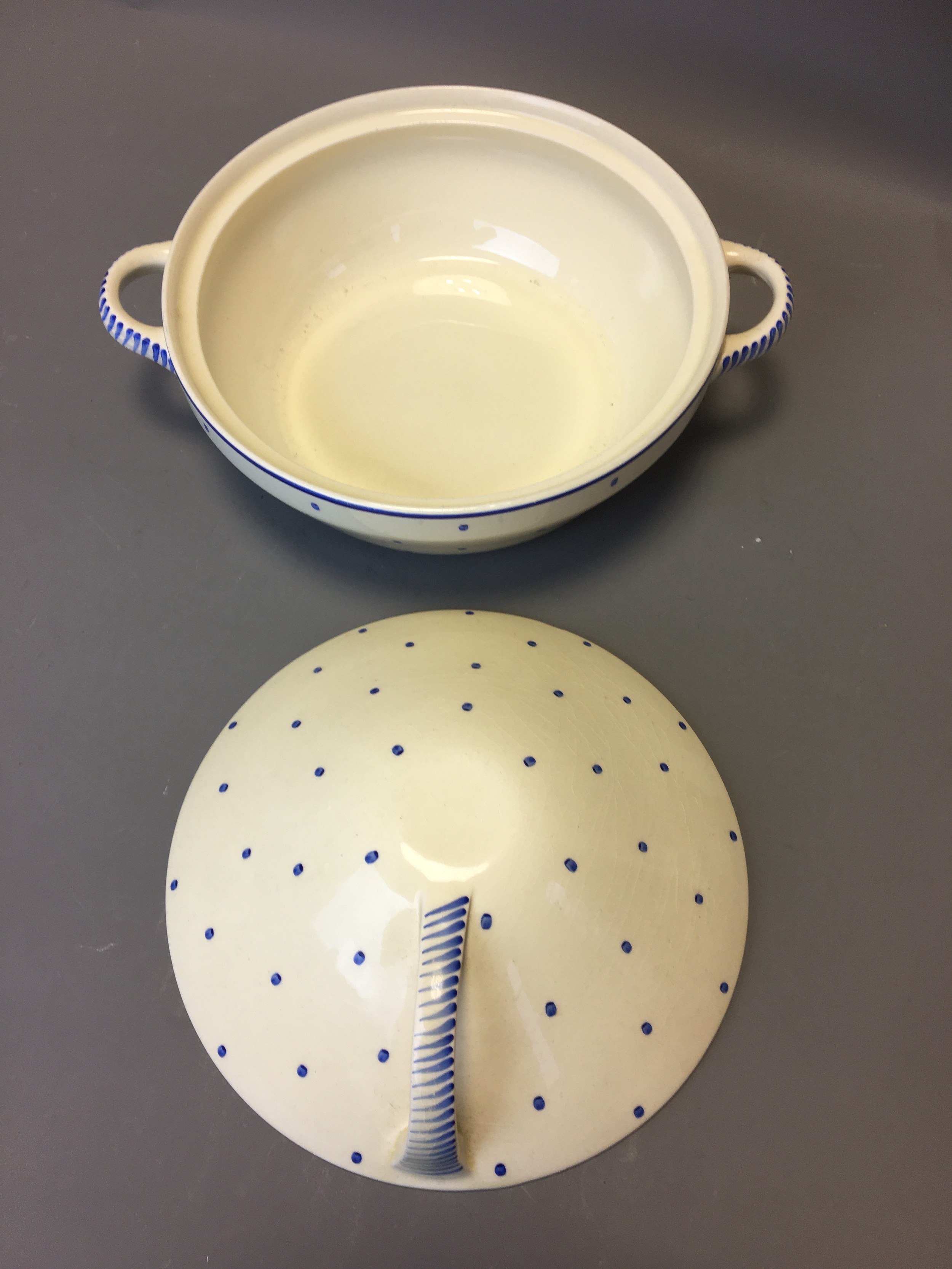 Susie Cooper Crown Works Pottery John Lewis Blue 'Polka Dot' Kestrel Tureen c1935. Marked John Lewis' Polka Dot and registration no. 781918 to the Base.