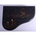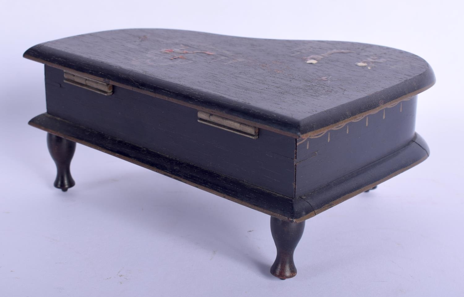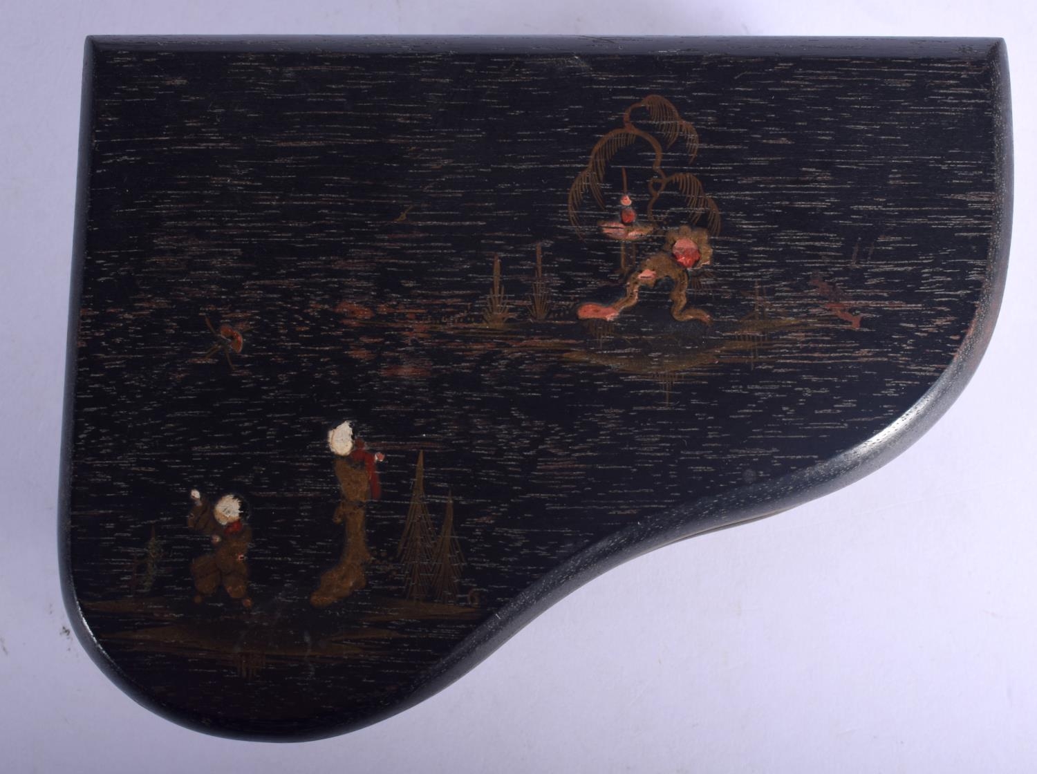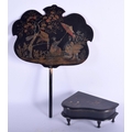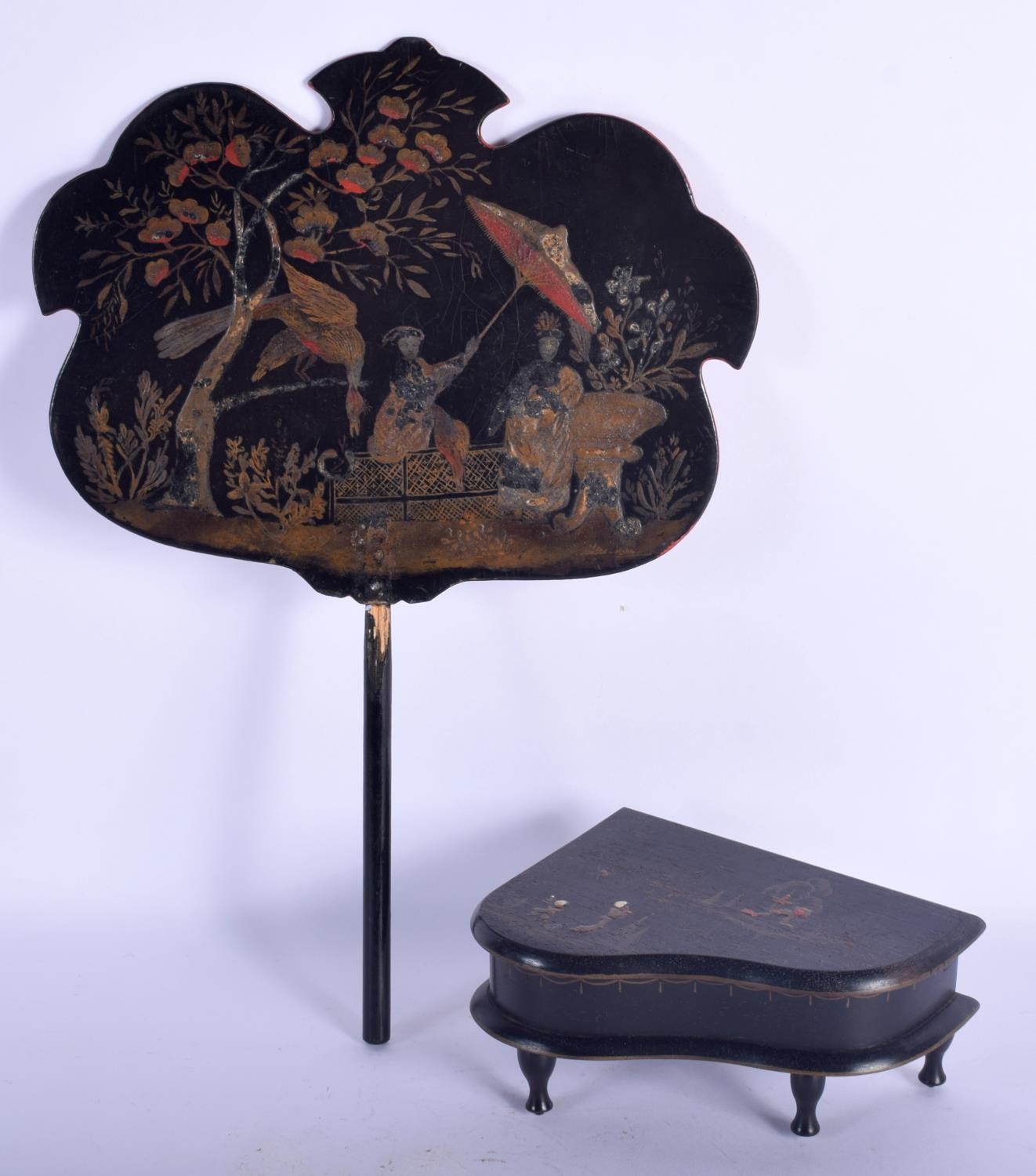 A GEORGE III COUNTRY HOUSE BLACK LACQUER FAN decorated with Chinese figures, together with a painted Edwardian jewellery box piano. Largest 34 cm x 22 cm.