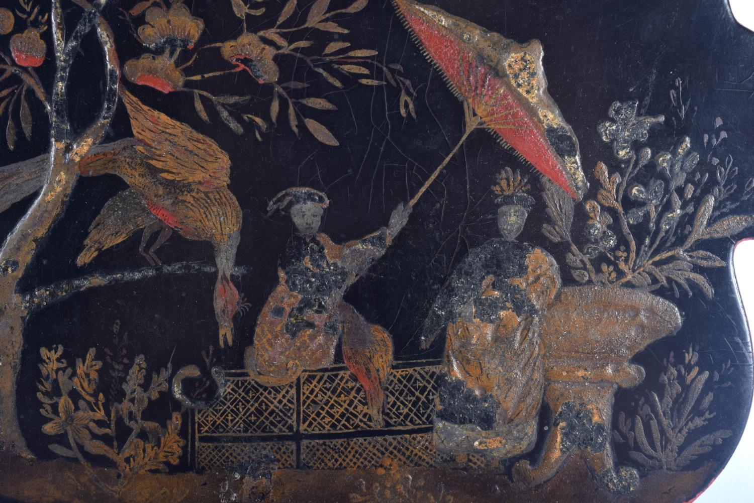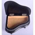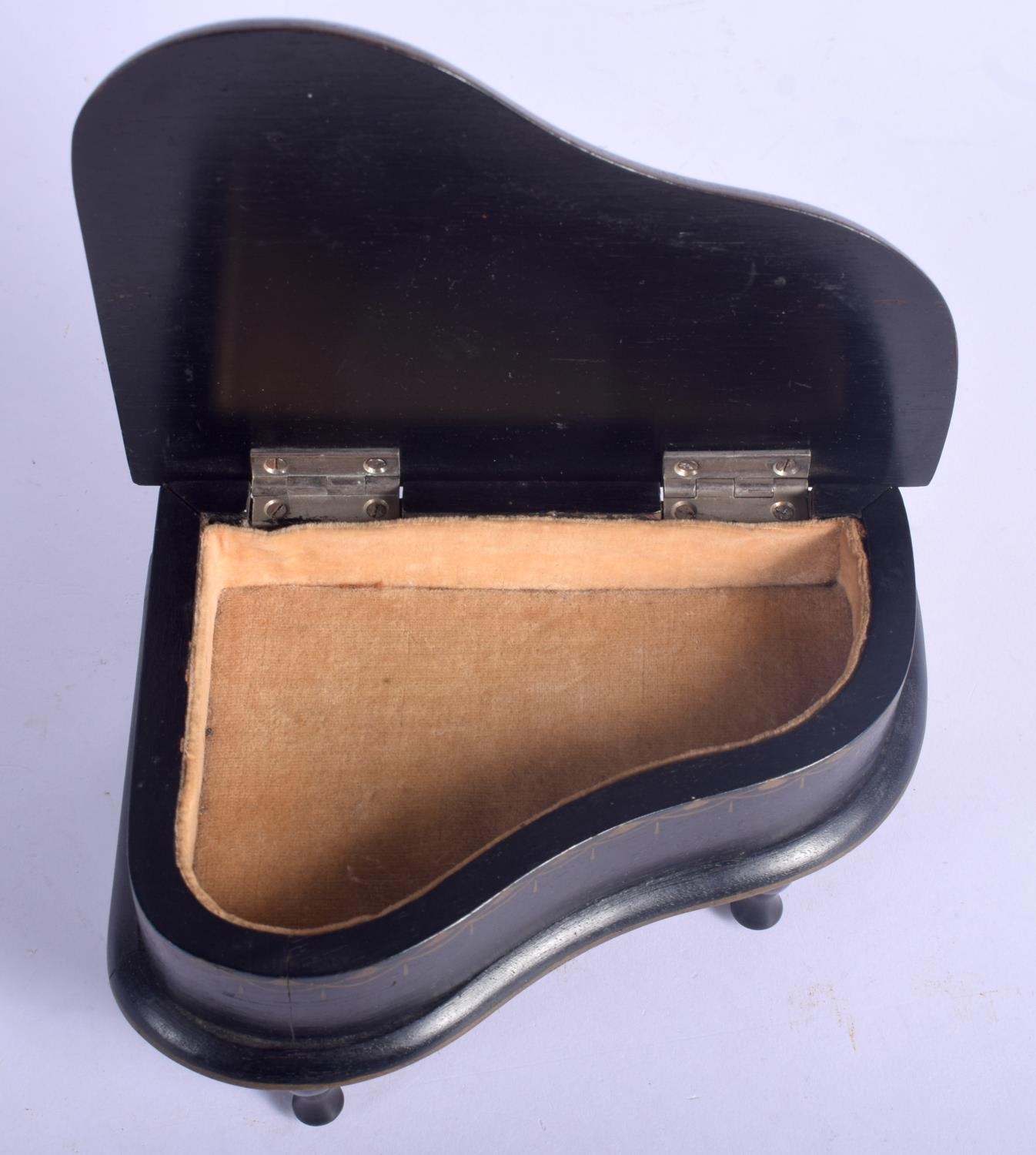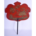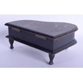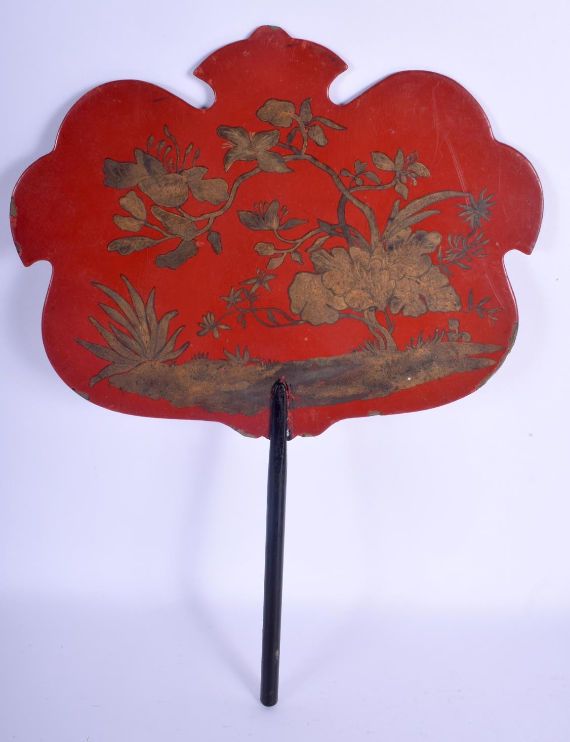 A GEORGE III COUNTRY HOUSE BLACK LACQUER FAN decorated with Chinese figures, together with a painted Edwardian jewellery box piano. Largest 34 cm x 22 cm.