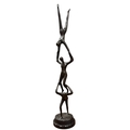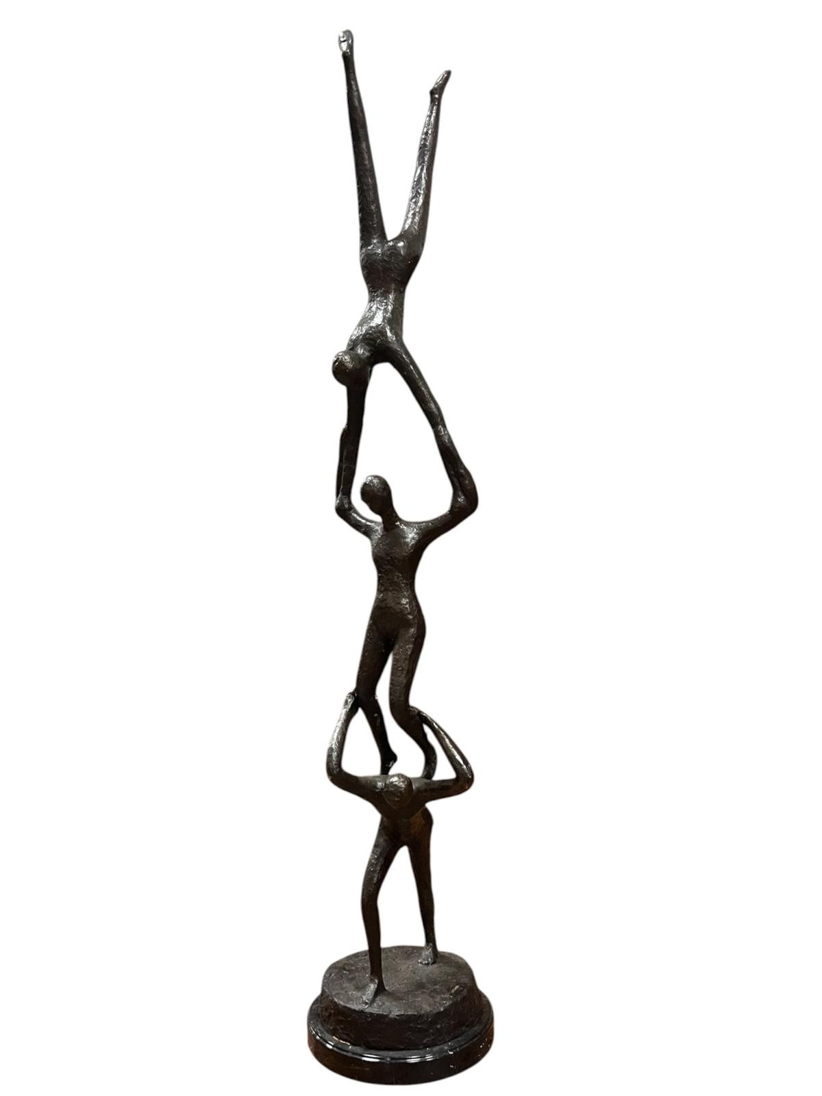 after LARSON A cast bronze sculpture modelled as three acrobats, signed, raised on a black veined circular marble base 159cm (h)
