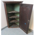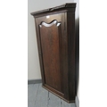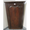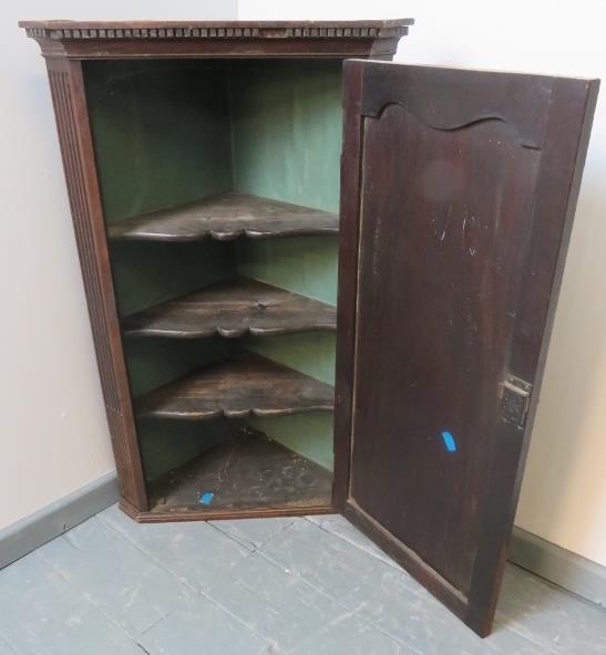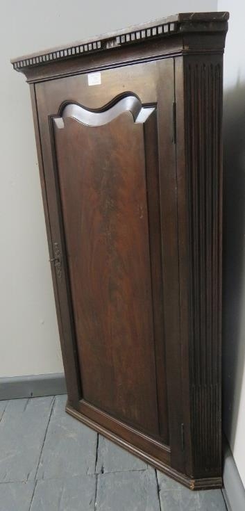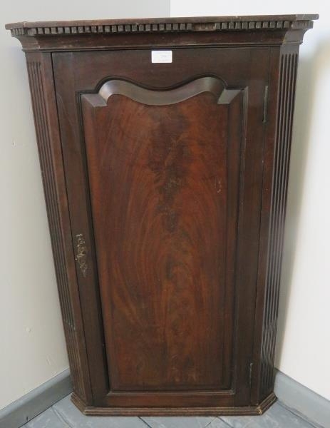 A Georgian mahogany wall hanging corner cupboard with dentil cornice, flanked by reeded columns, housing 3 fitted shelves.