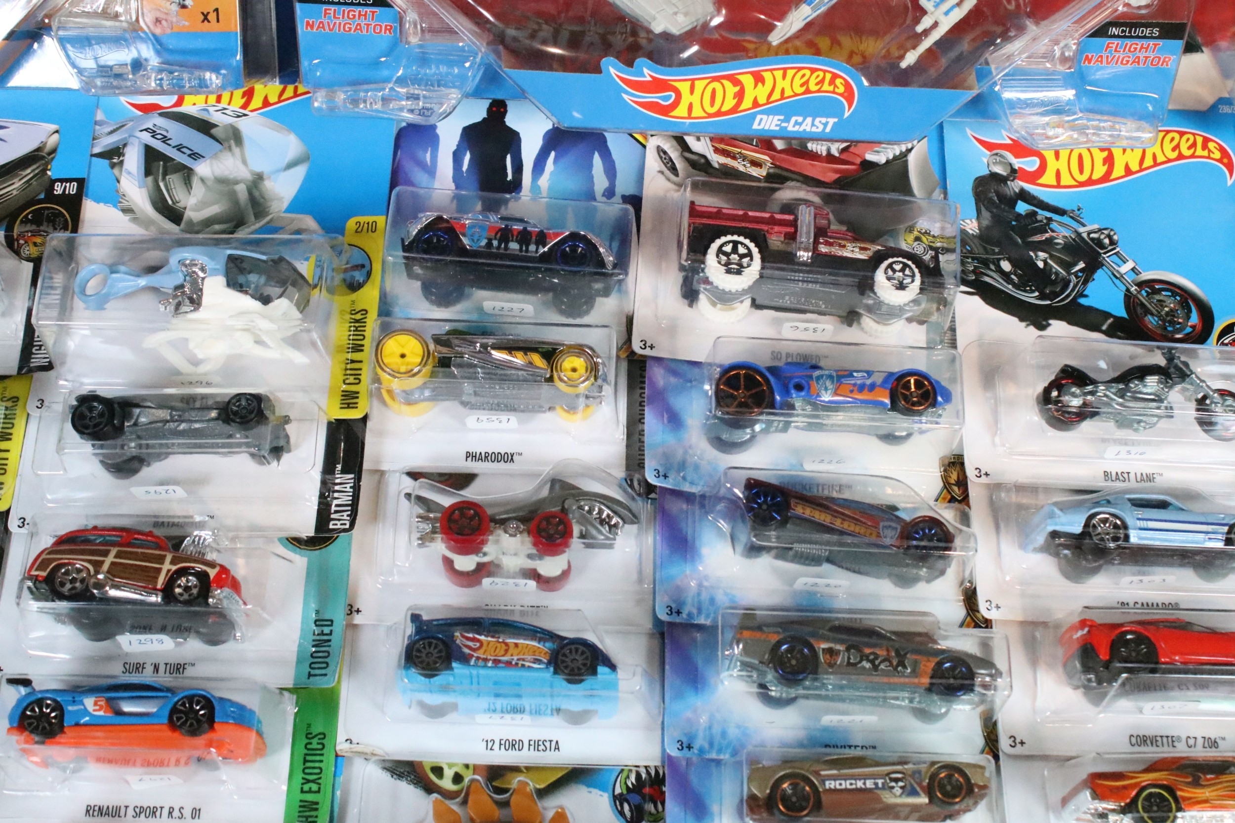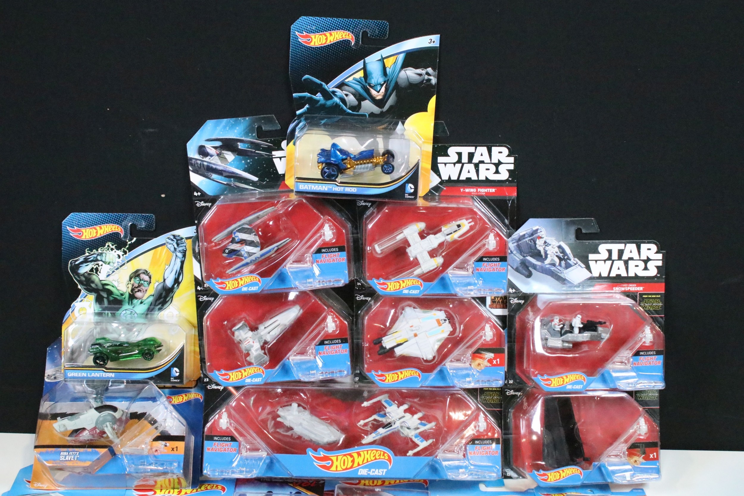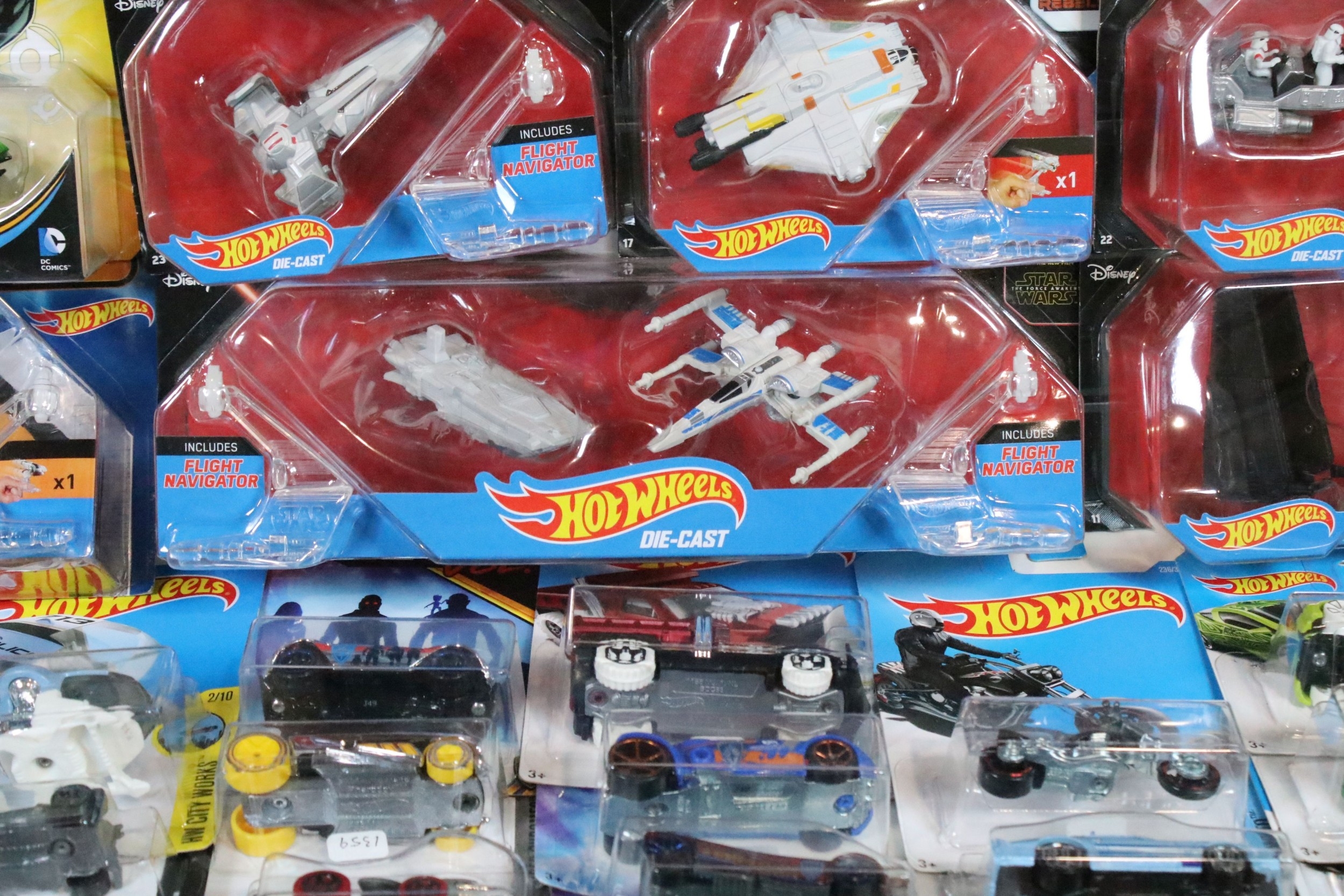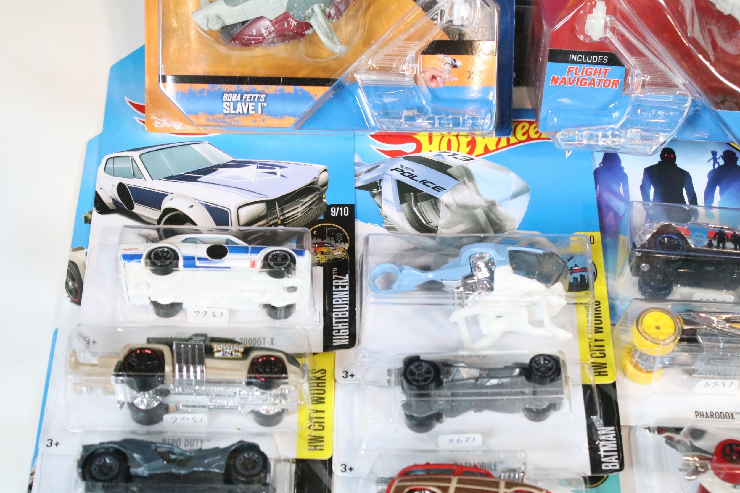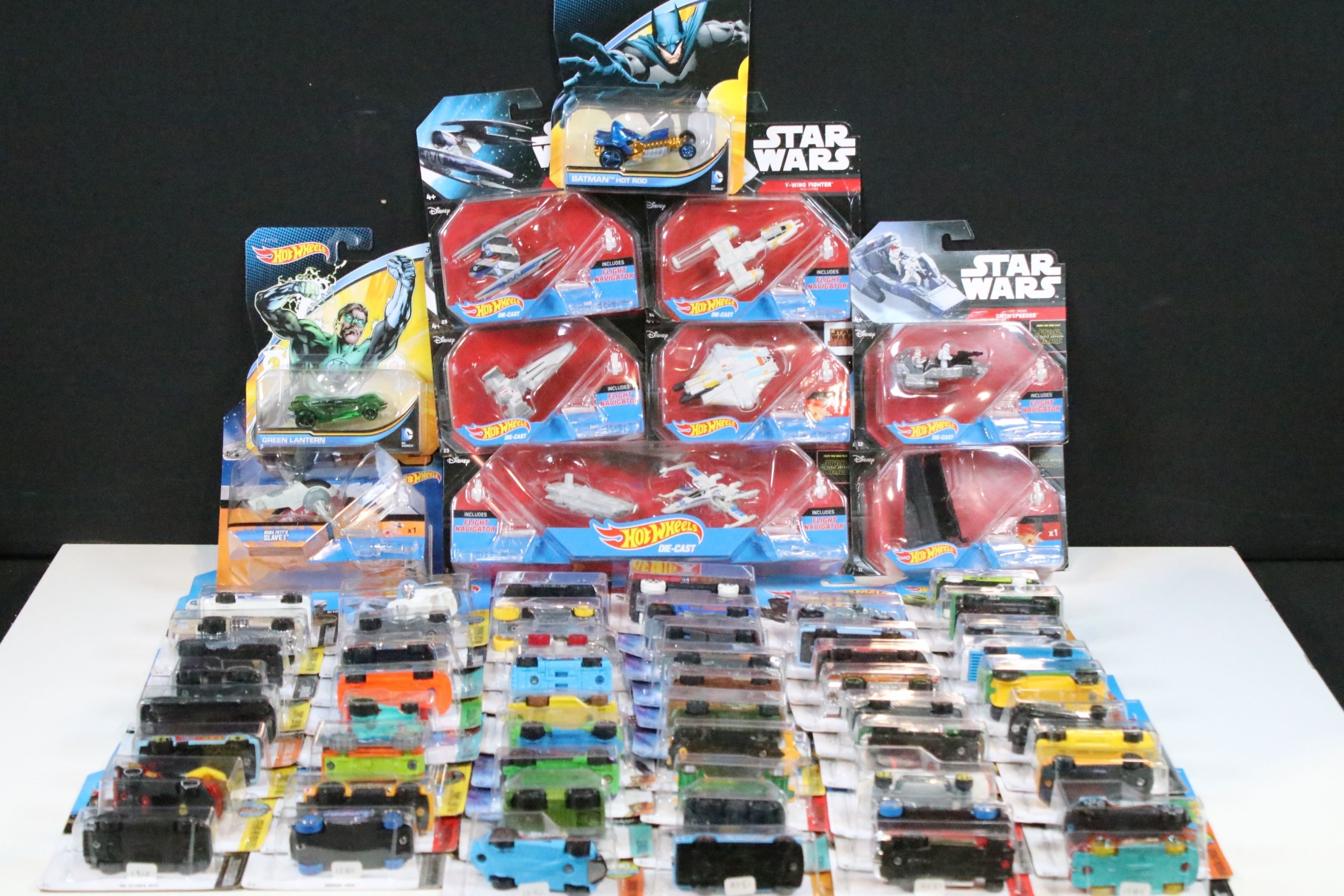 Around 105 boxed / carded Mattel Hot Wheels diecast models to include Star Wars, Marvel Guardians Of The Galaxy Vol.2, DC Comics Batman, Legends Of Speed, etc, all ex