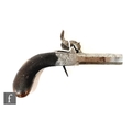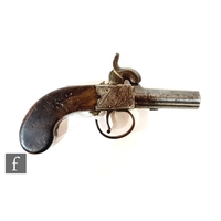 A small 19th Century percussion muff pistol, engraved action, unnamed, chequered butt, 4.5cm octagonal barrel.