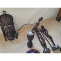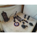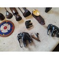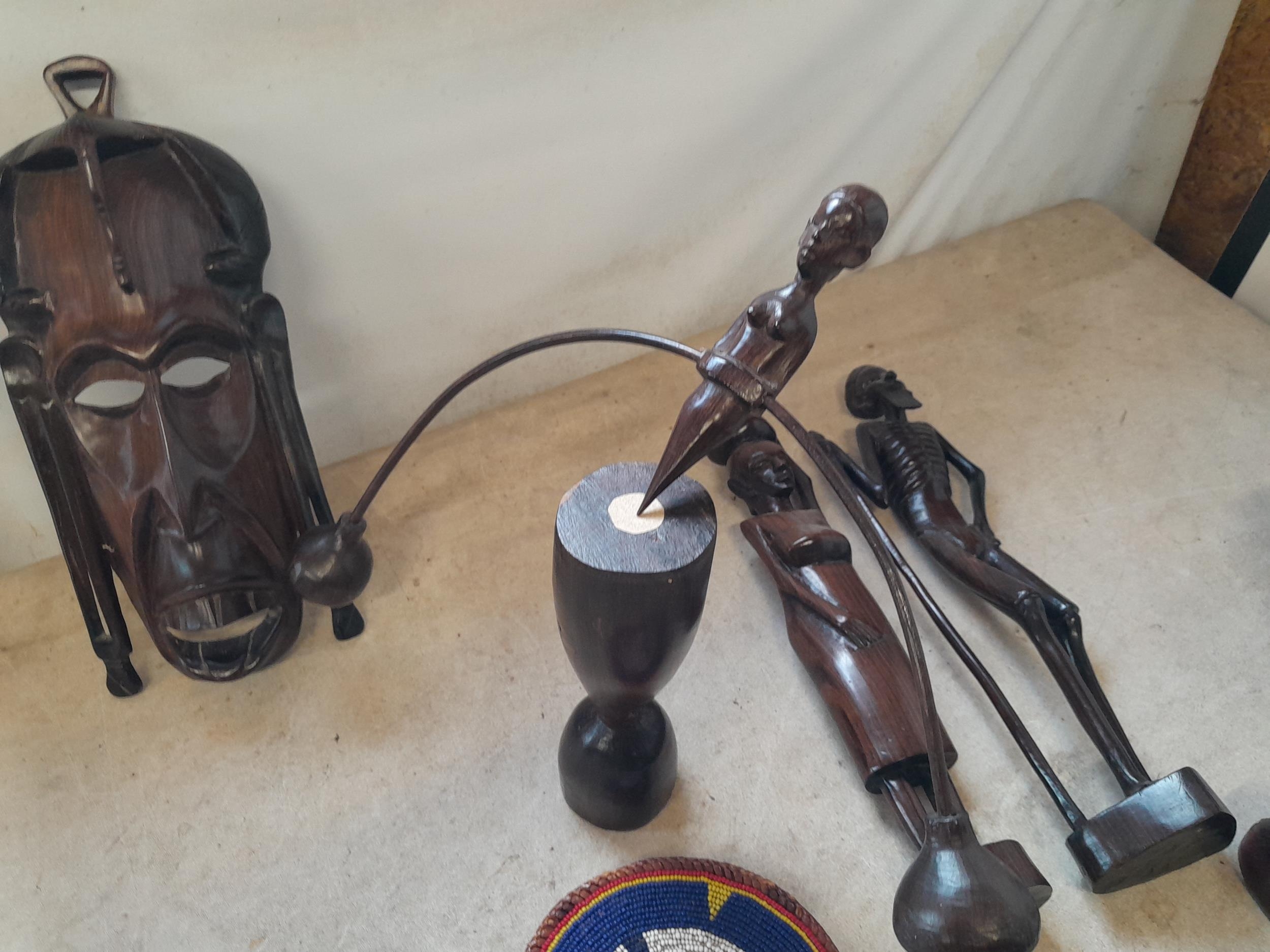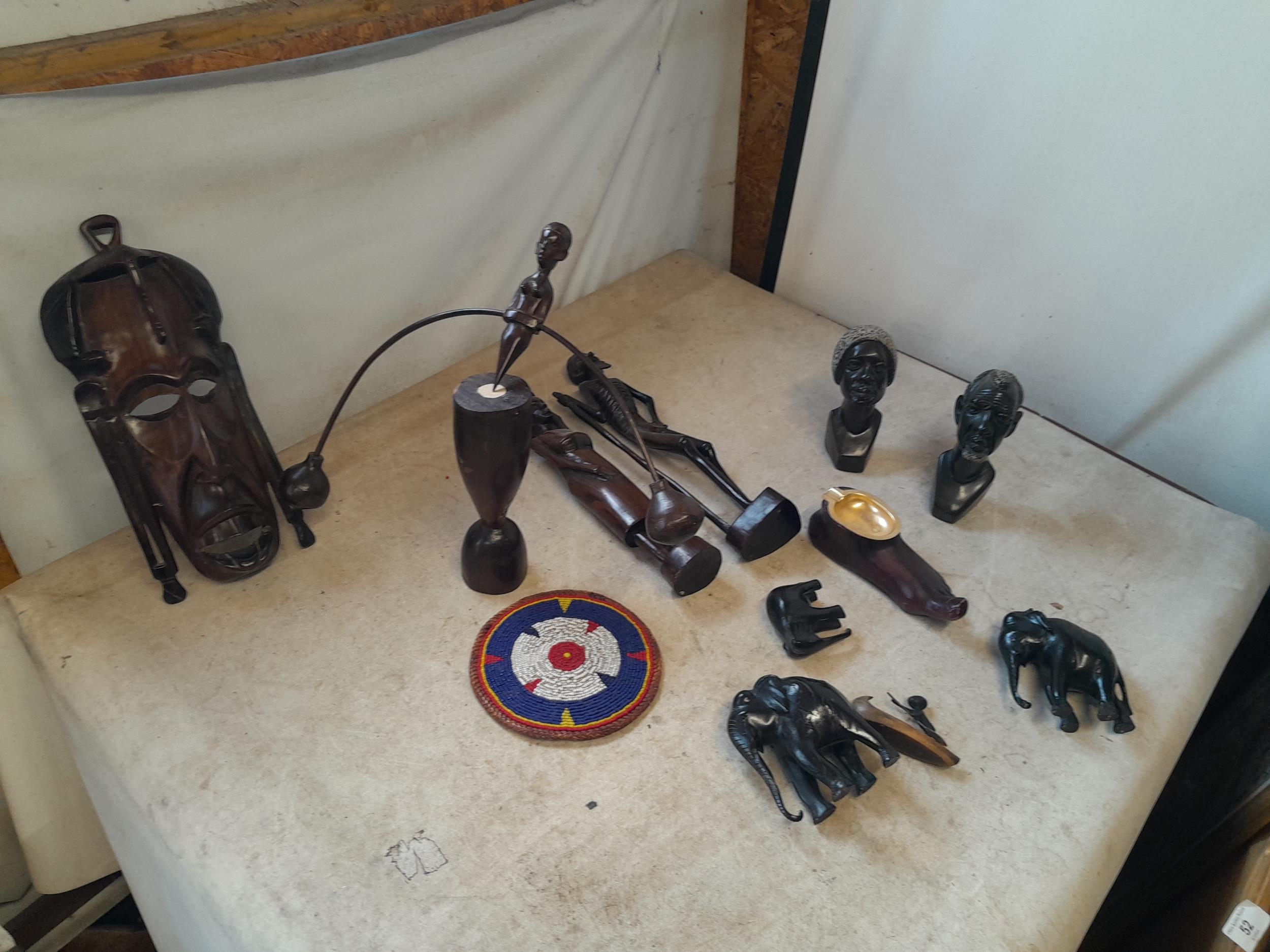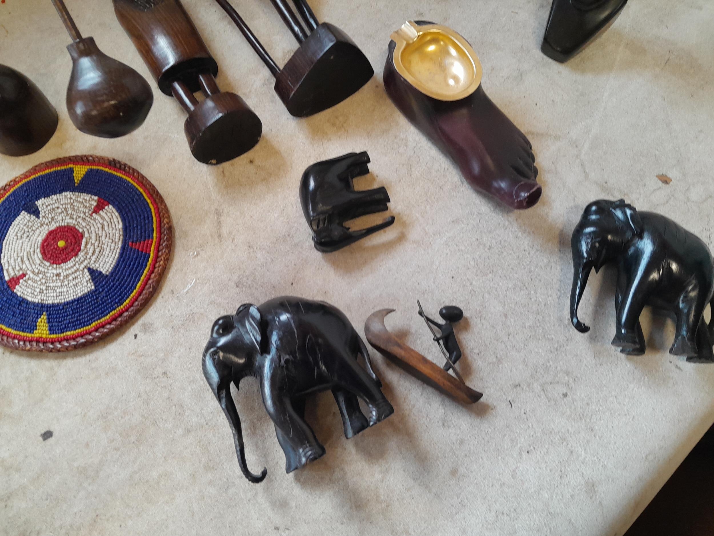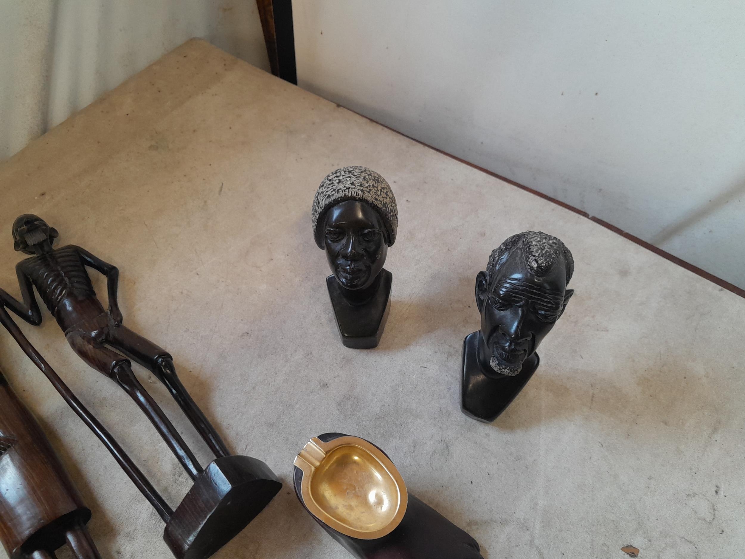 Collection of mid 20th century African Art : wood carvings , pair of Shona carved stone busts, coasters and related items