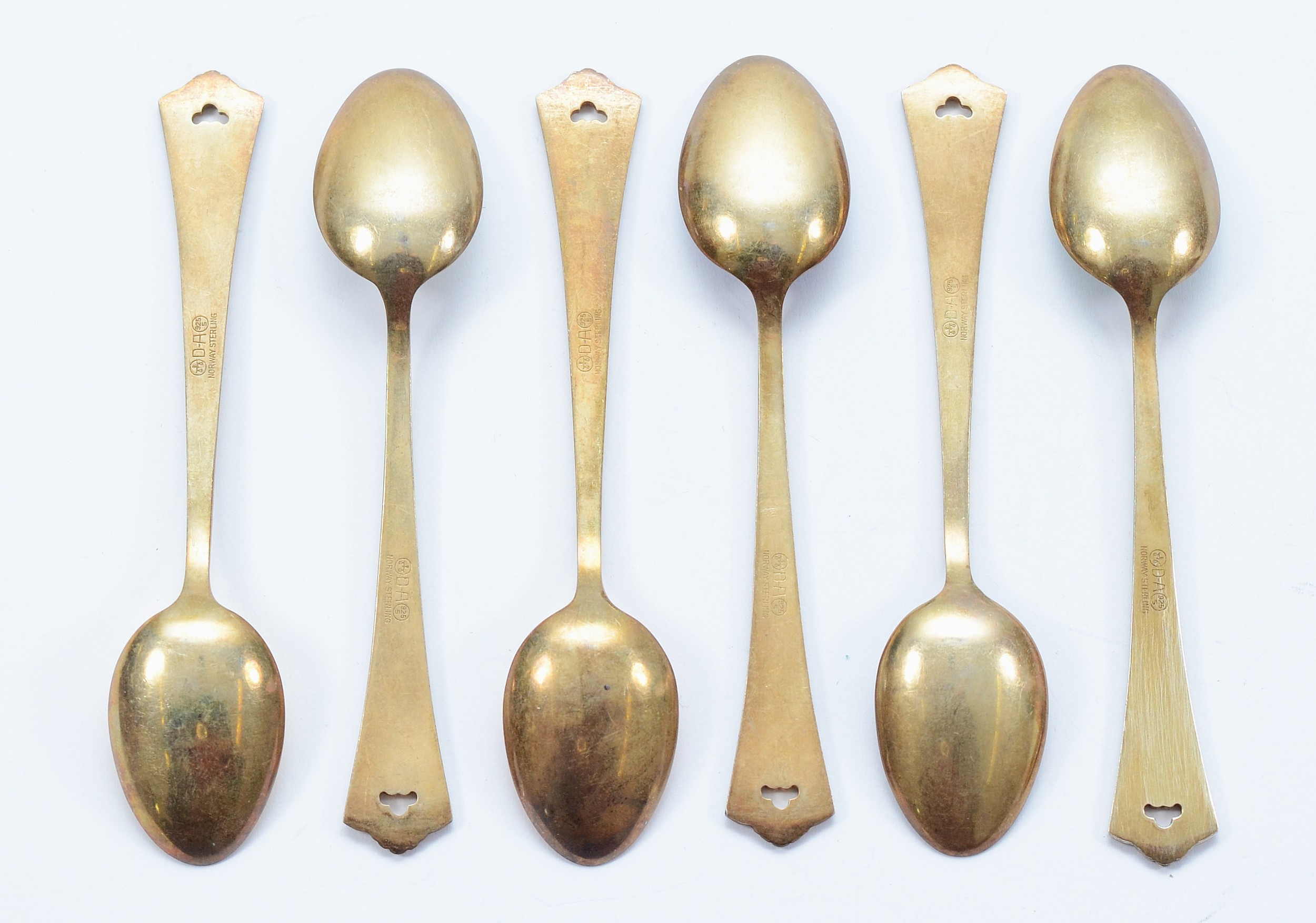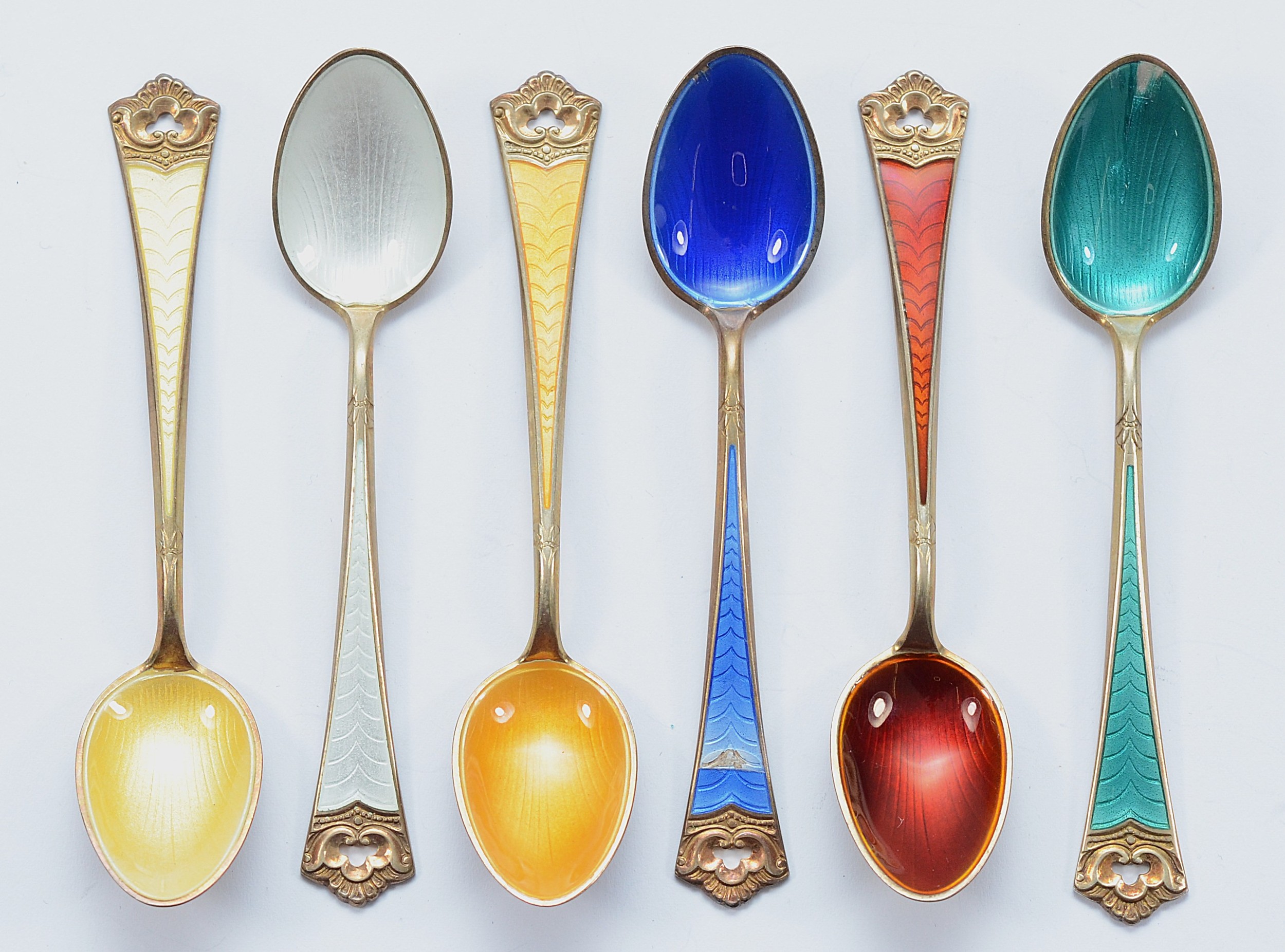 A set of six Norwegian silver gilt and enamel coffee spoons, by David Anderson, 67gm.