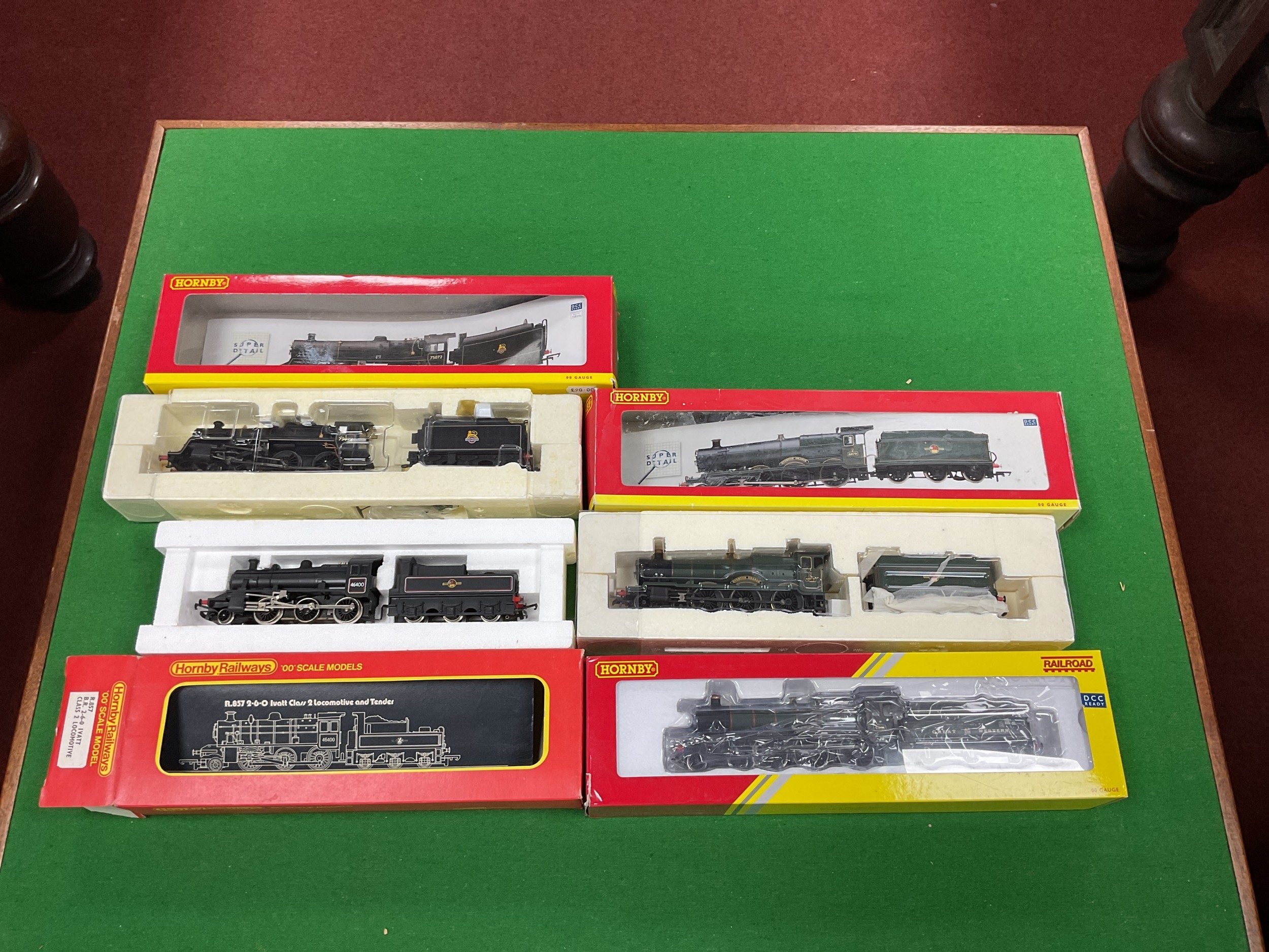 Four Hornby 'OO' Gauge/4mm Boxed Steam Tender Locomotives, Ref No R857 2-6-0 Ivatt Class 2, Ref R2502 4-6-0 Grange Class "Overton Grange" - DCC ready; Ref R3016 4-6-0 Class 4MT with R/No 75072 - DCC ready and Ref R3170 GWR Class 4900 GW green "Adderley Hall" R/No 4901 - DCC ready, overall untested condition very good, boxes very good.