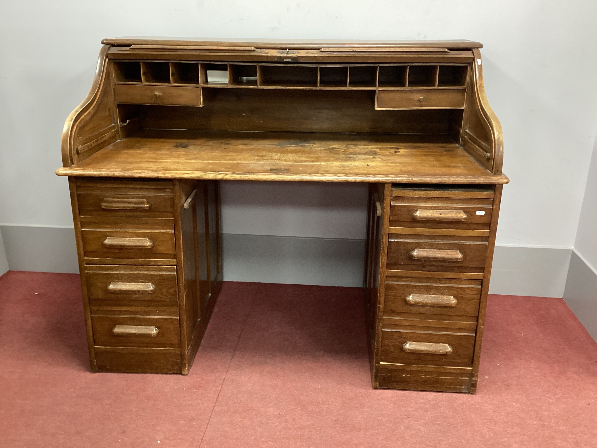 An Early XX Century Oak Roll Top Desk, with tambour fall to fitted interior, twin pedestals each with four drawers.