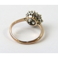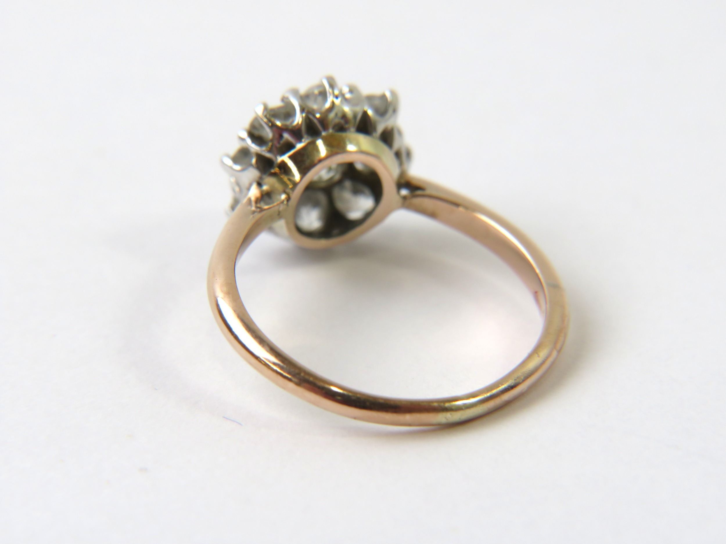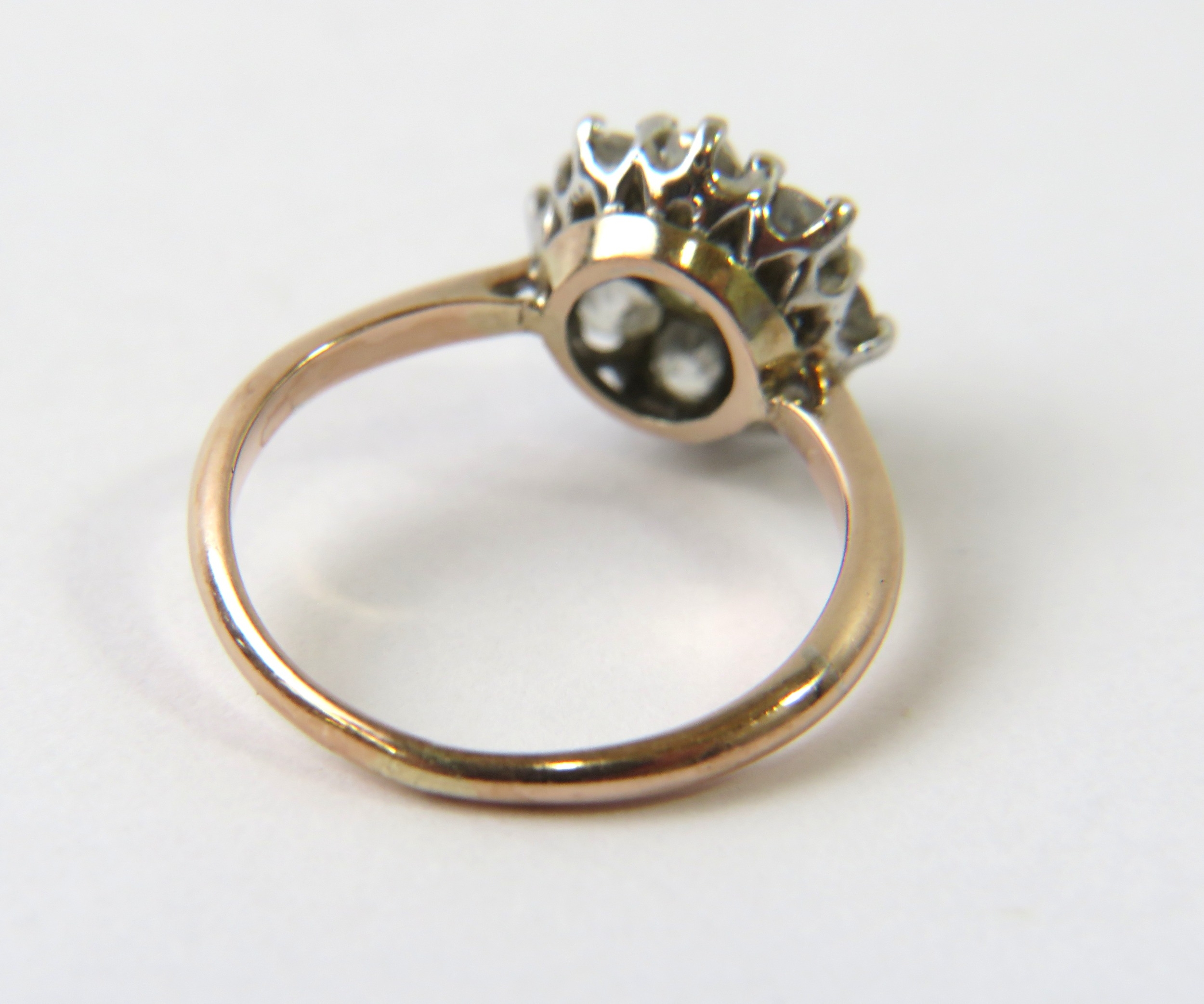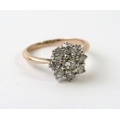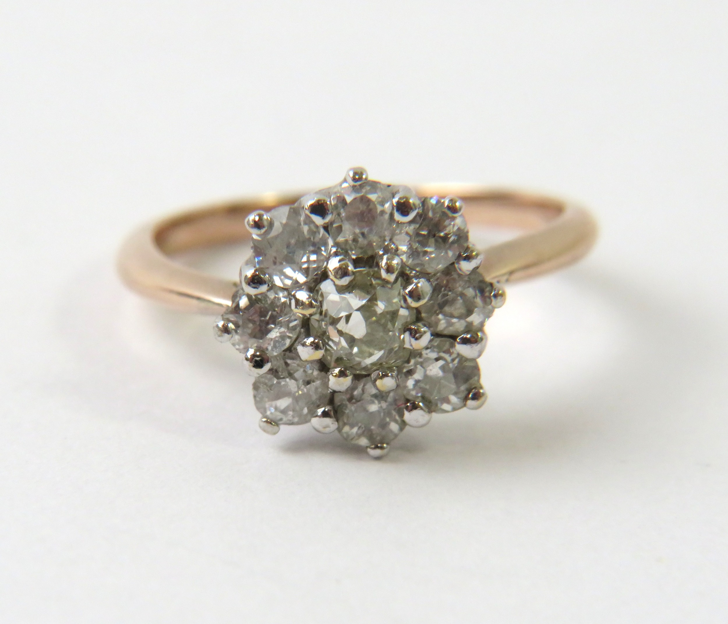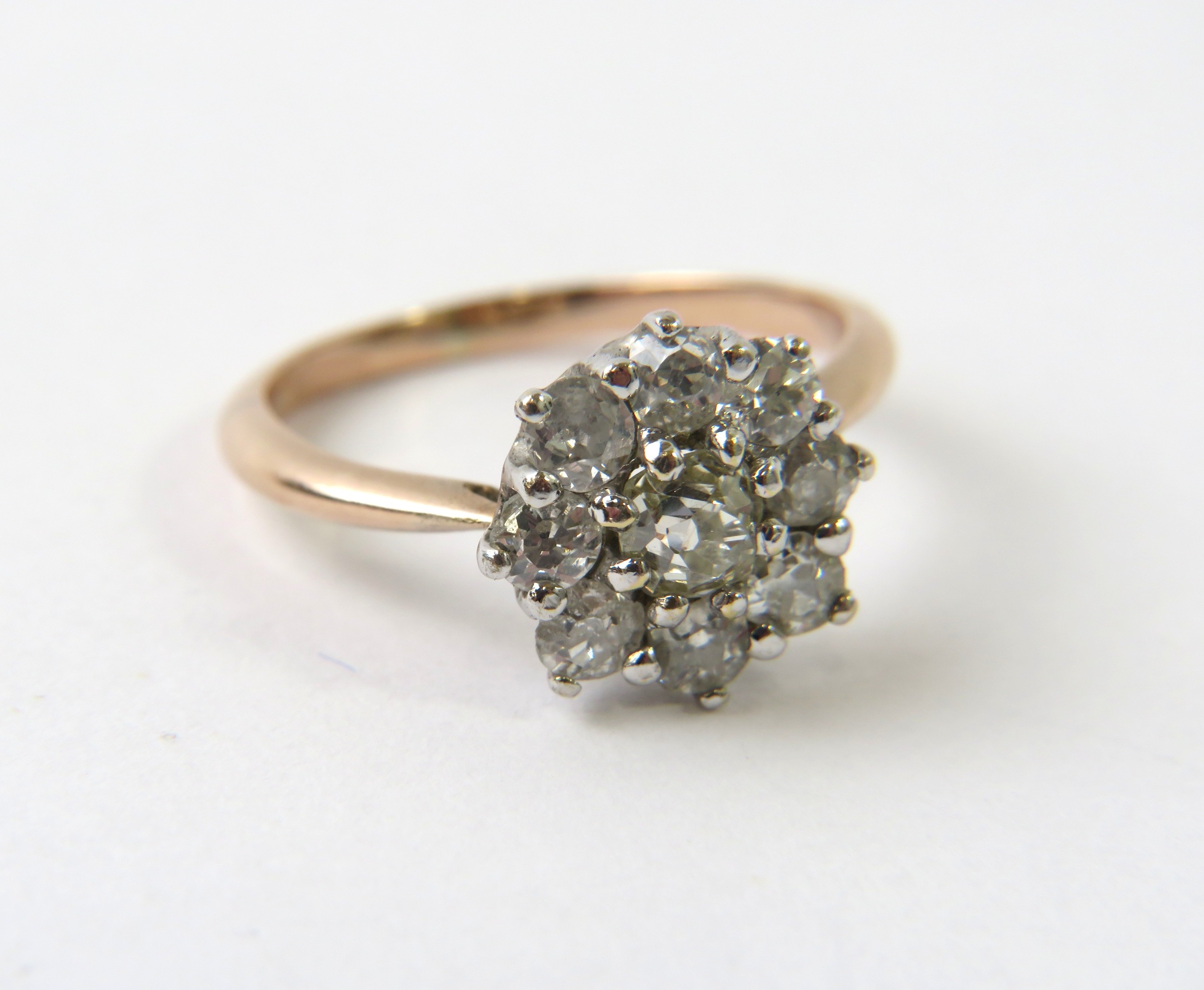 A diamond cluster ring set with 9 old cut diamonds, the yellow shank Kee surface testing as 9ct, 2.2g