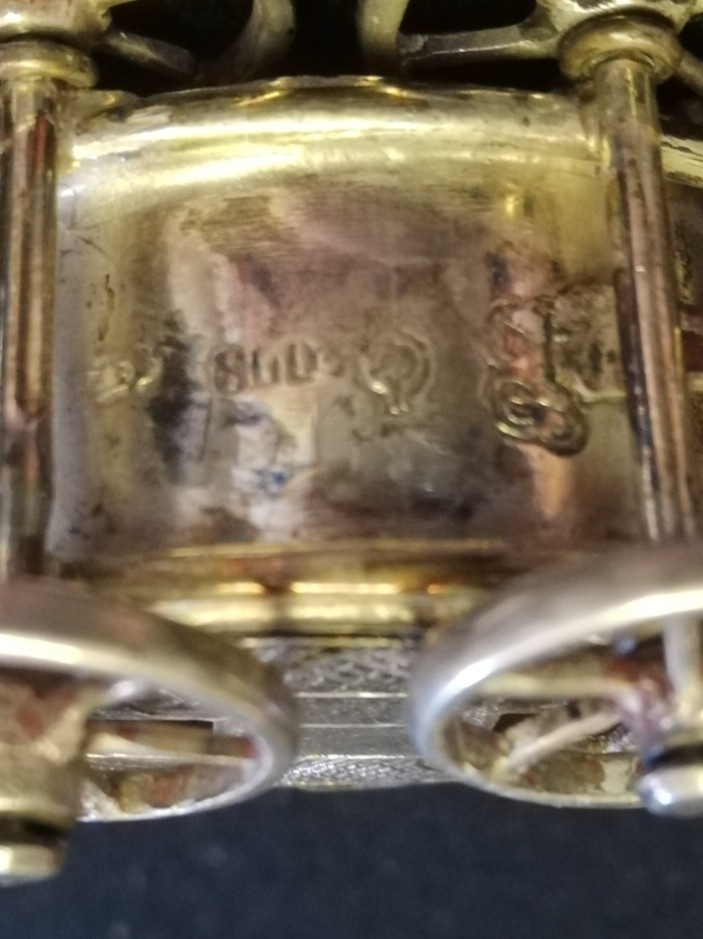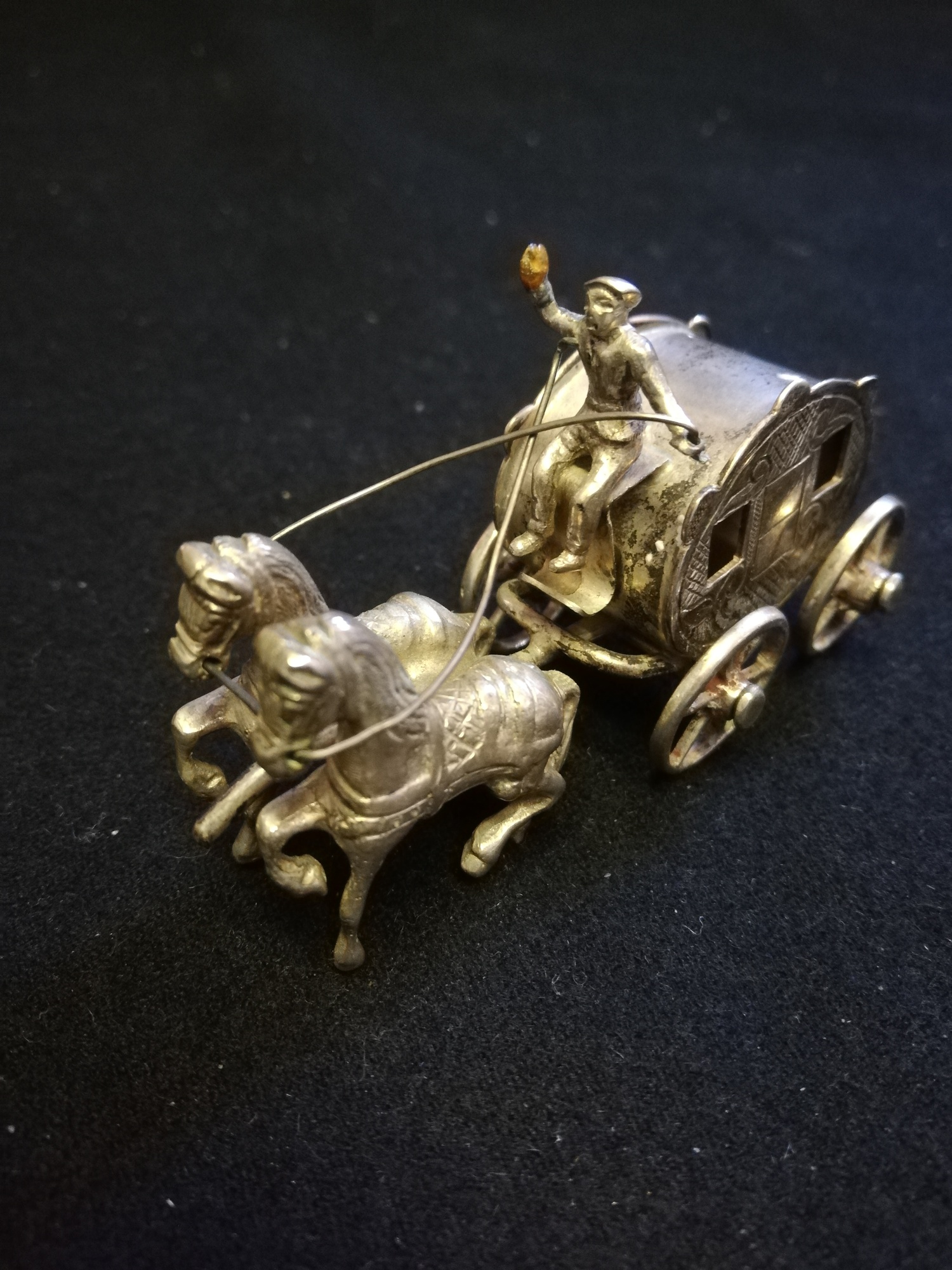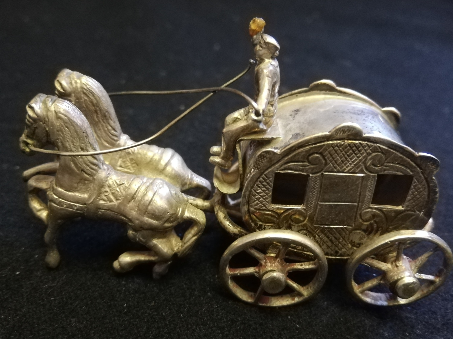 Silver 800 hallmarked miniature model of a horses & carriage - length 2¾" & 67g-drivers hand as found
