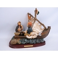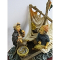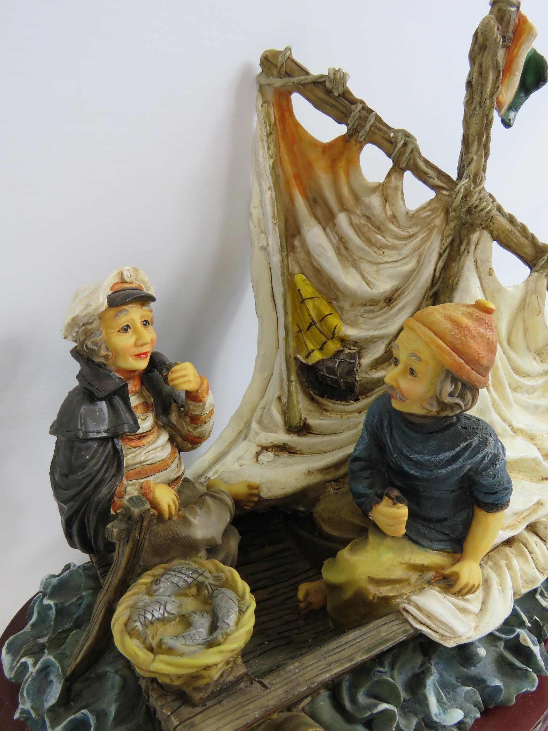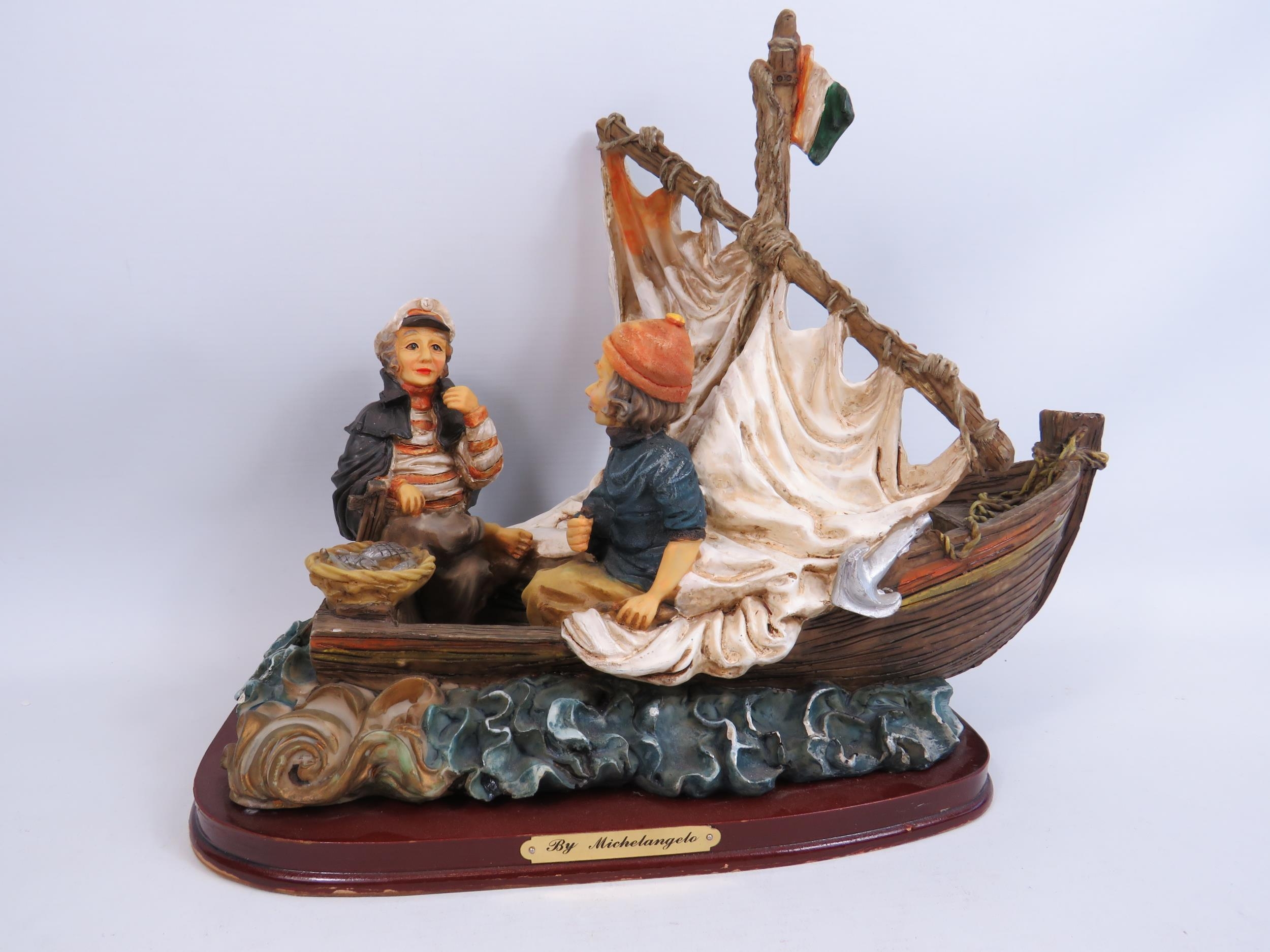 Resin sculpture of a boat and fishermen. Aprrox 28cm tall and 34cm long.
