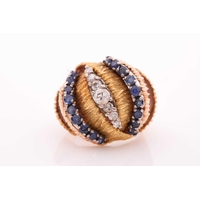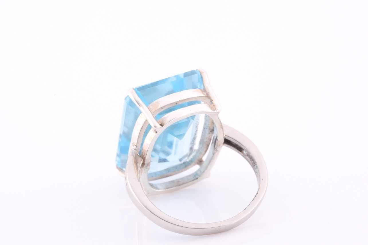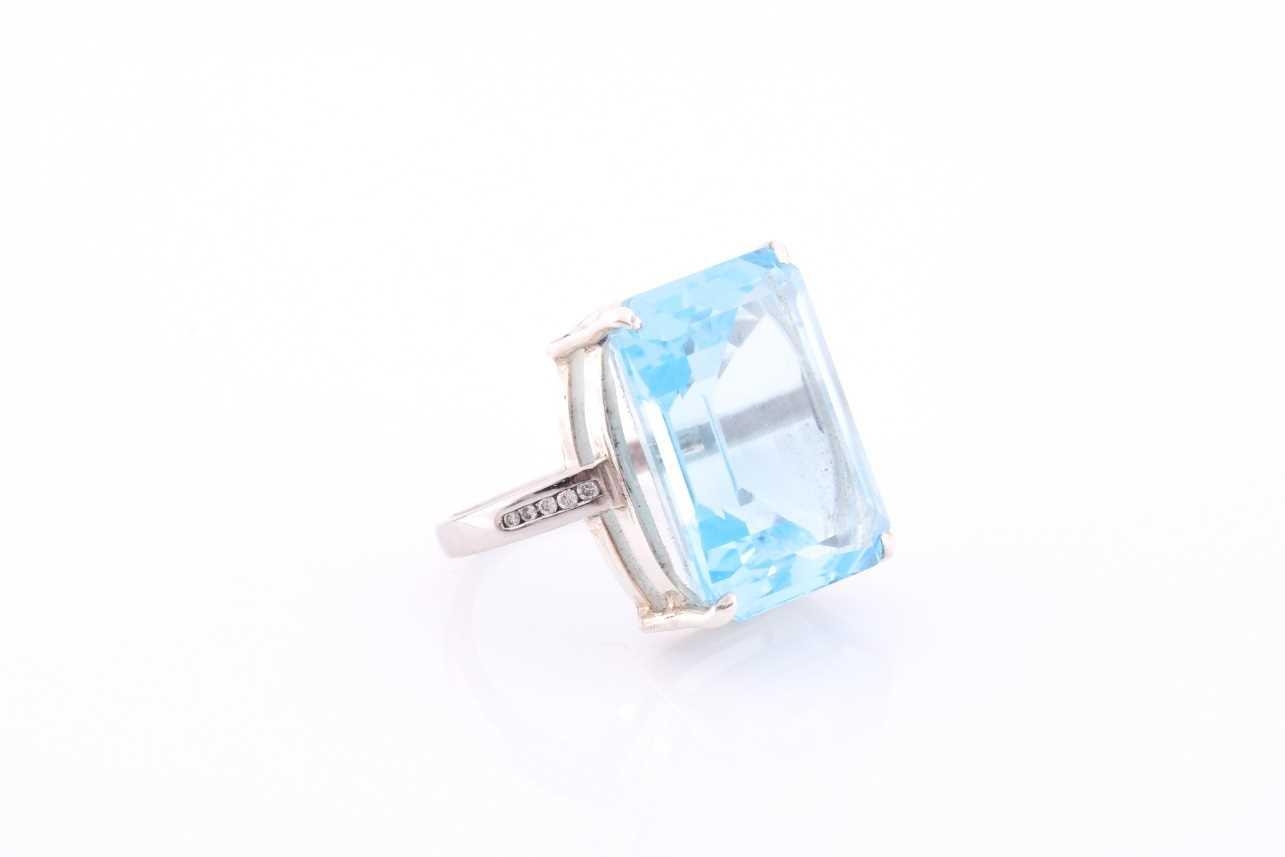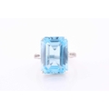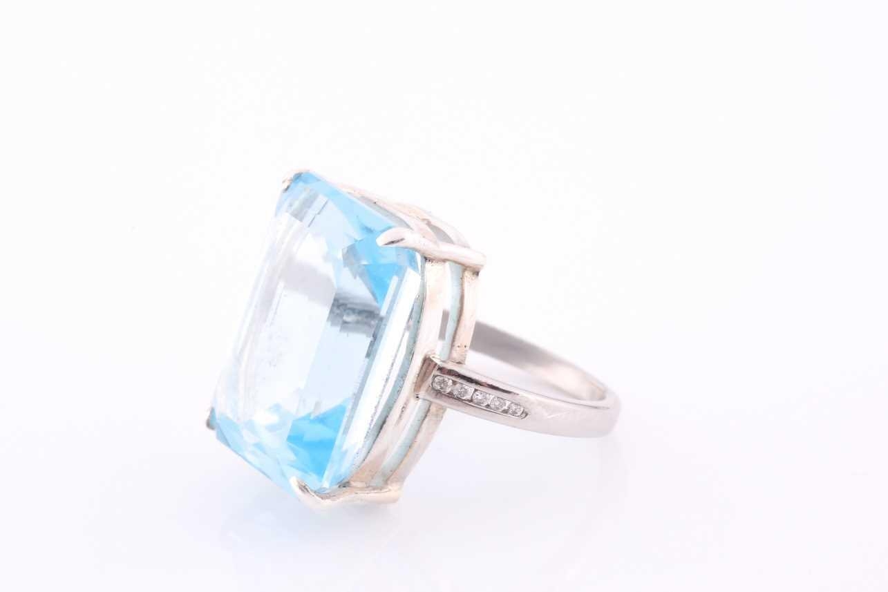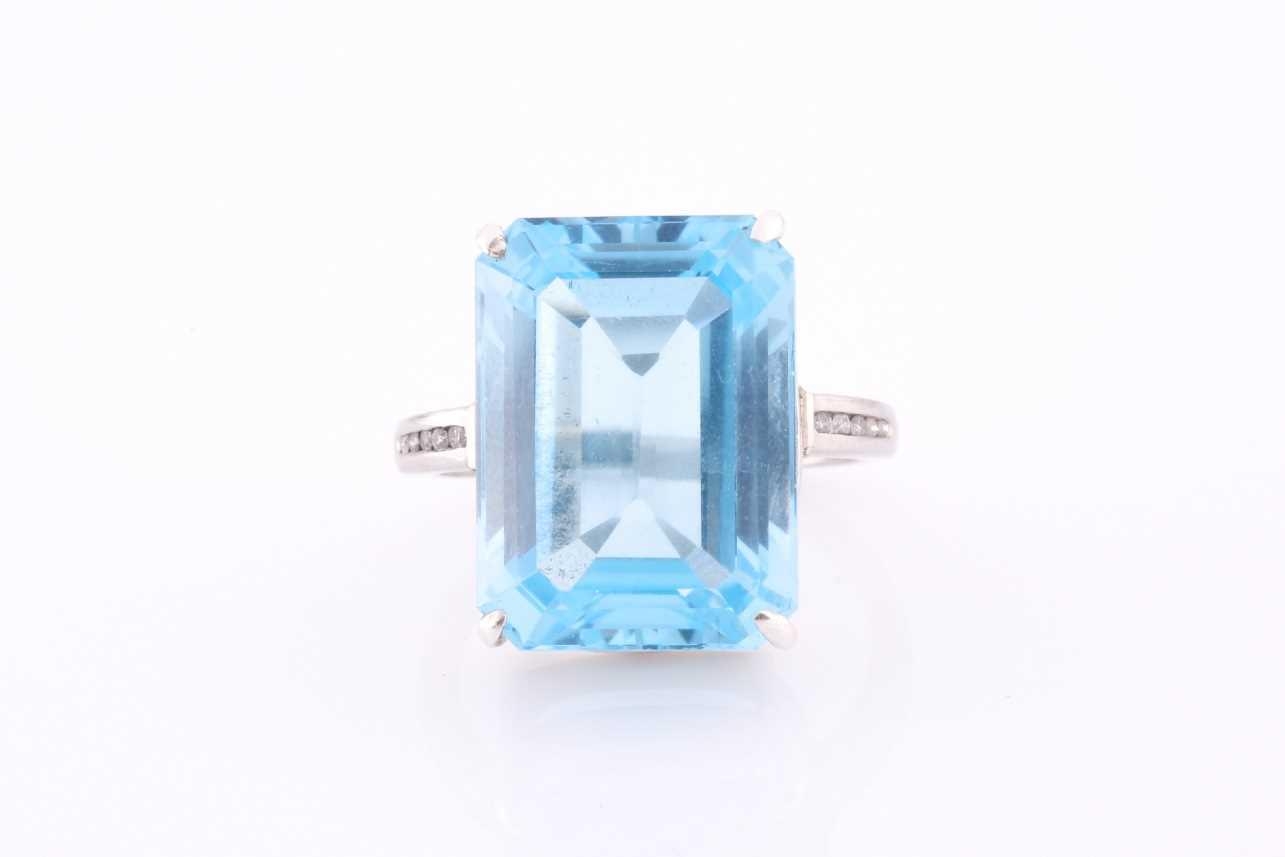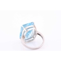 A platinum, blue topaz and diamond dress ring, set with a mixed rectangular-cut topaz, of approximately 2.2 x 1.64 cm, the shoulders channel-set with diamonds, size Q, 16 grams.
