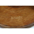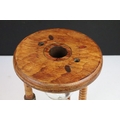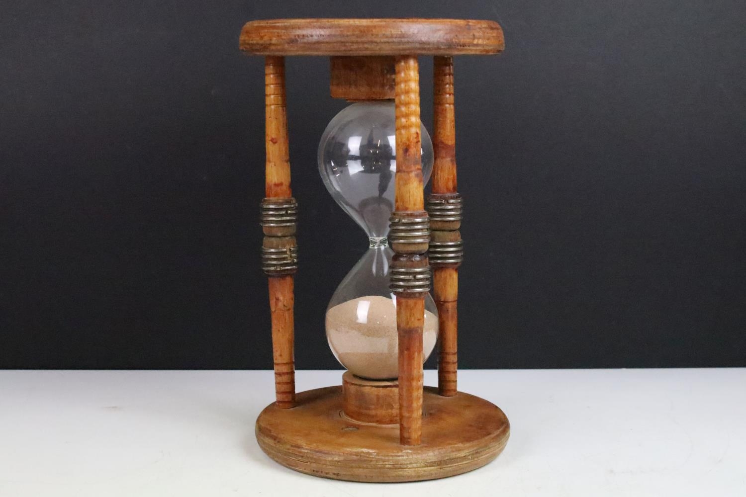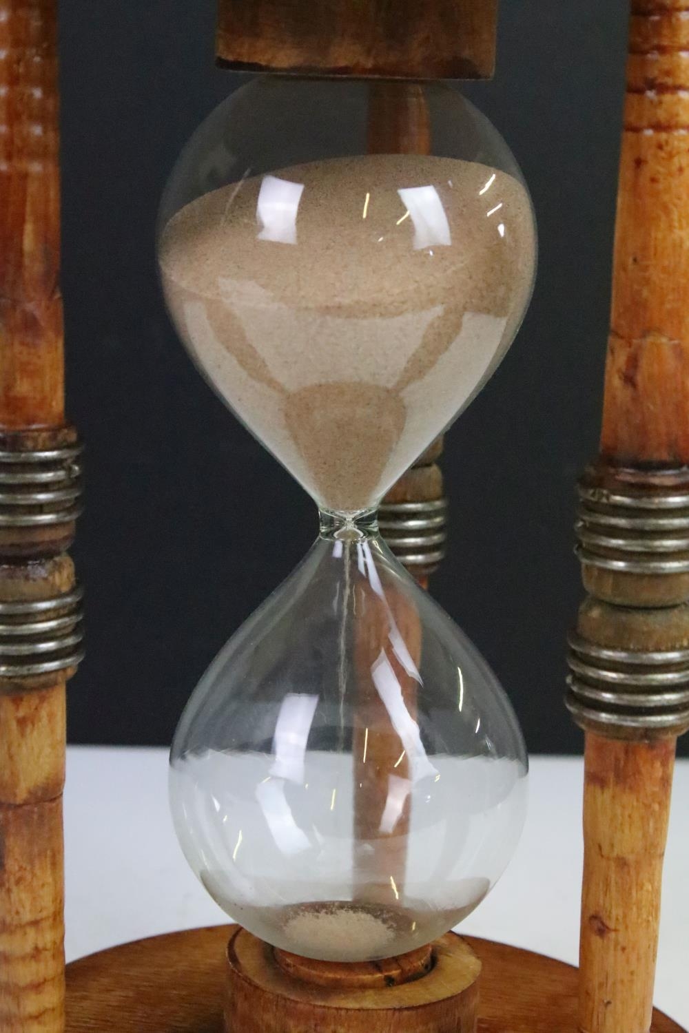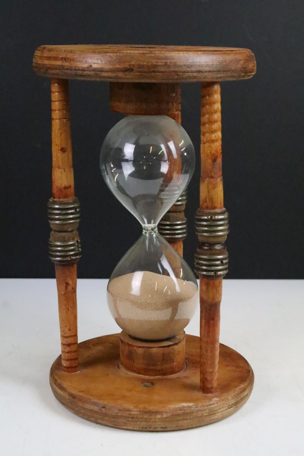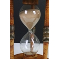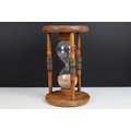 Large glass egg timer, the frame formed from an old wooden weaving bobbin, 30cm high