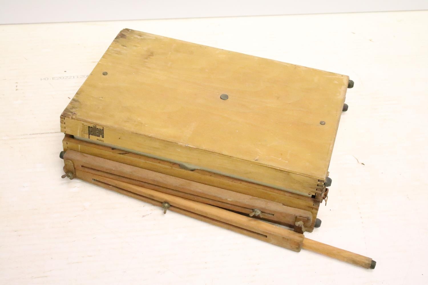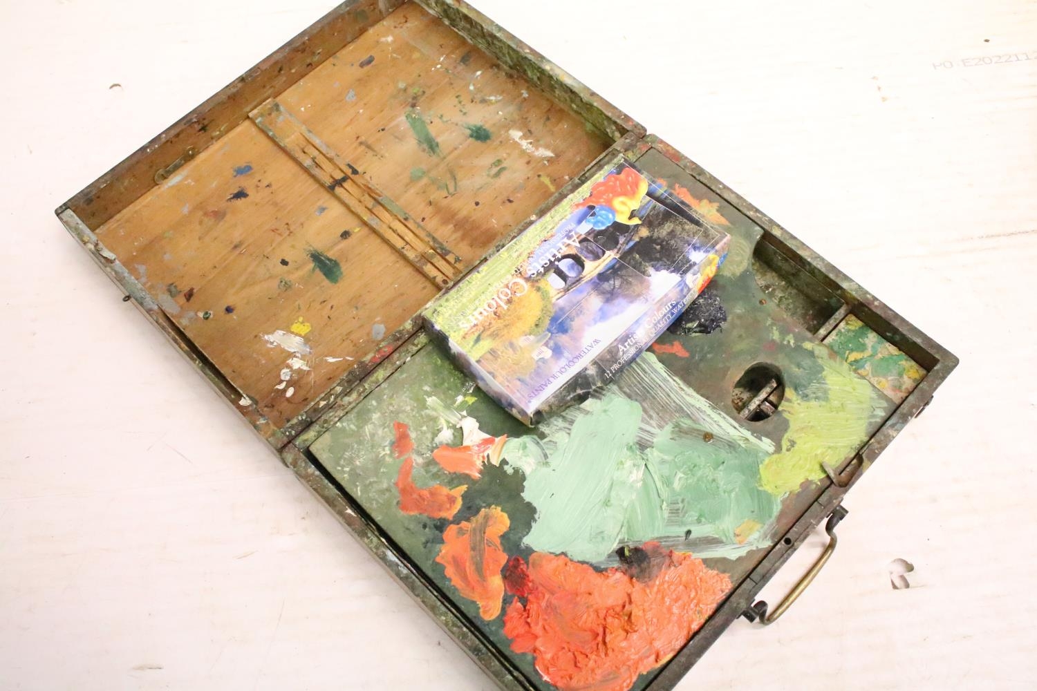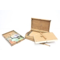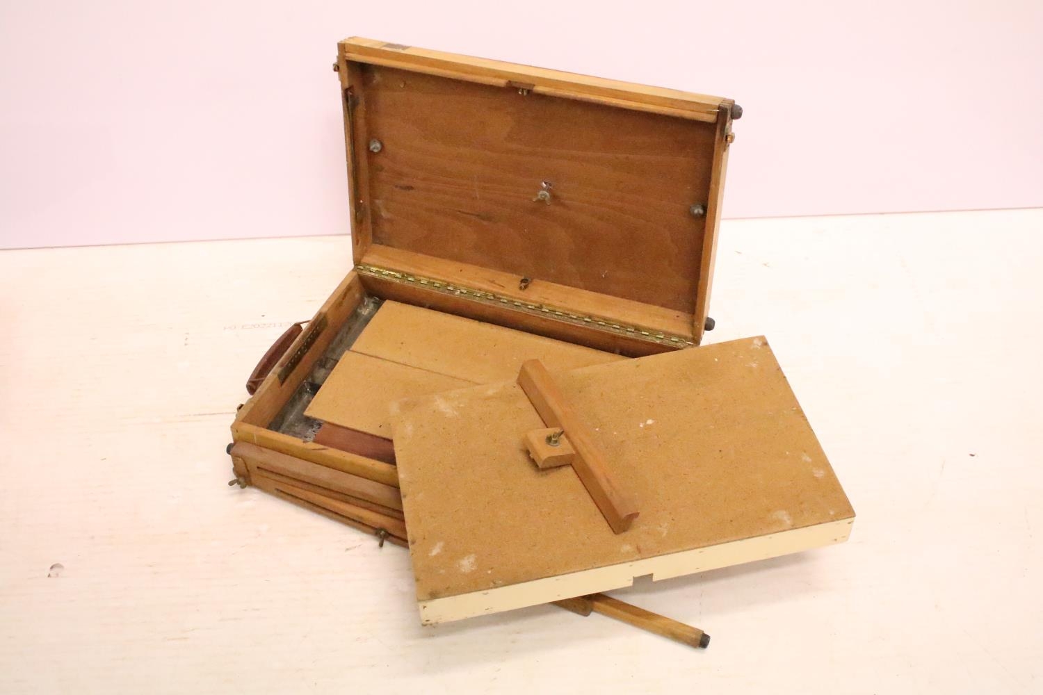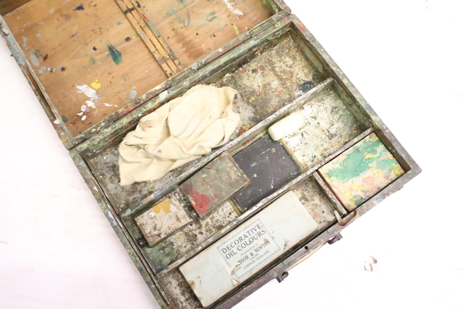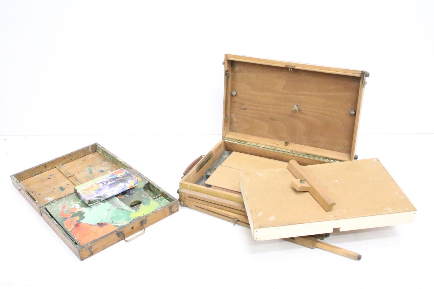Vintage art box housing Winsor & Newton oil colours set, a further paint set and palette (box measures approx 36.5cm wide), together with an artists travel easel . art box