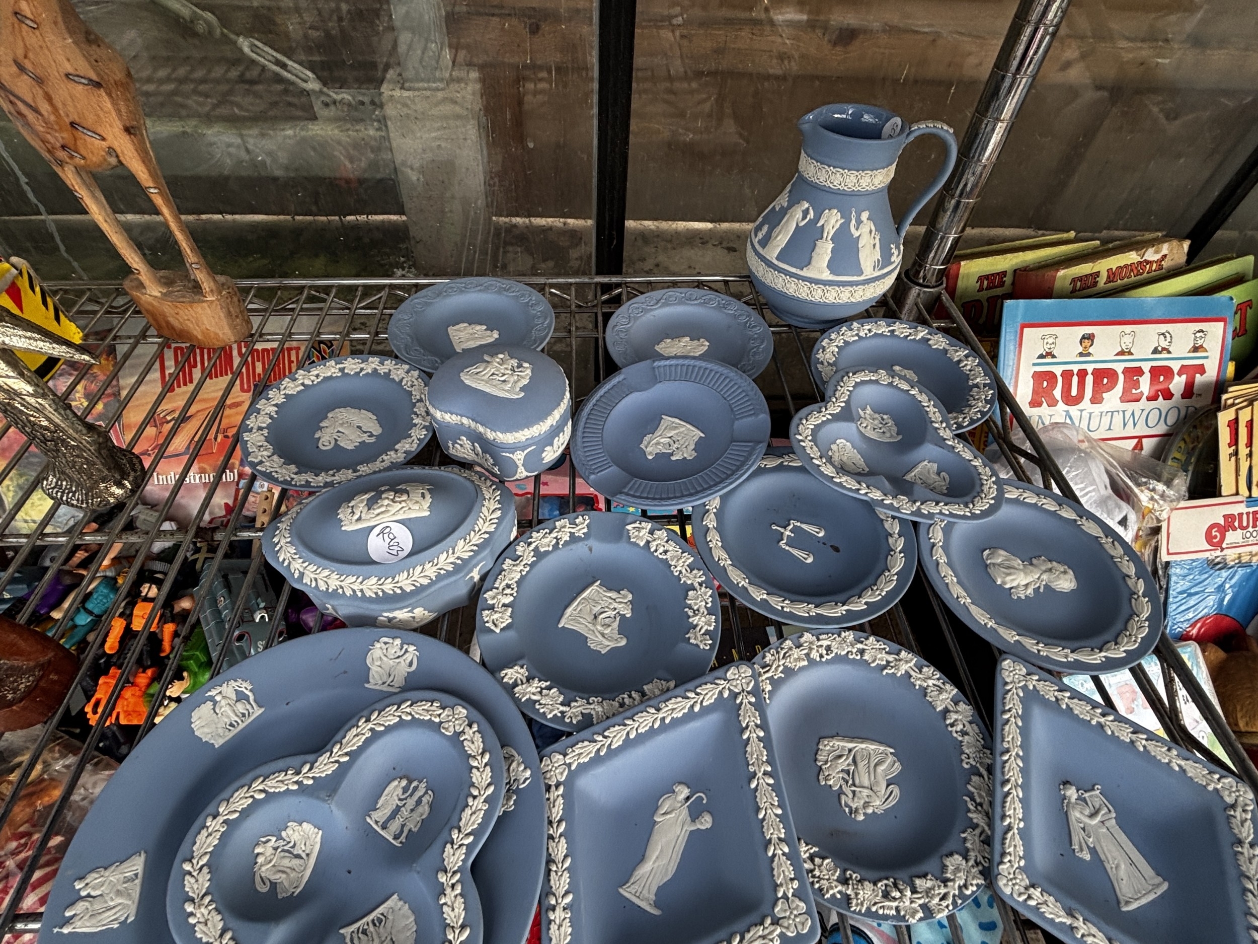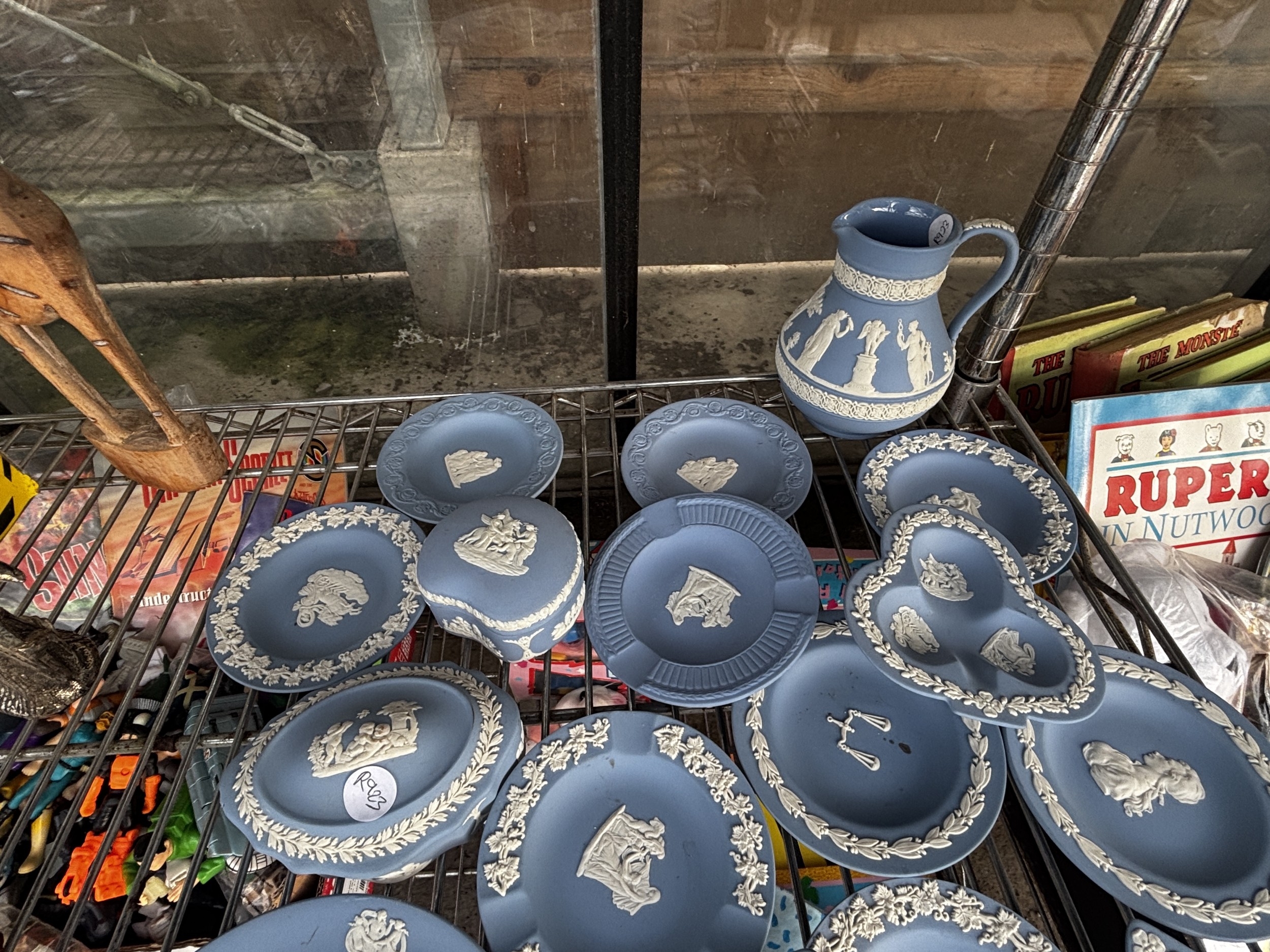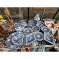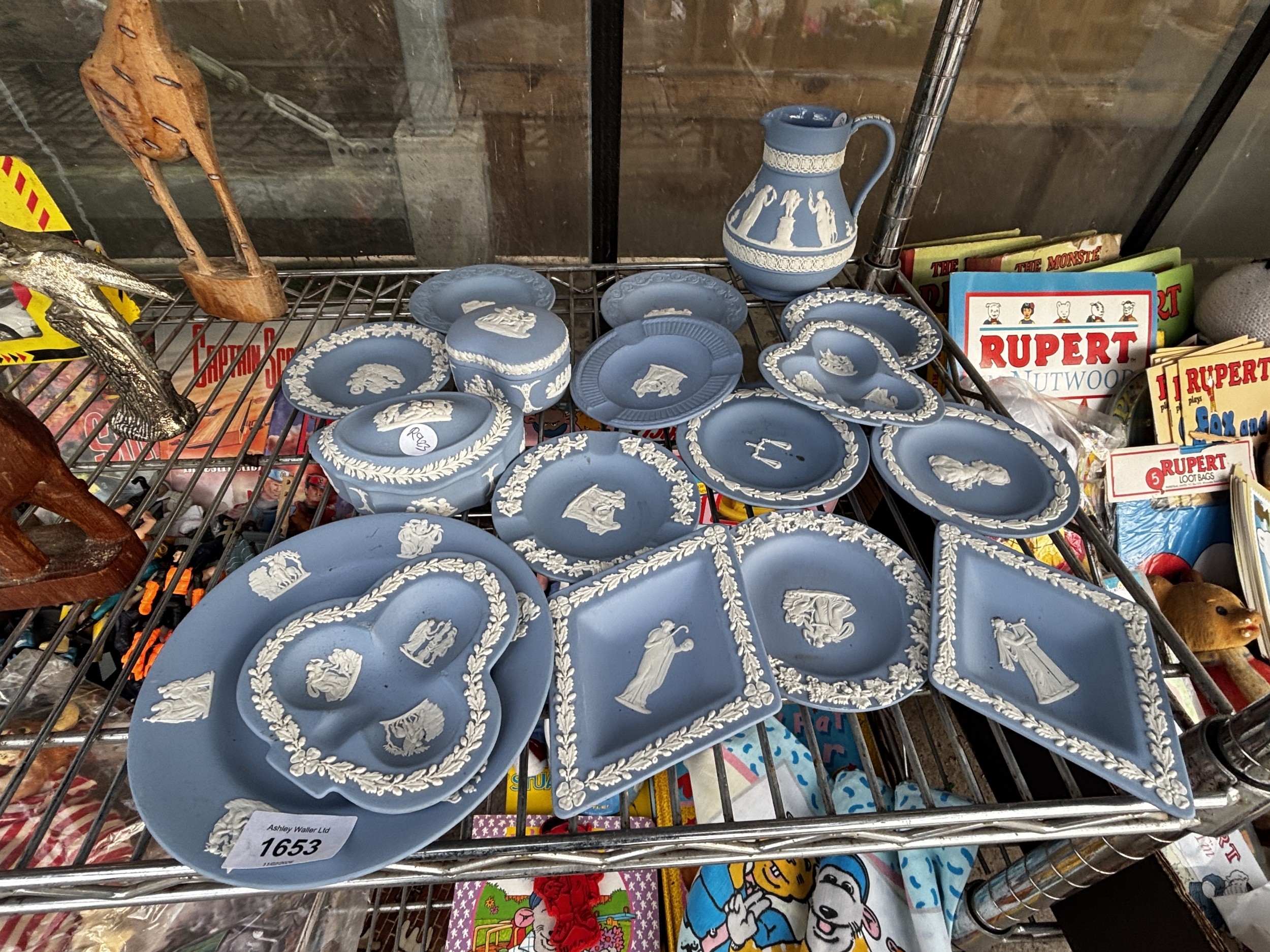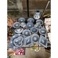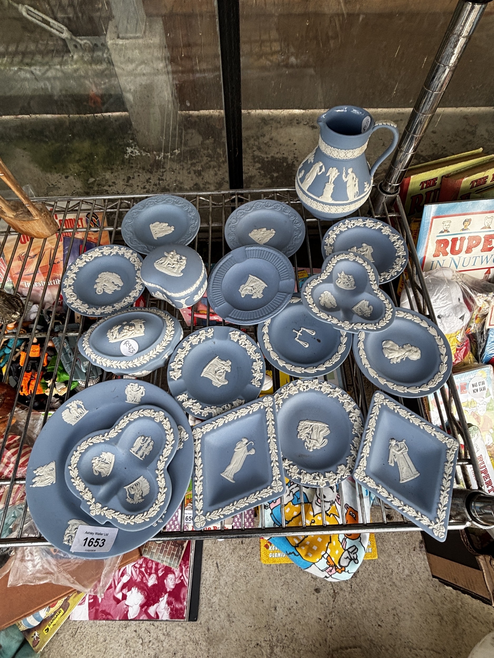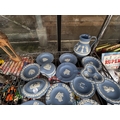 AN ASSORTMENT OF WEDGWOOD BLUE JASPER WARE ITEMS TO INCLUDE TRINKETS AND A JUG ETC