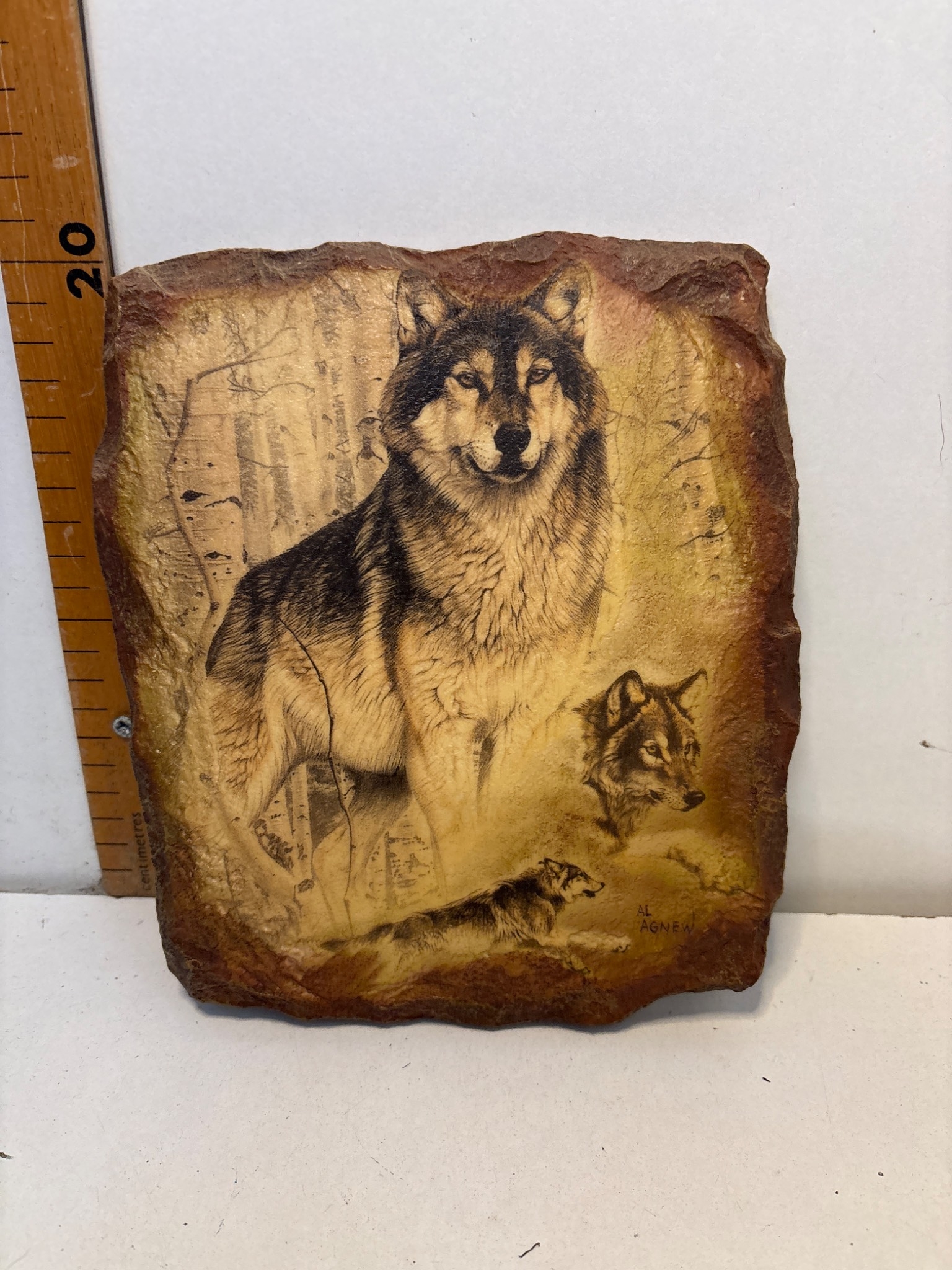 Al Agnew Enduring Spirits plaque featuring wolf designs.