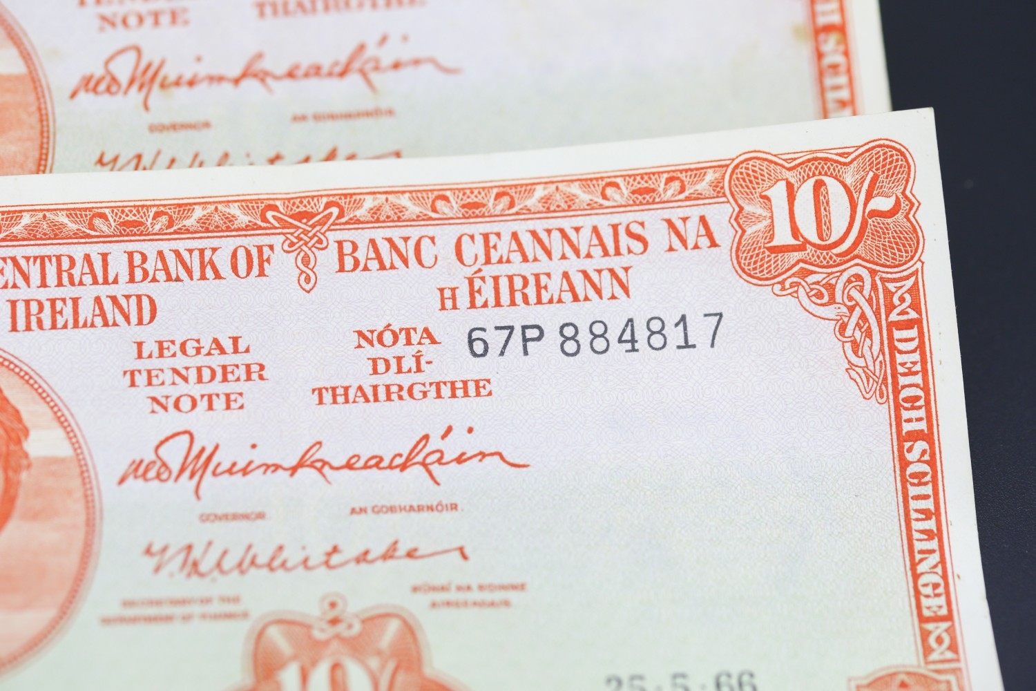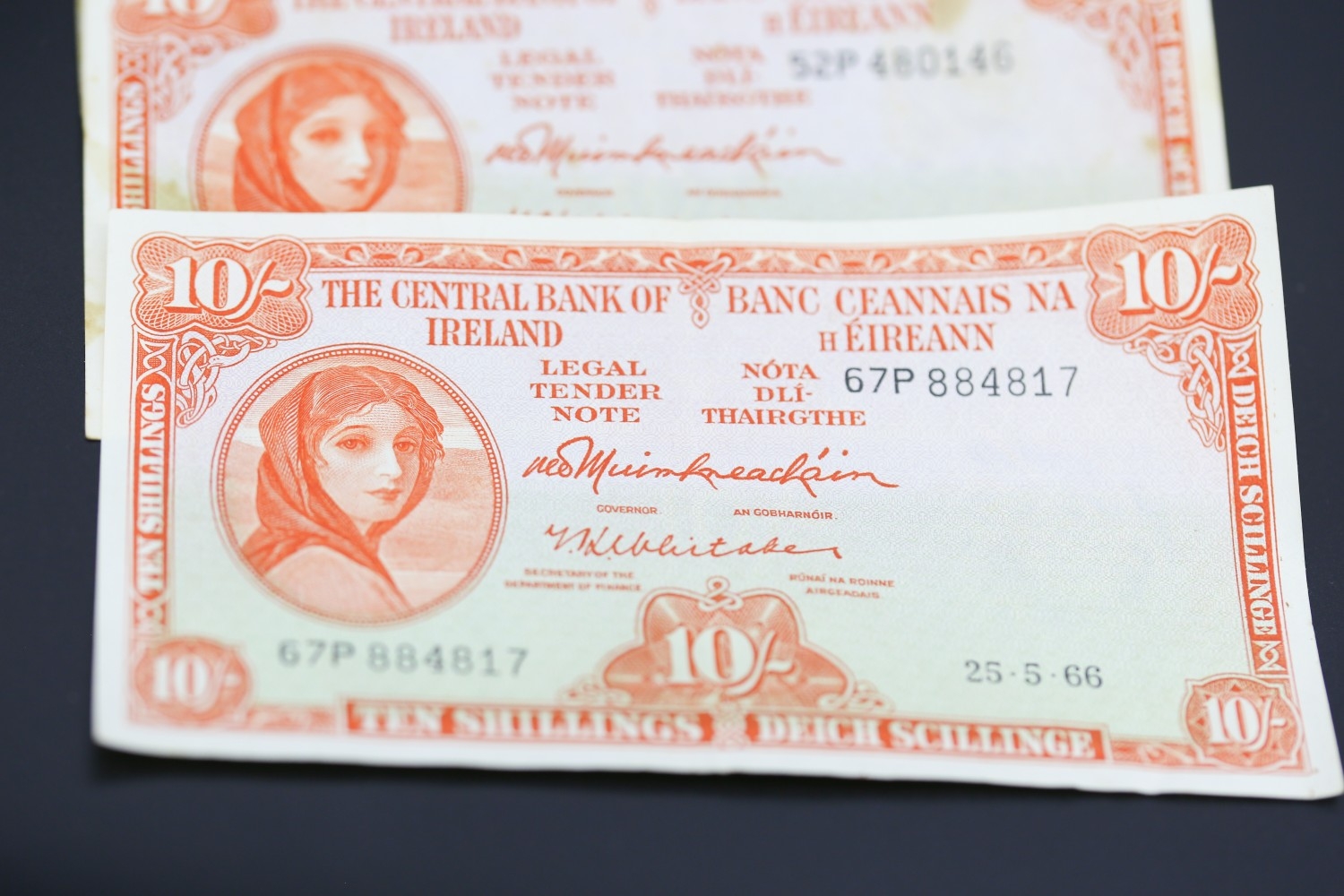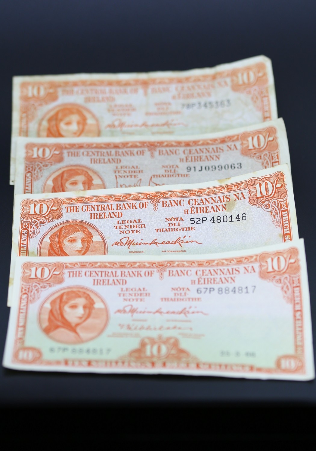 Four Ten Shilling Banknotes Issued by The Central Bank of Ireland 25-5-66, 1-10-60, 25-10-47, 6-6-68