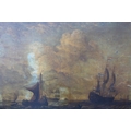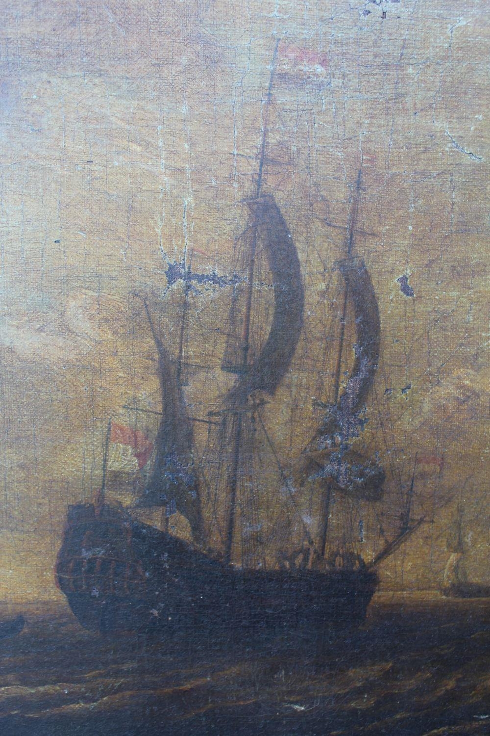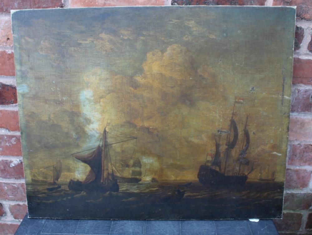 CIRCLE OF PETER VAN DEN VELDE (1634-c1724). Dutch sailing ships in rough seas, oil on canvas, unframed, 56 x 70.5 cm