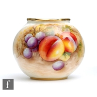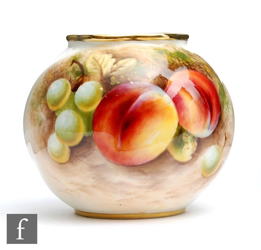 A small Royal Worcester Fallen Fruits shape G161 vase panel decorated by Rolands (or Roberts) with peaches and white grapes, signed, black printed mark, height 6.5cm.
