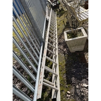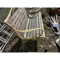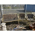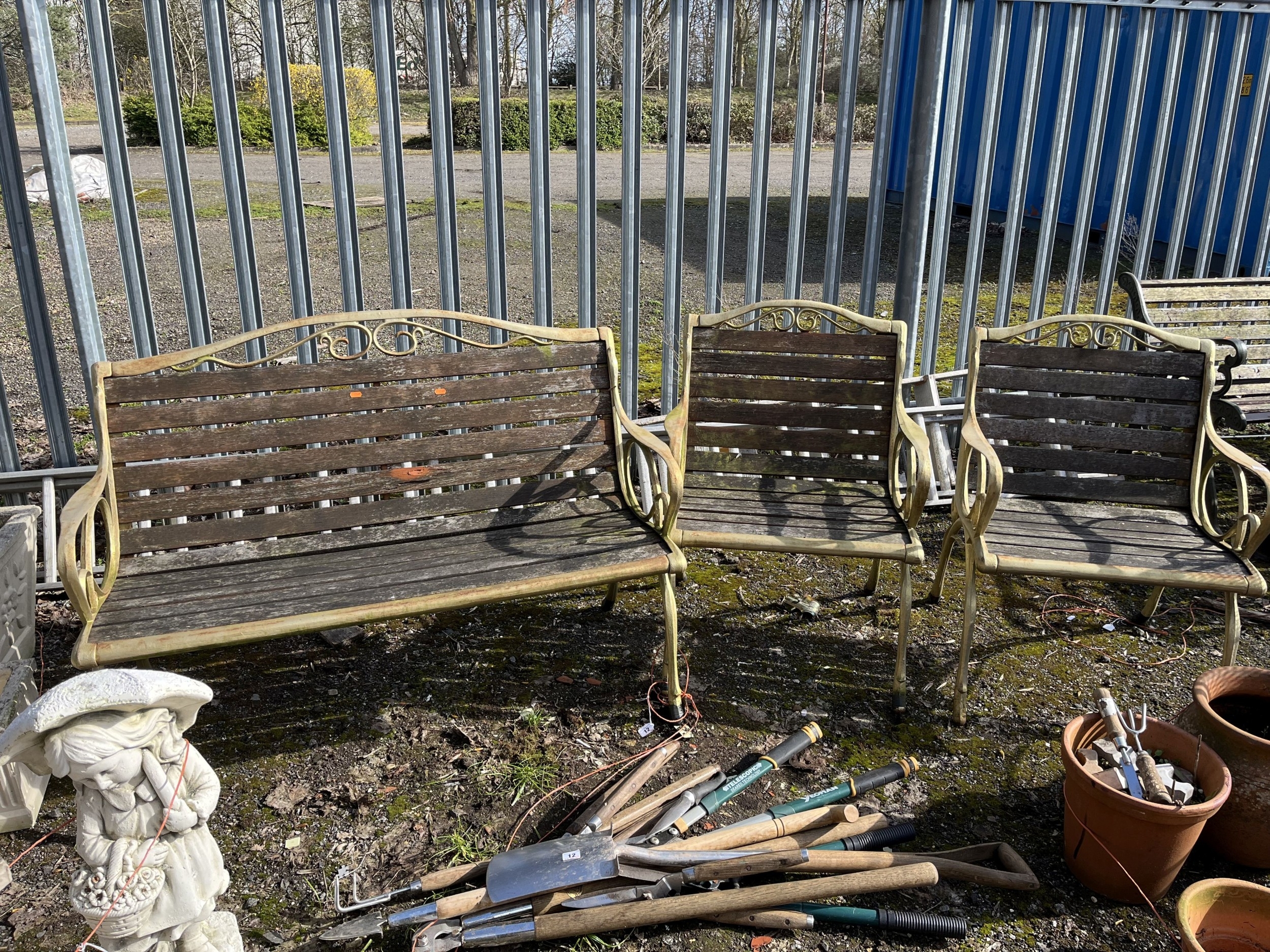 A CAST IRON GARDEN BENCH AND TWO MATCHING CHAIRS with a bench 124cm wide, all with scrolled detail to ends and wooden slatted seats and backs (3). Condition Report: finish losses to wooden parts