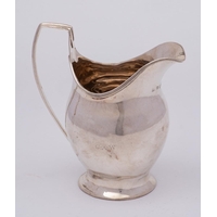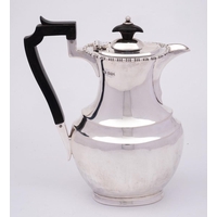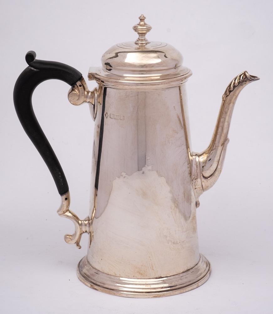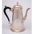 A silver coffee pot, all marks worn, Sheffield: of cylindrical tapering outline, with domed hinged lid and acanthus capped spout, on a circular foot, 20cm high, 387gms, 12.47ozs