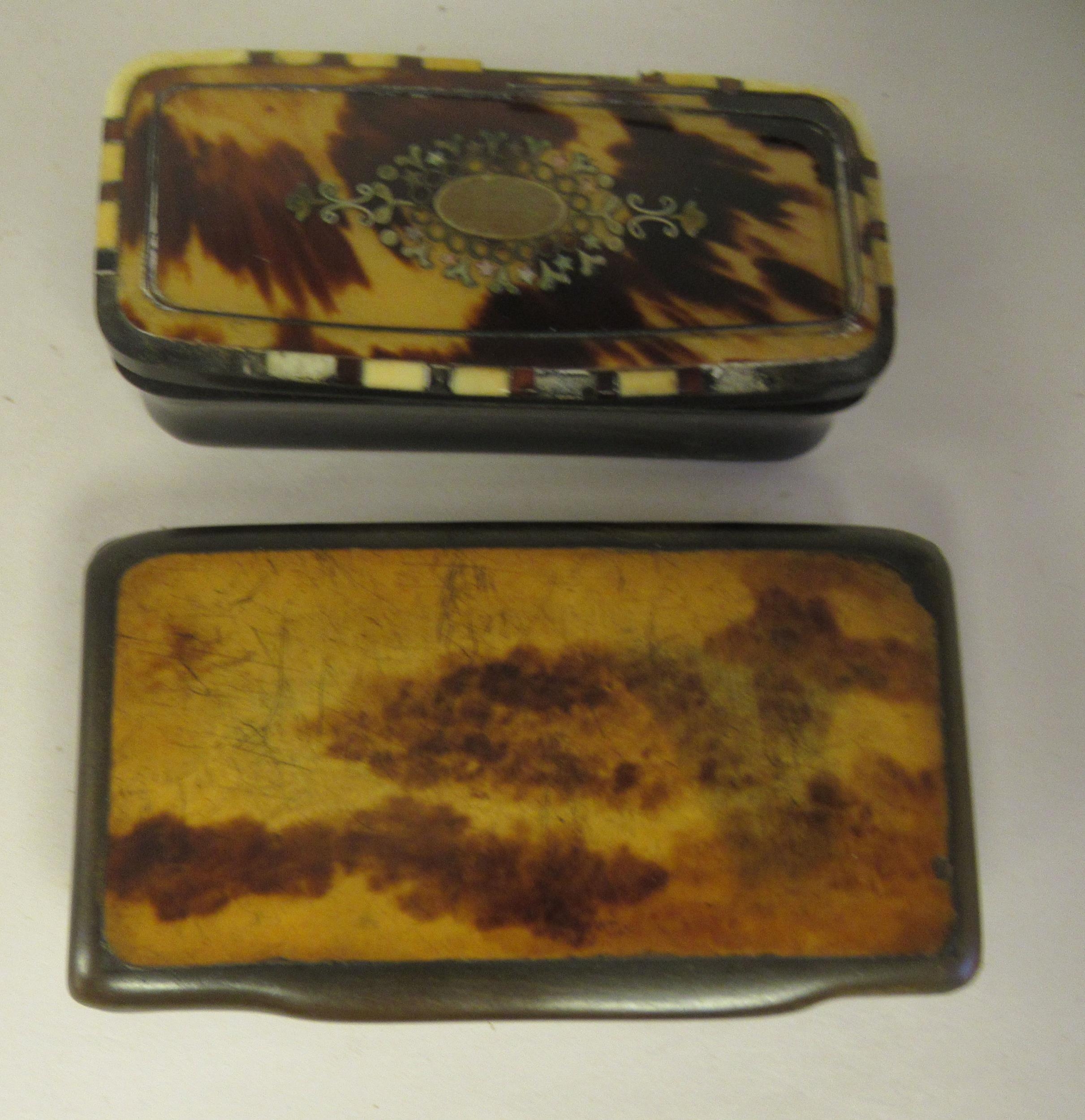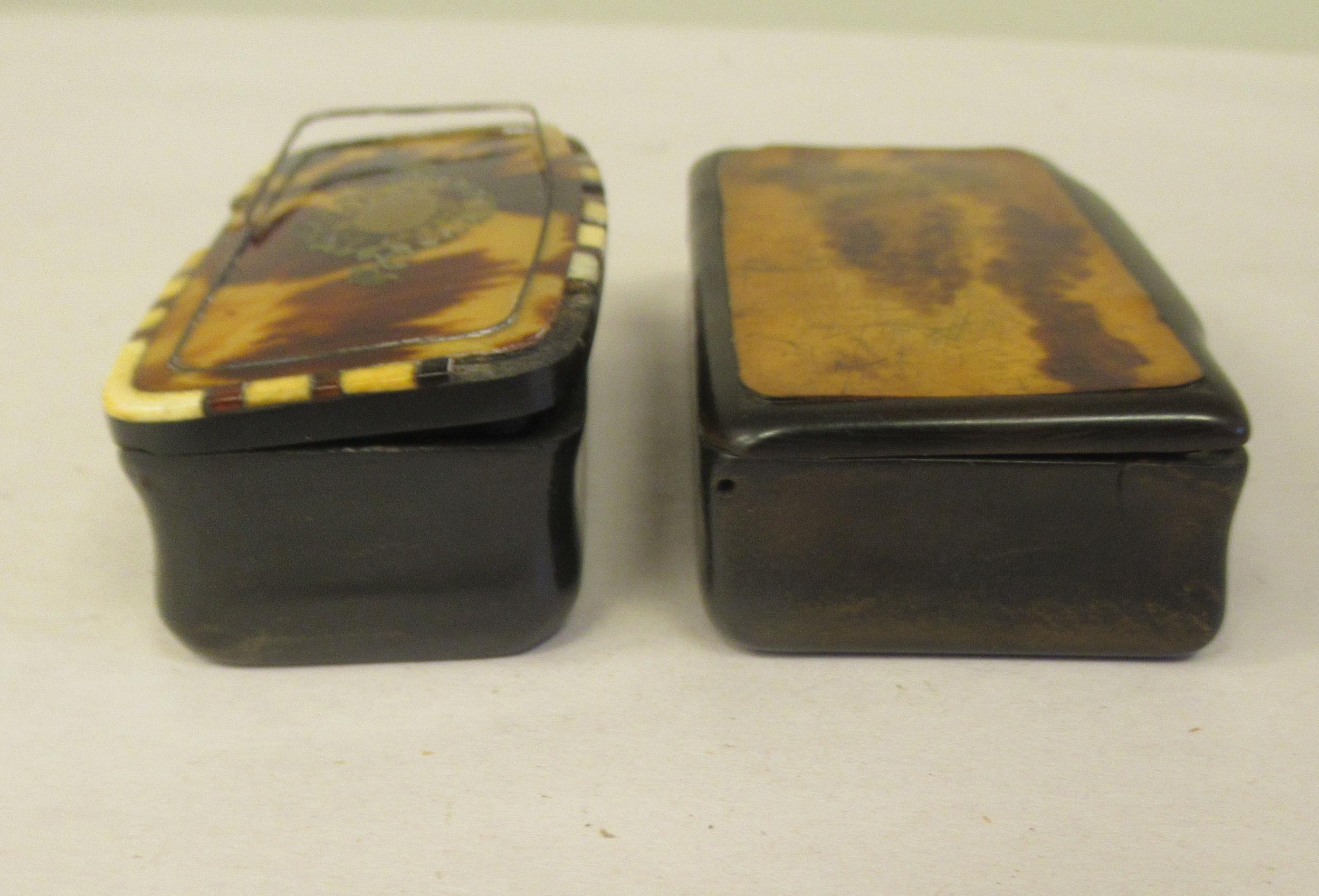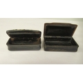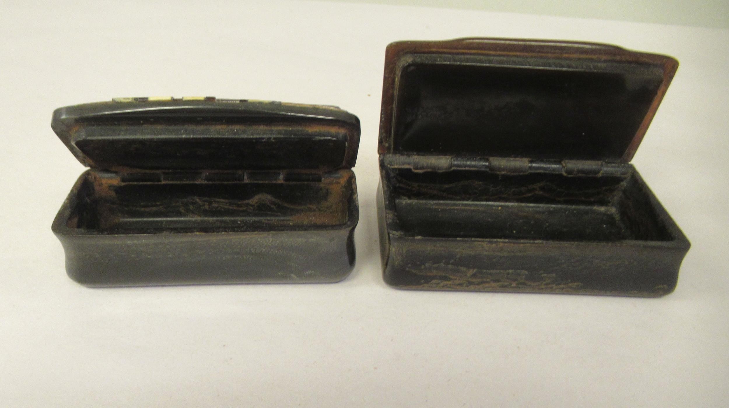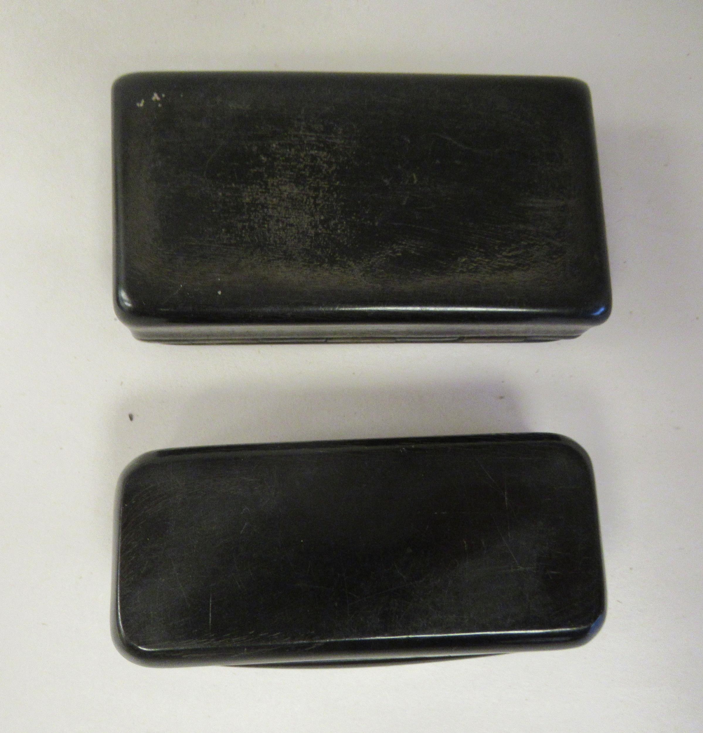Two similar late 19thC carved bone snuff boxes, one with inlaid, bi-coloured metal and mother-of-pearl ornament 3" & 3.25"w