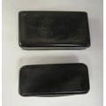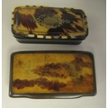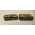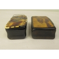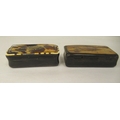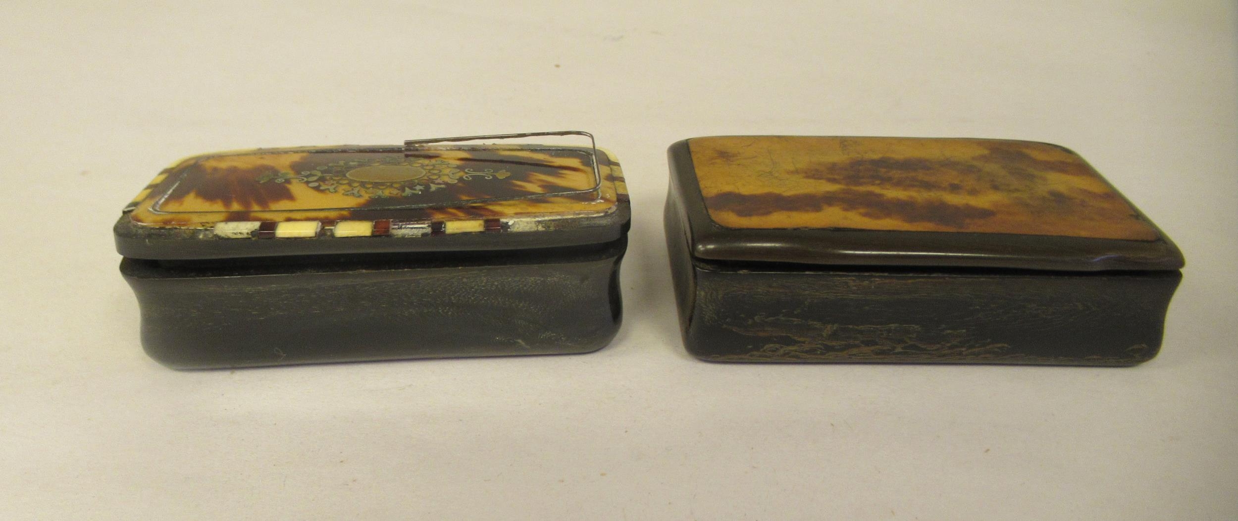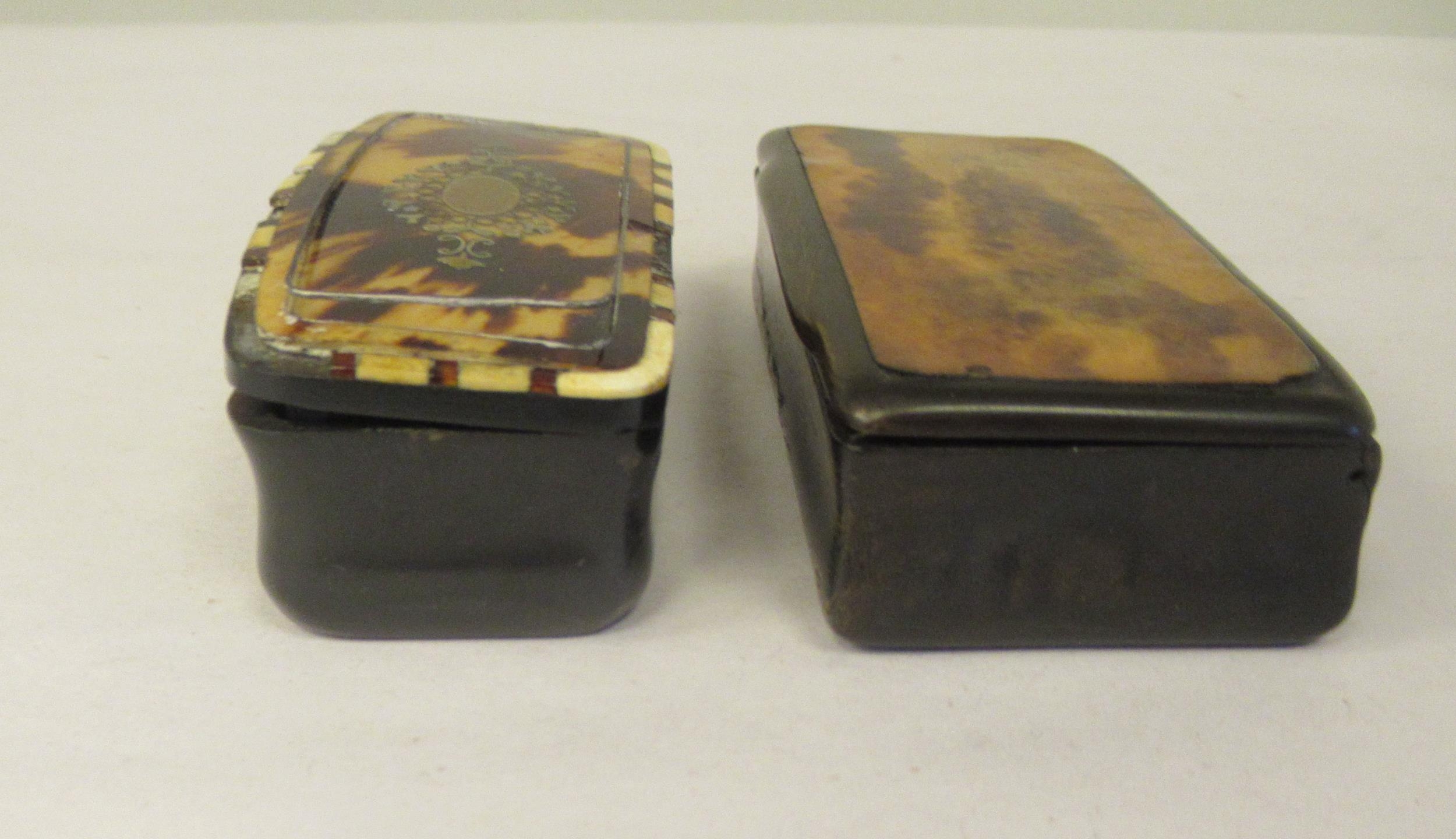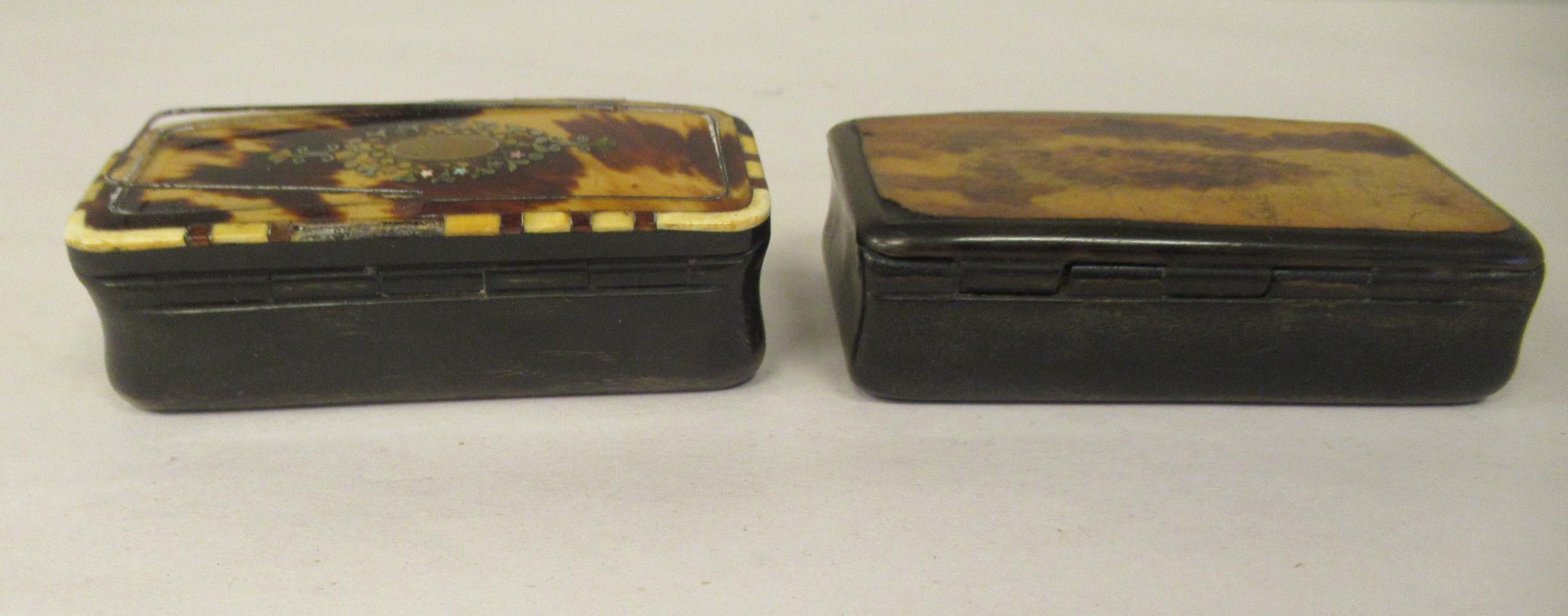 Two similar late 19thC carved bone snuff boxes, one with inlaid, bi-coloured metal and mother-of-pearl ornament 3" & 3.25"w