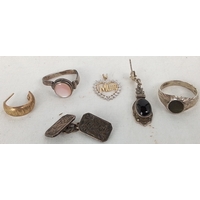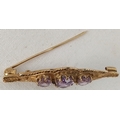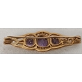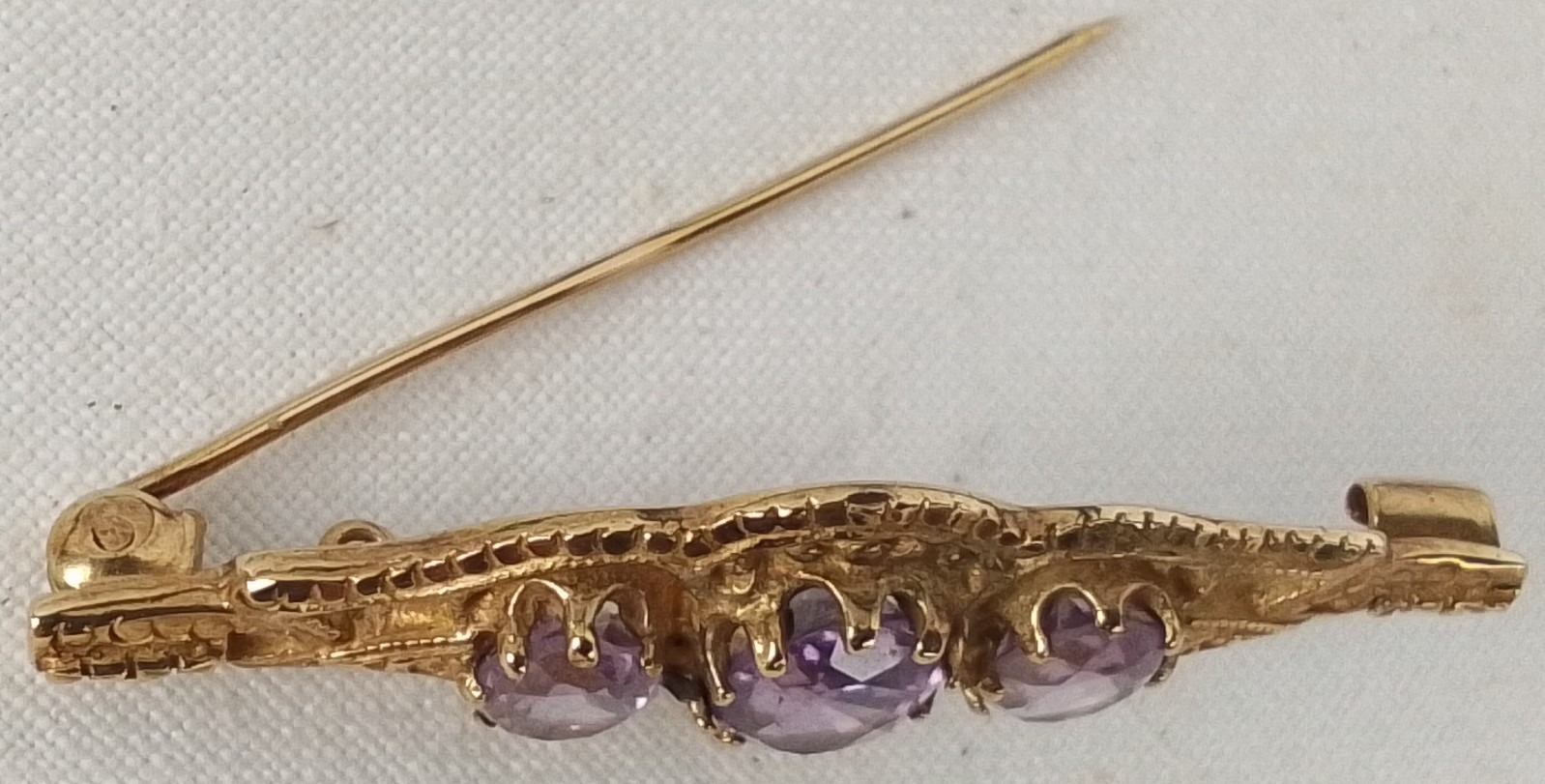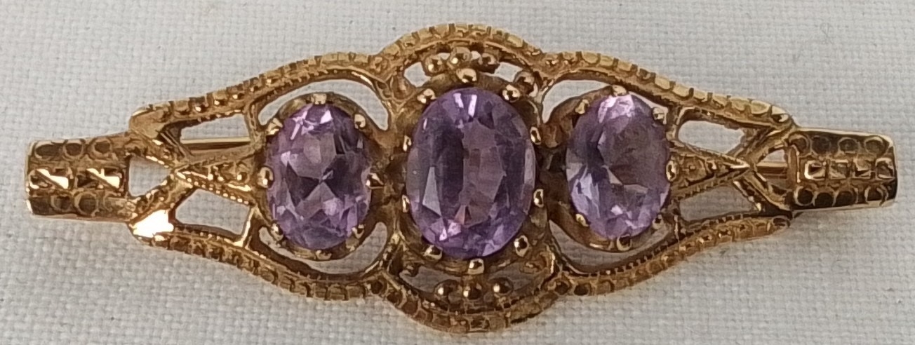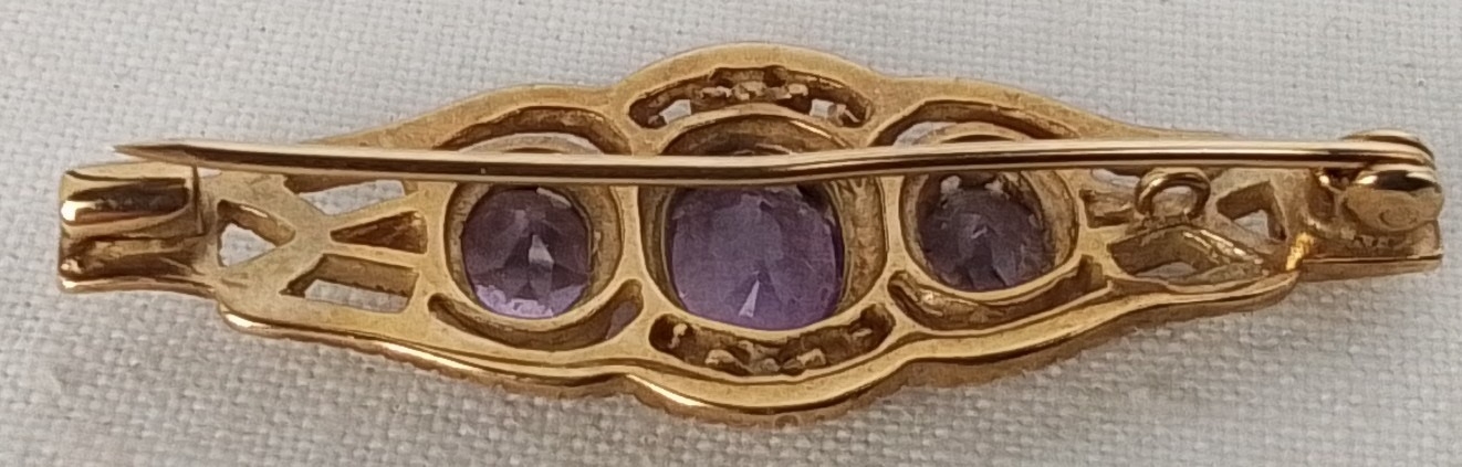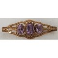 A gold brooch of openwork form, set with three oval-cut purple stones, the central stone larger; fitted with pin and clasp, of elongated navette outline, 5g including stones.