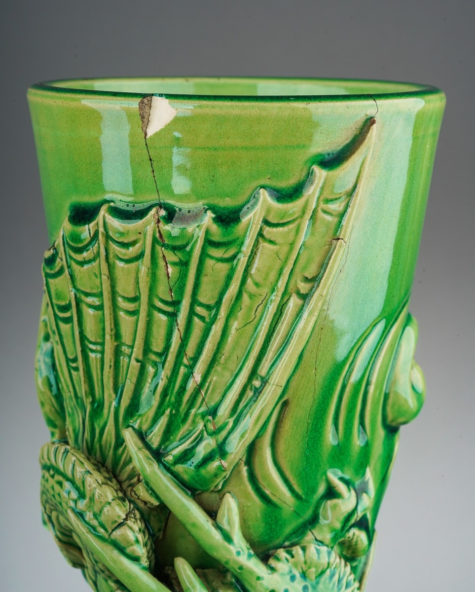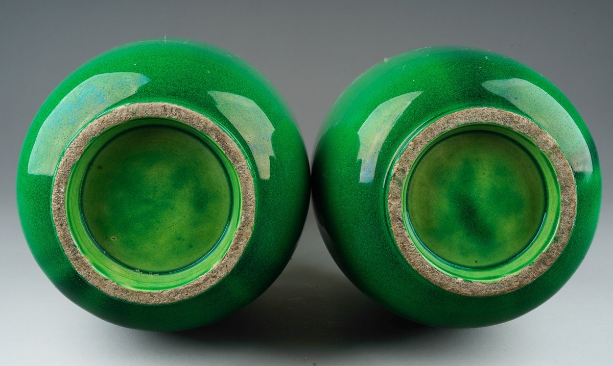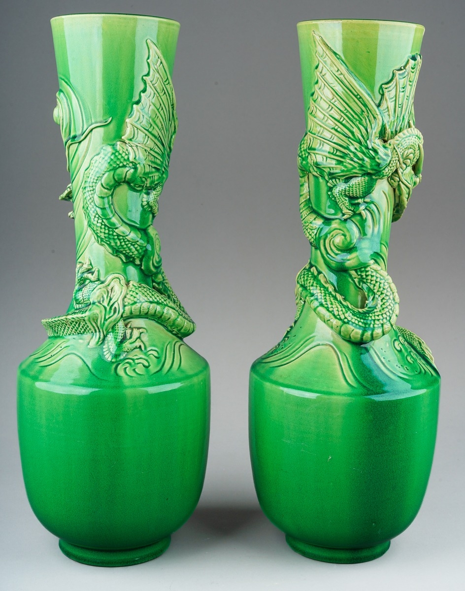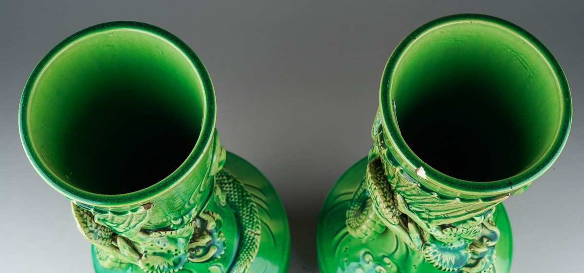 One vase has two cracks in the rim in close proximity, one of these has a chip to the outer rim, firing cracks noted through portions of the dragons on both vases.