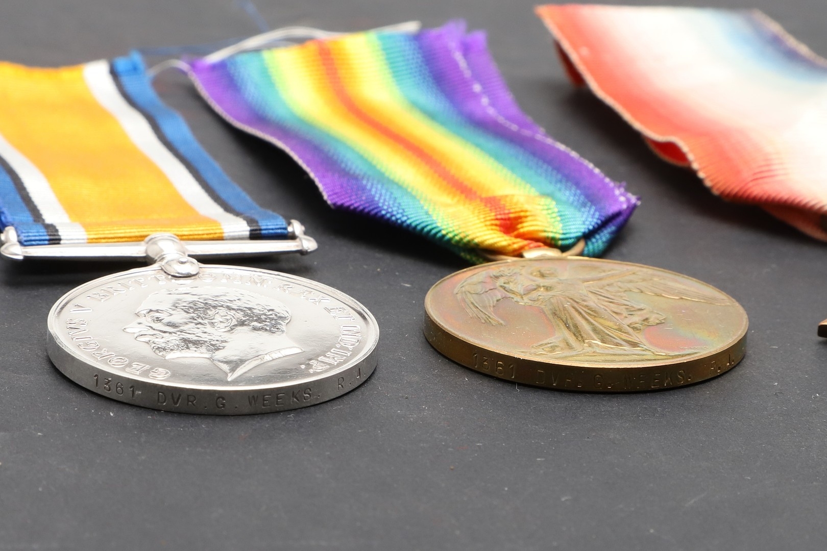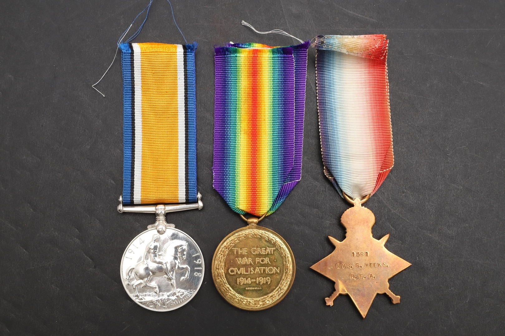 A FIRST WORLD WAR TRIO TO THE ROYAL ARTILLARY. A Great War trio comprising 1914-15 Star named to 1361 DVR G. Weeks R.F.A. War Medal and Victory Medal to 1361 DVR G. Weeks R.A. George Weeks is also recorded with number 890352. He entered the conflict on the 17th November 1915.