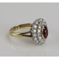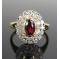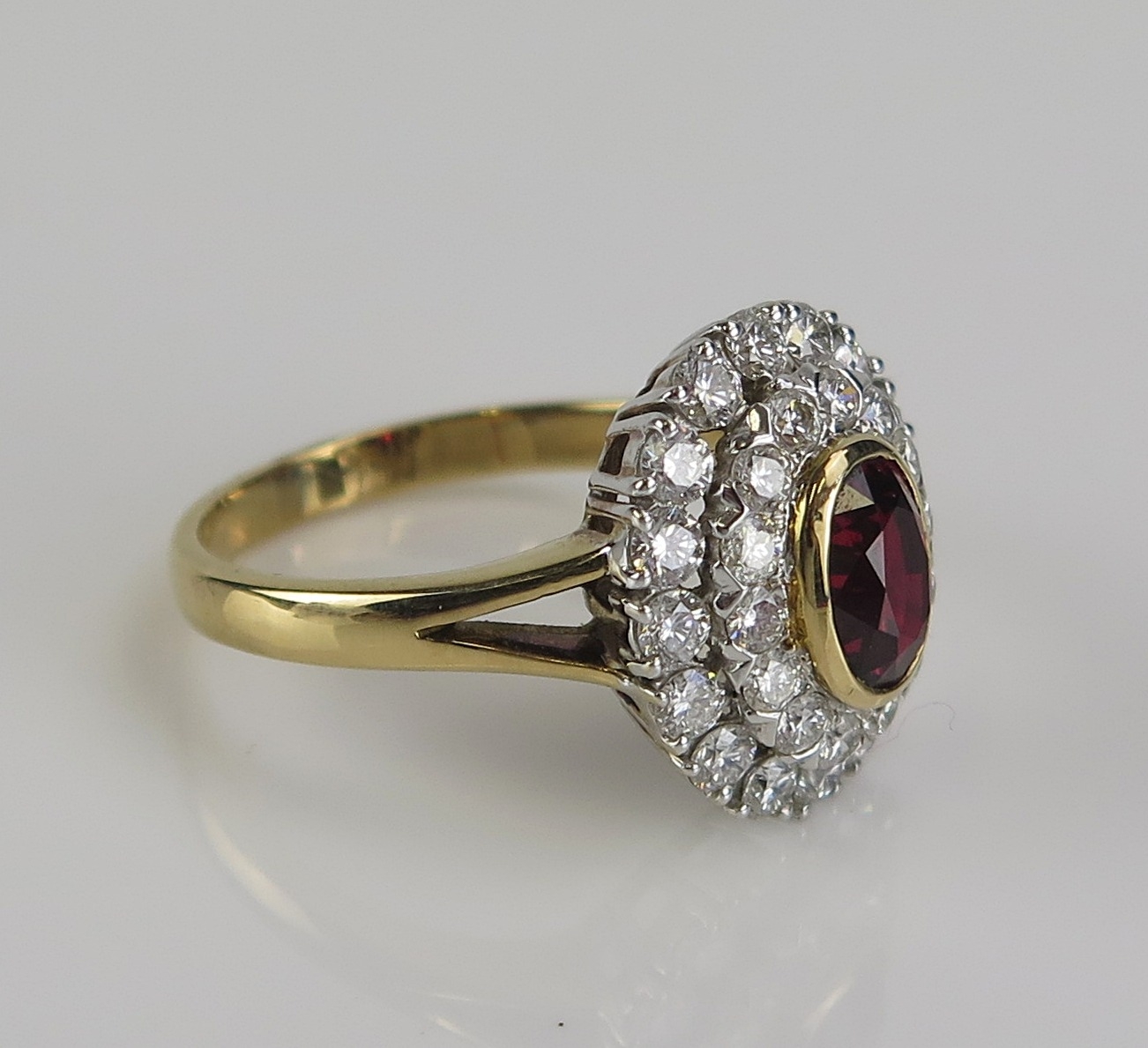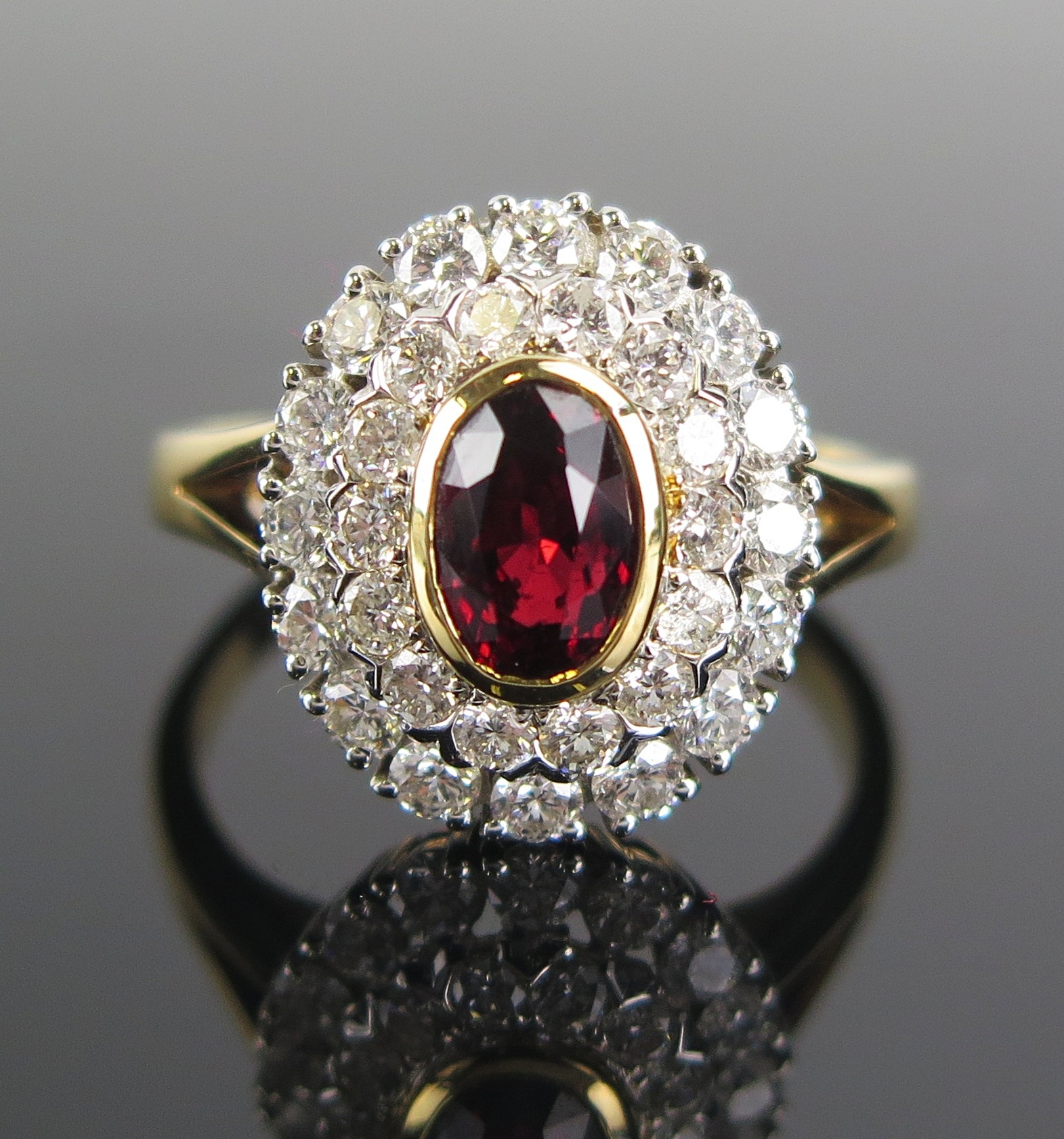 A ruby and diamond cluster ring in an 18ct yellow gold setting, c. 7.8x5.2mm principal stone and 17x14.8mm head, size S, hallmarked and made by Shipton & Co., 7g. Sold boxed with original receipt for £5,950 detailing the ruby to be 2.01cts and 1.25cts of diamonds