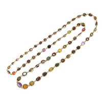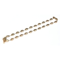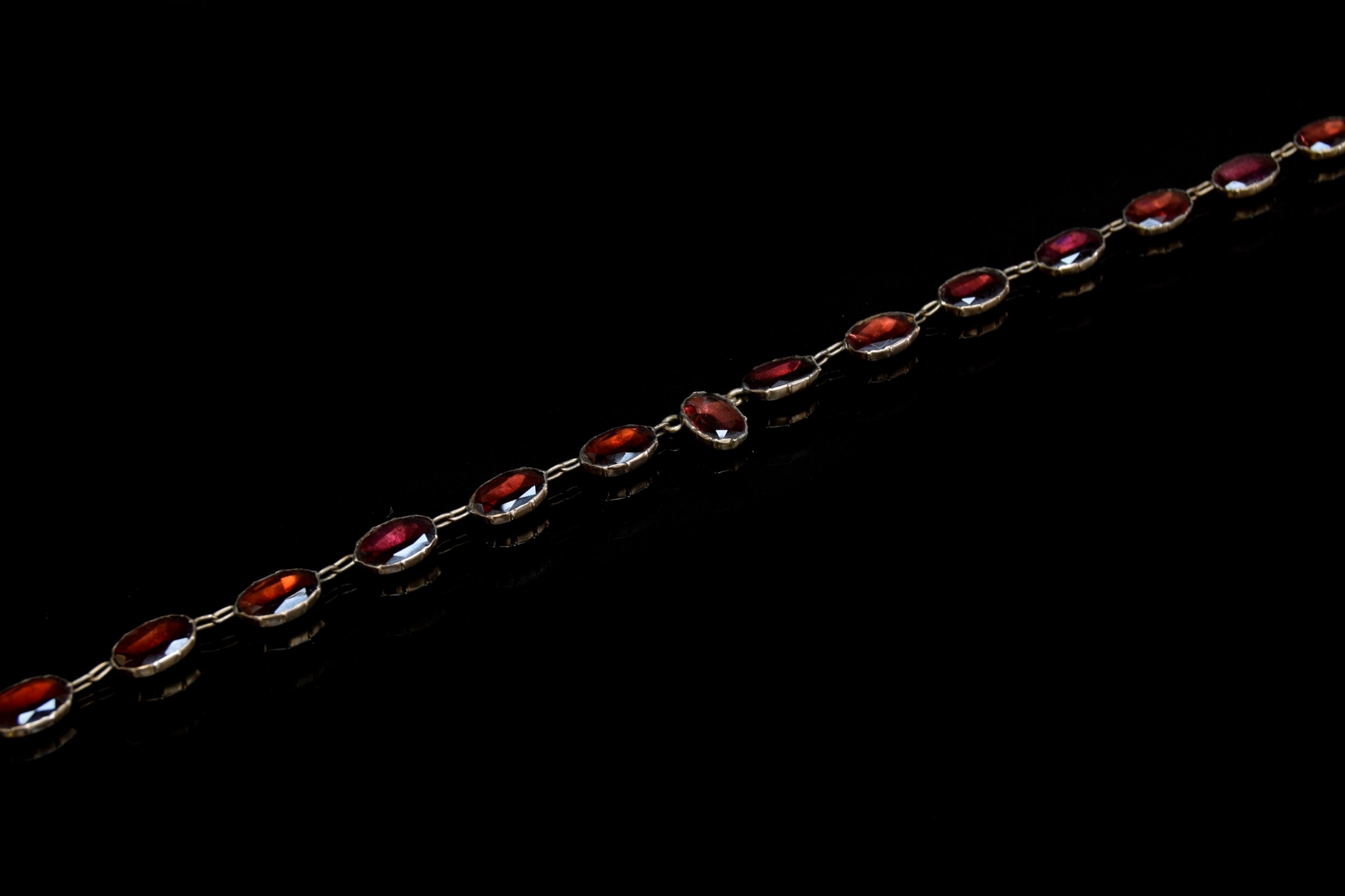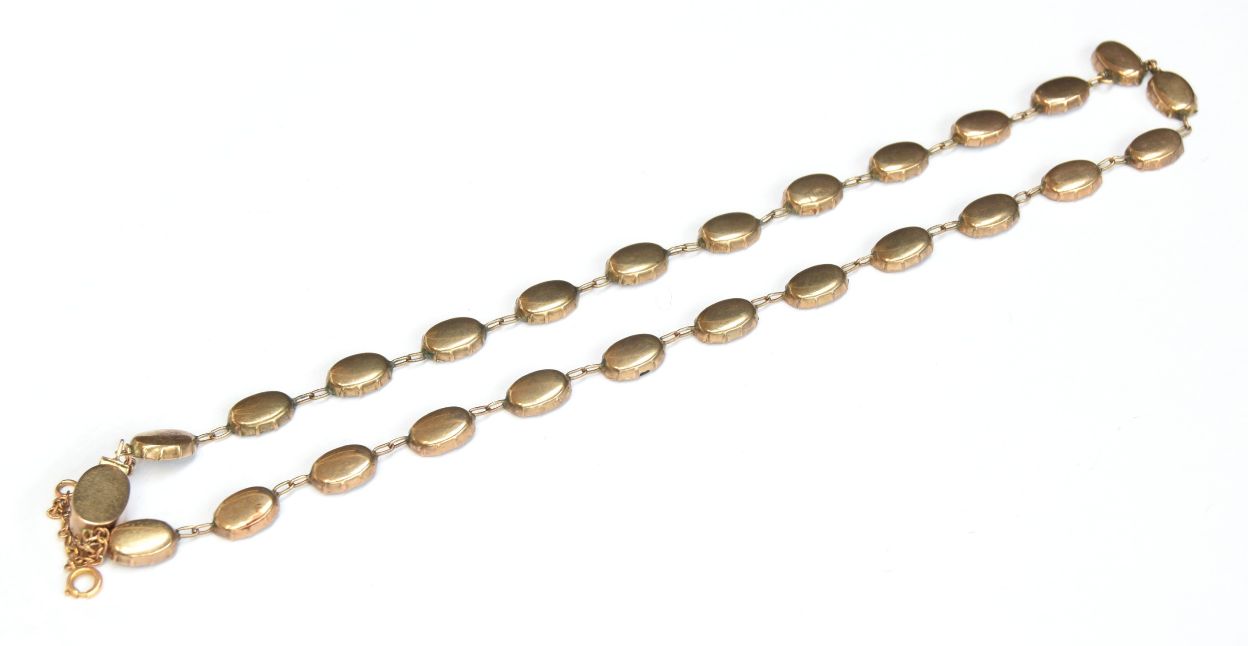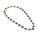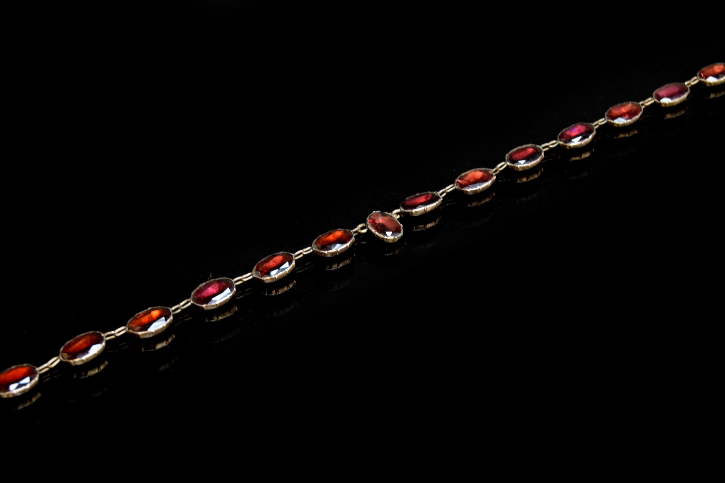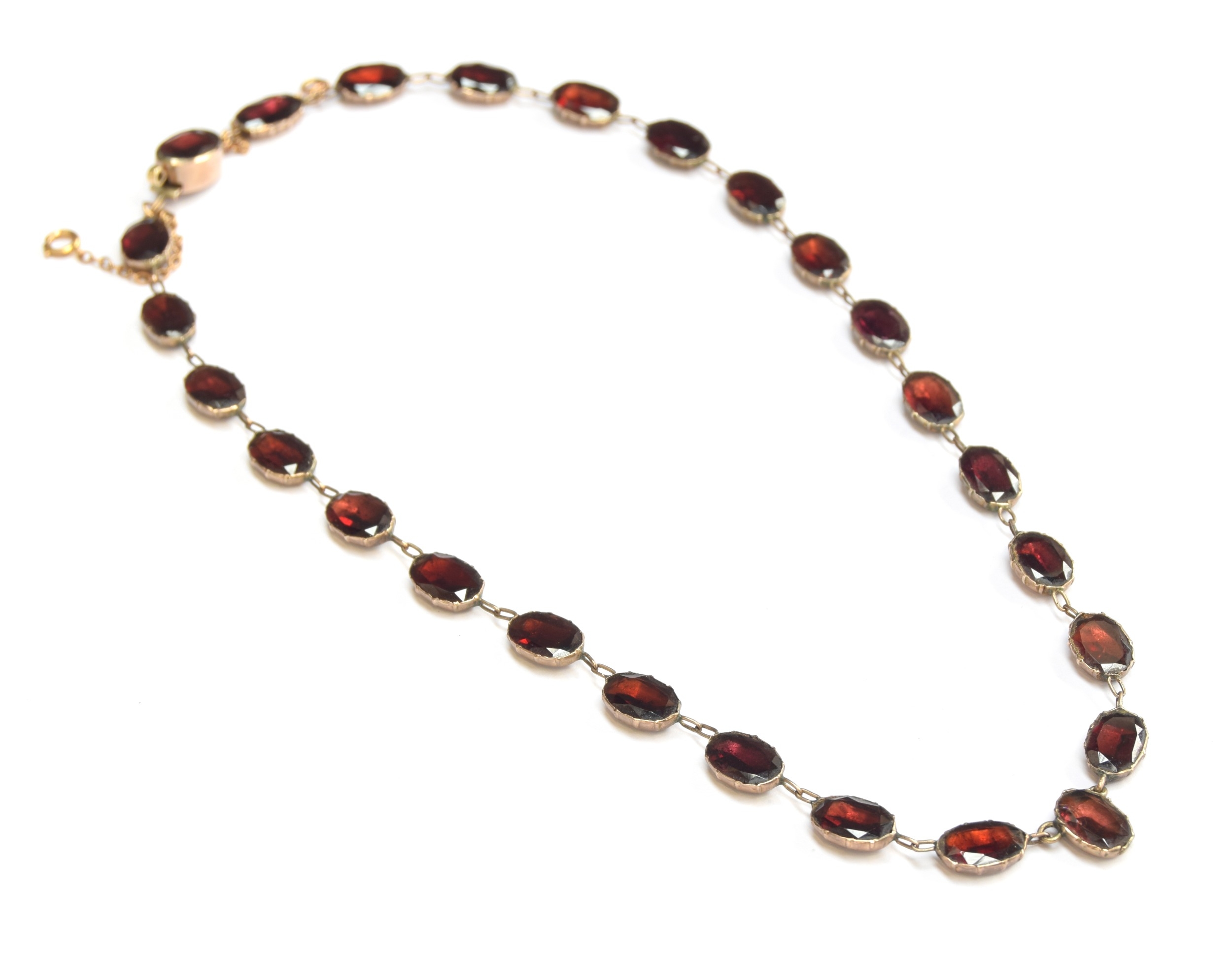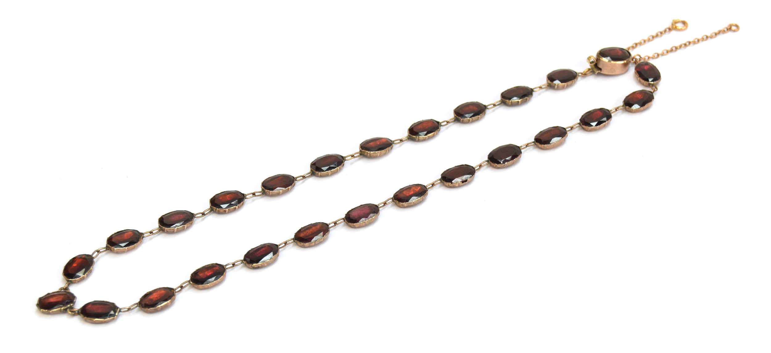 A late 19th century gold mounted flat cut garnet riviere necklace, each of the foiled garnets 1cm long, fastening with a box clasp, 39cm long unclasped, 15.7g