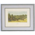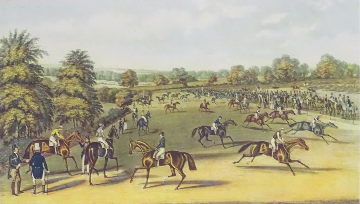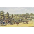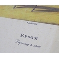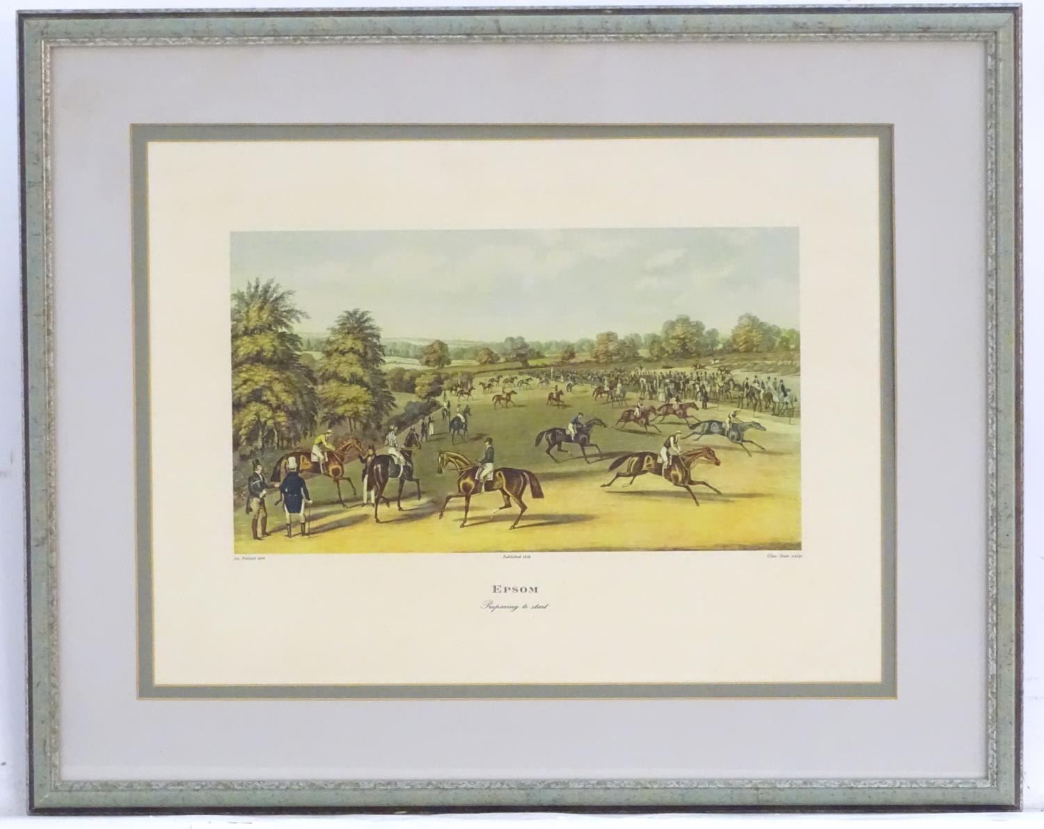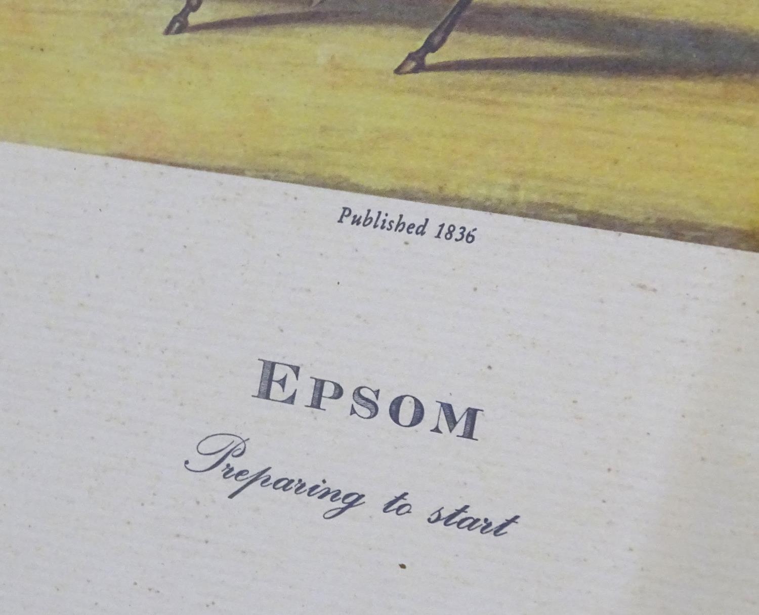 George Hunt (1803-1877), After James Pollard (1792-1867), Colour engraving, Epsom, Preparing to Start, Horses and jockeys preparing for a race. Titled under. Approx. 7" x 12 1/4"
