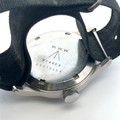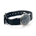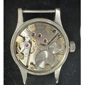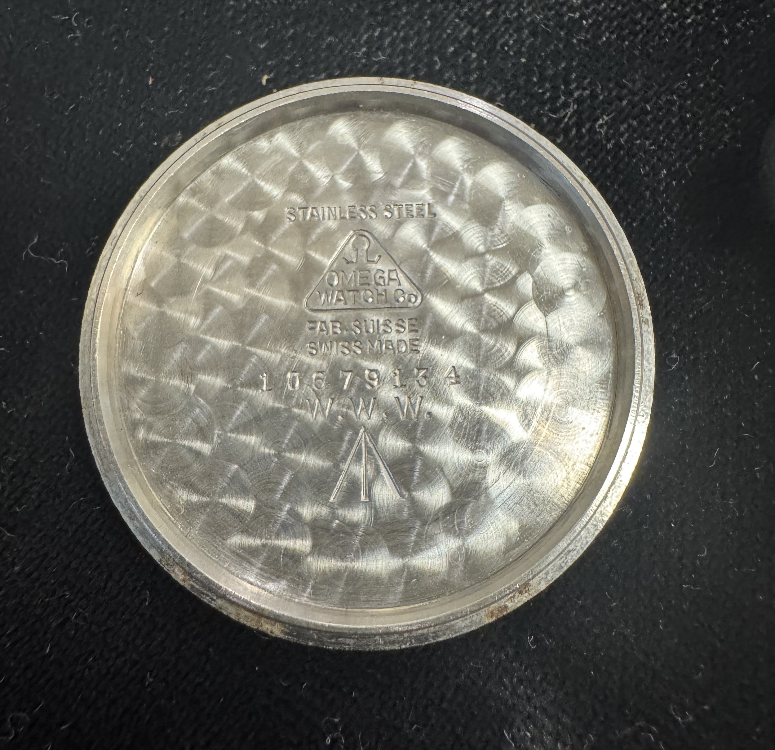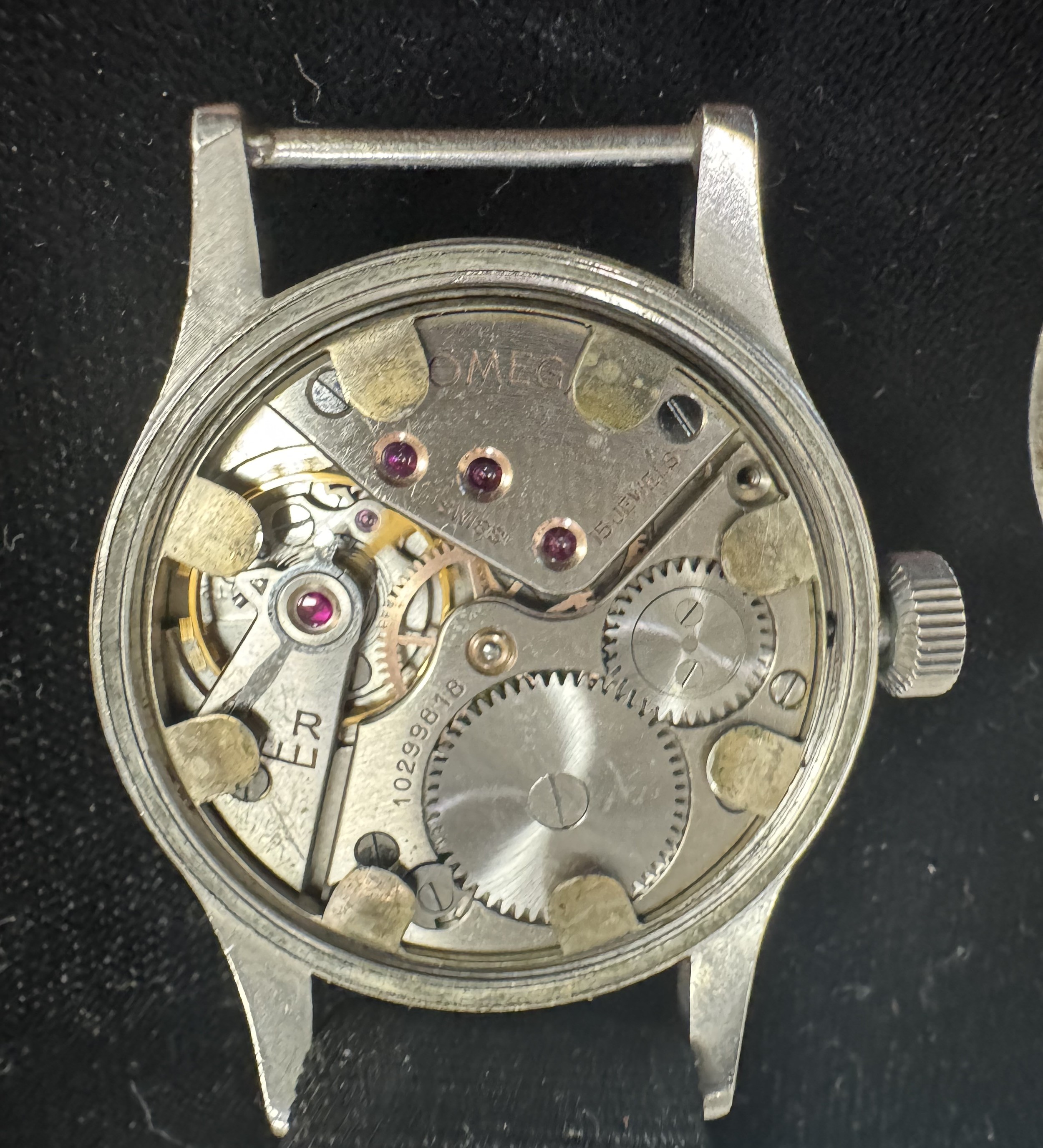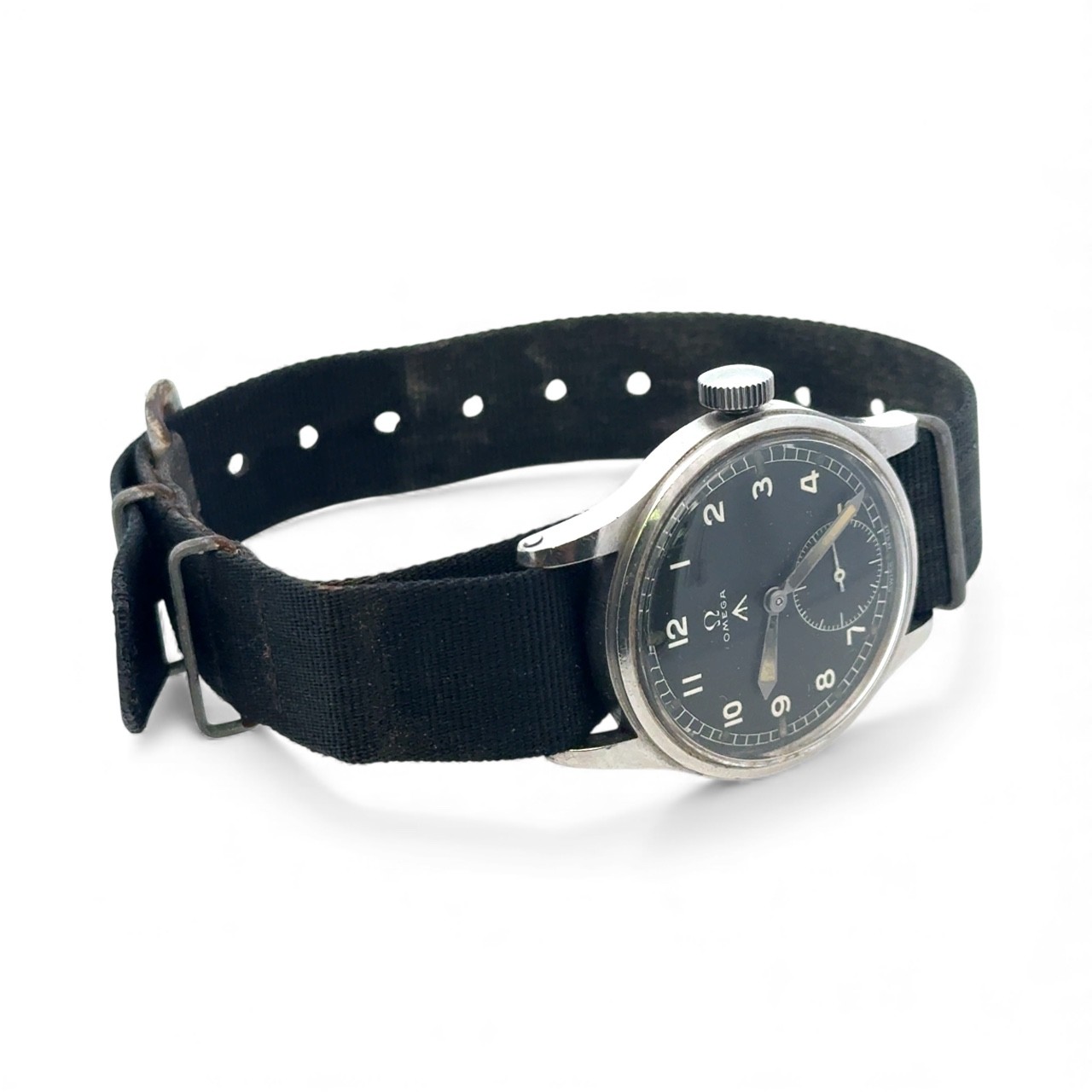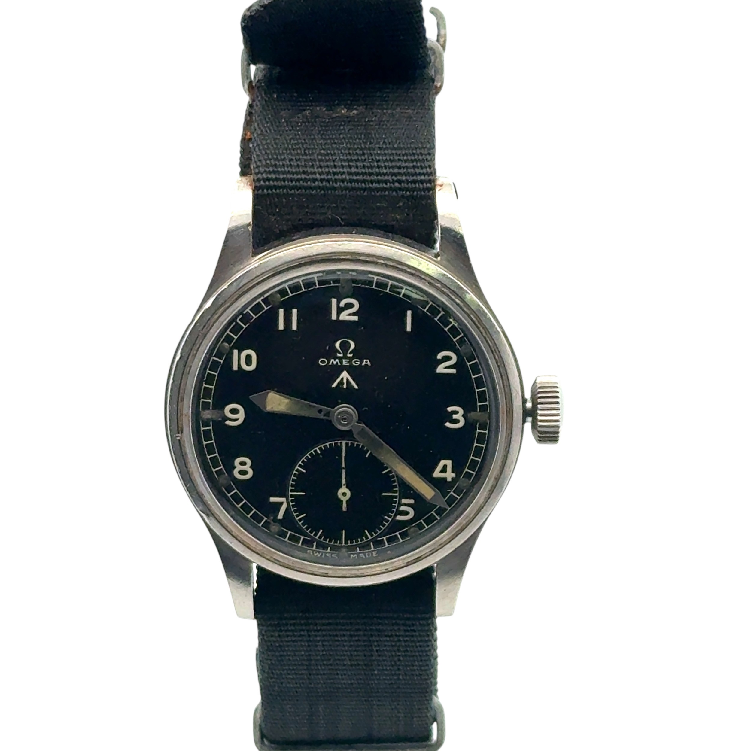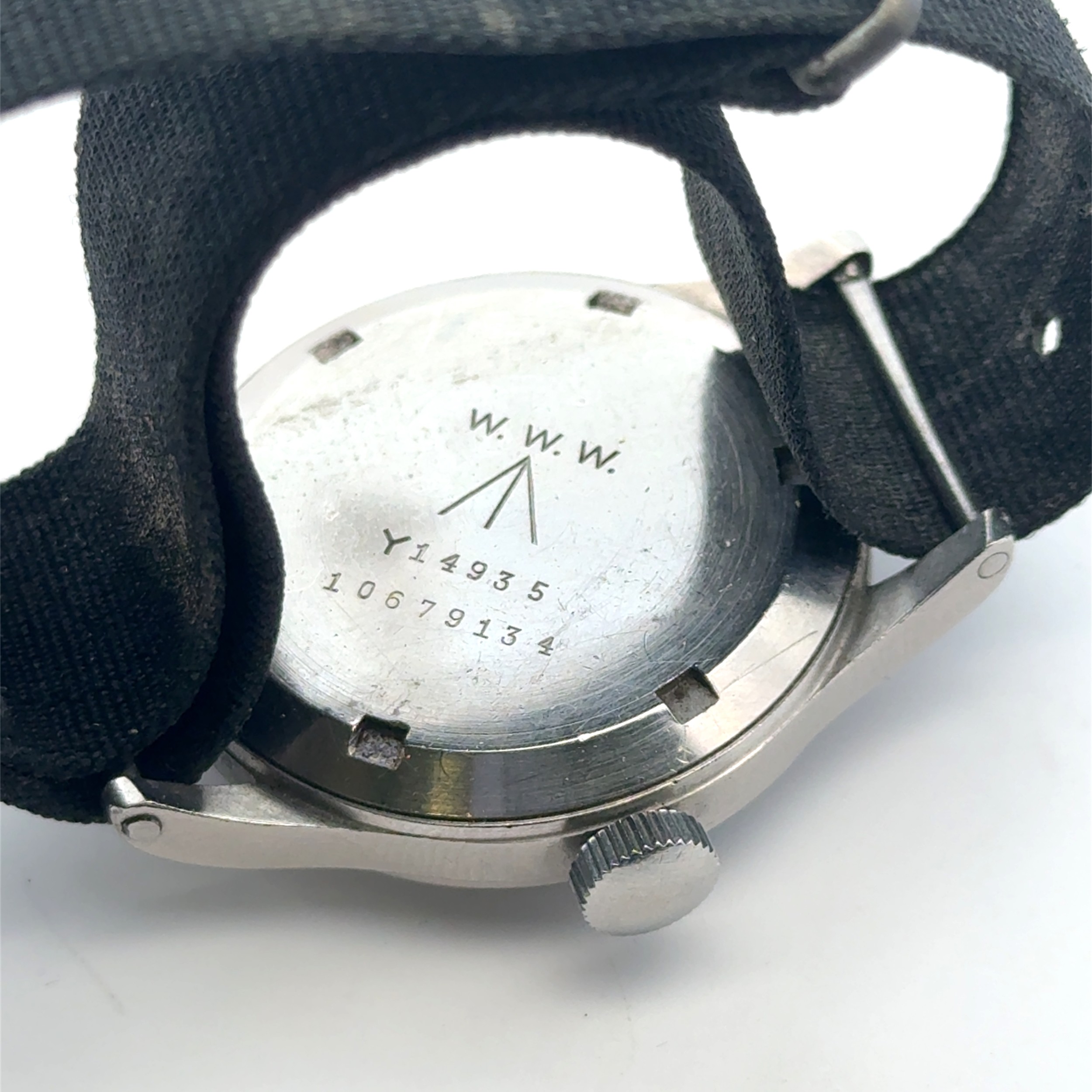 Omega - a W.W.W. British Military 'Dirty Dozen' manual wind wrist watch, 1944. Signed black dial with Arabic numeral markers, luminous hands and markers, broad arrow and subsidiary seconds. Case back inscribed 'W.W.W. Y14935 10679134' Movement Cal 30T2, numbered 10299818. On a black fabric strap, case diameter 36mm. Watch is winding and ticking.