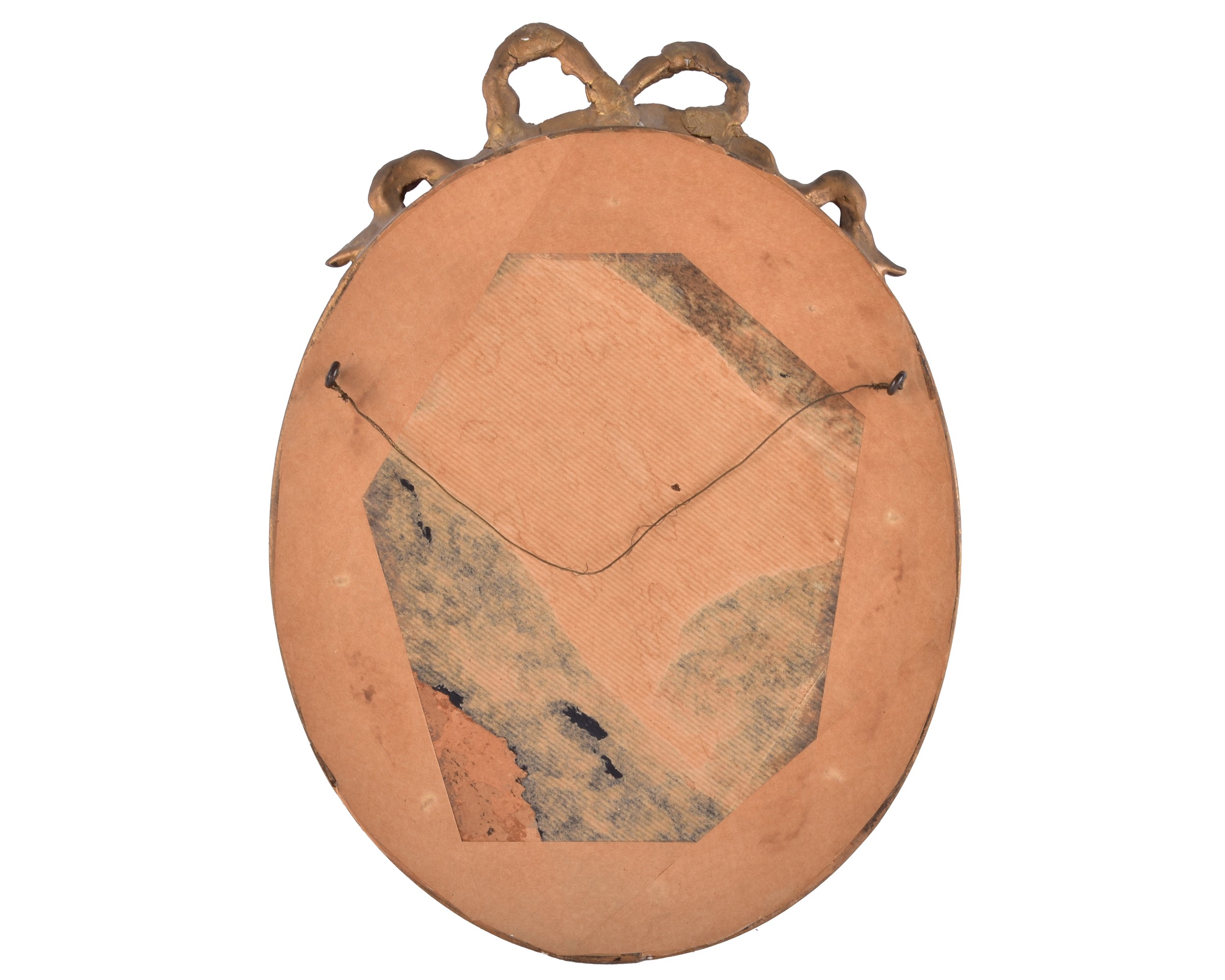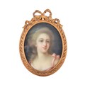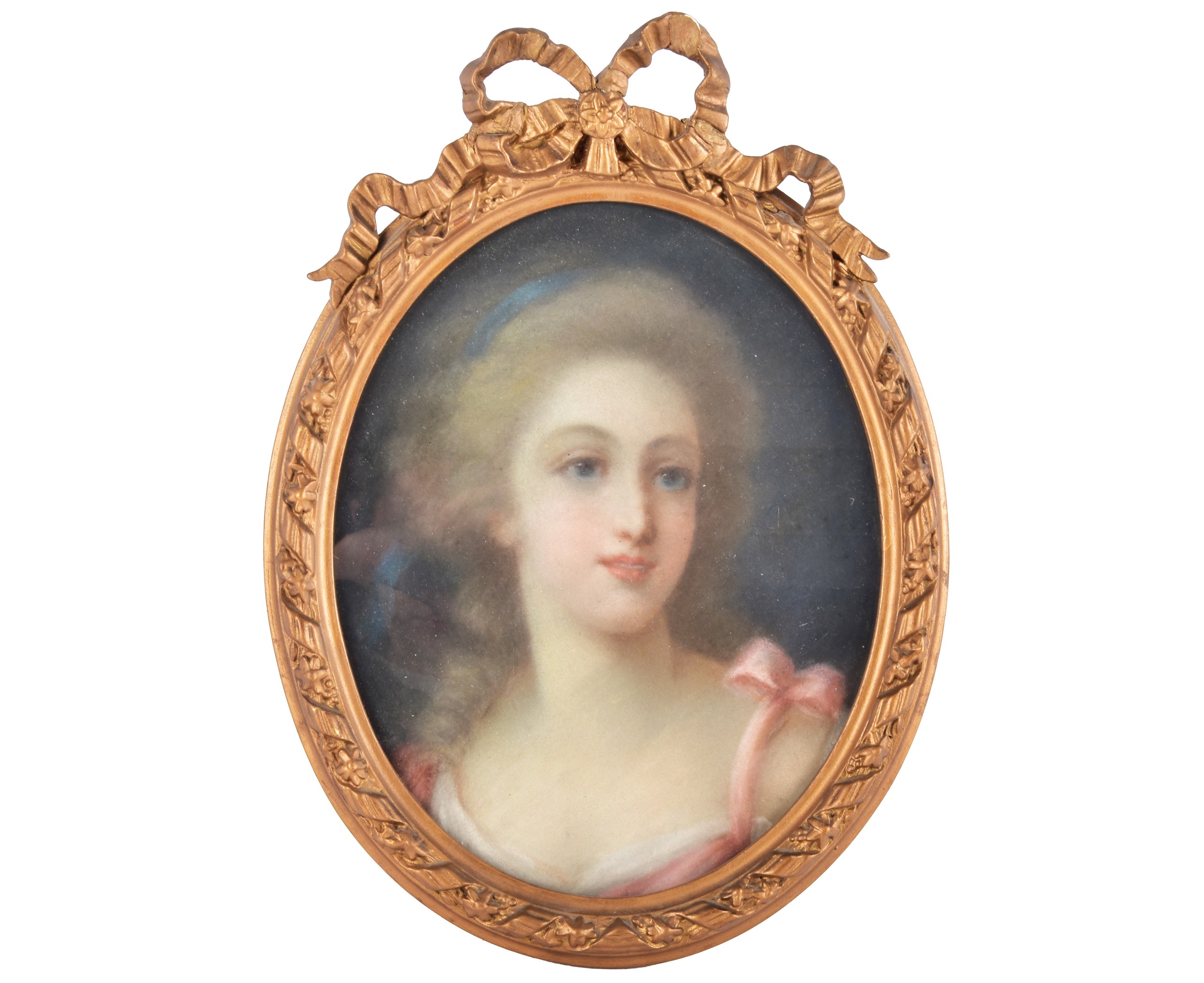 Possibly after R. Gravier, a later portrait of Mademoiselle de Lambese, depicting the profile of a beautiful young woman with blue hair ribbon and a pink dress, pastel on paper, within decorative oval giltwood frame with bow surmount, glazed, unsigned. Painting 29 x 23 cm.