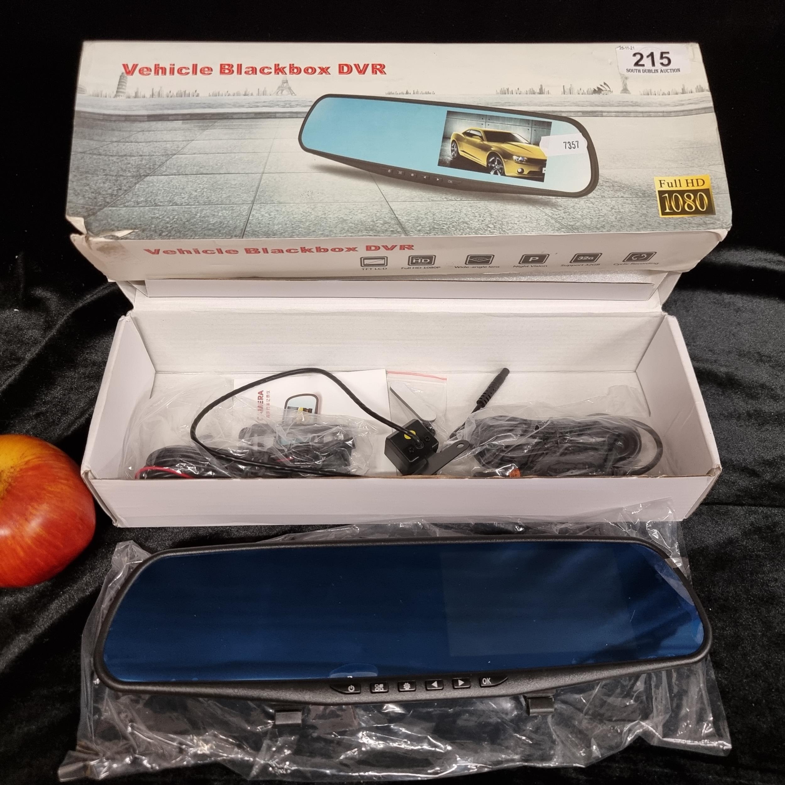 A Vehicle Blackbox DVR - A Dashboard Dual Lens Camera. 1080P with wide angle lens and night vision capabilities. Brand new in box, unopened.