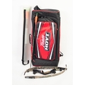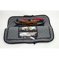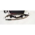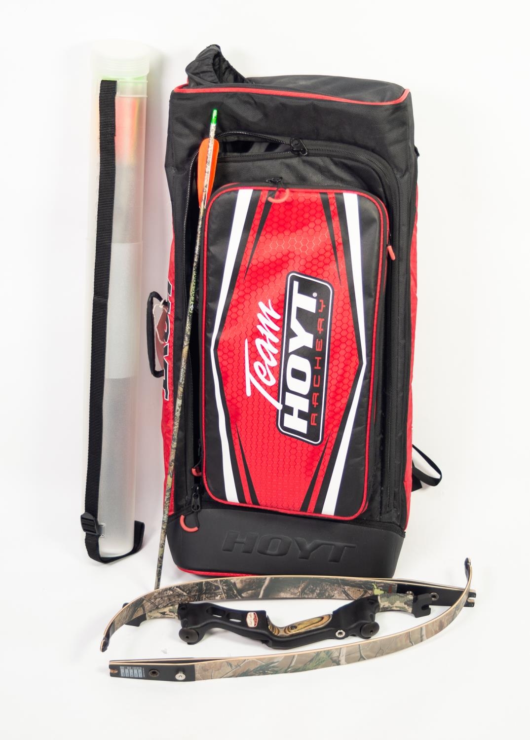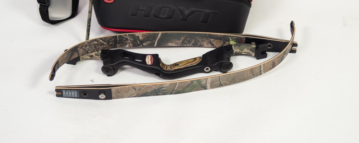 LEFT HANDED HOYT, FRED EICHLER SIGNATURE SERIES BUFFALO RECURVE BOW, the limbs marked BTM 50LBS, SHORT, together with a SET OF TWELVE EASTON XX78 SUPER SLAM DIGITAL 510/2114 ARROWS in an Easton expandable frosted plastic tube and an EASTON BELT WITH ARROW HOLDER, STRINGS, etc, in a HOYT black and red soft case