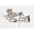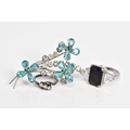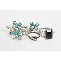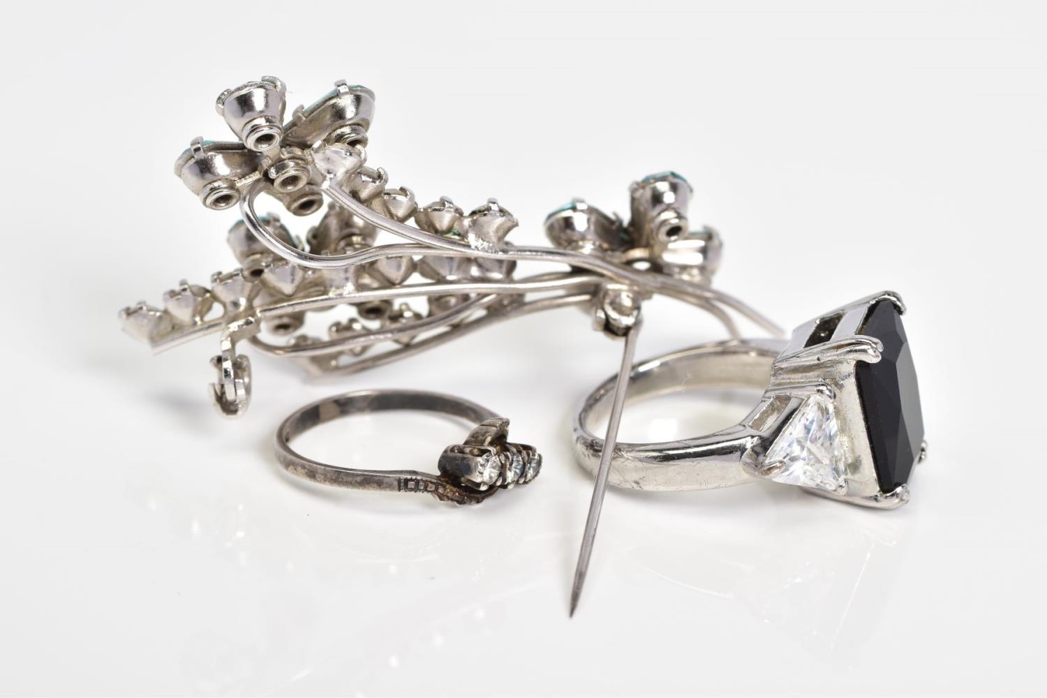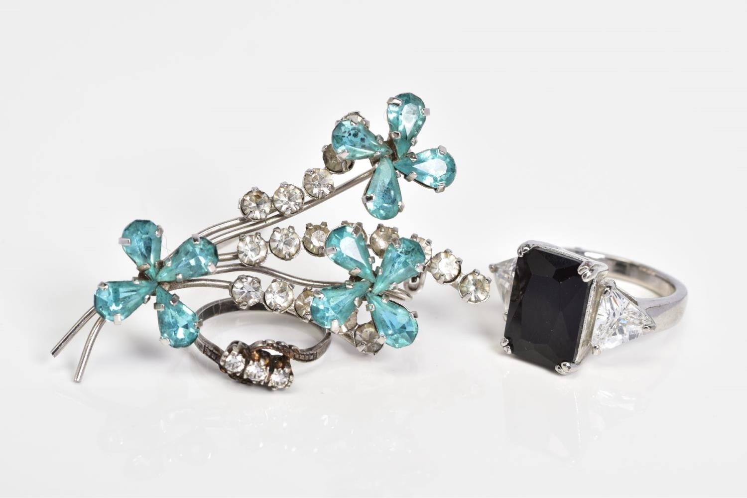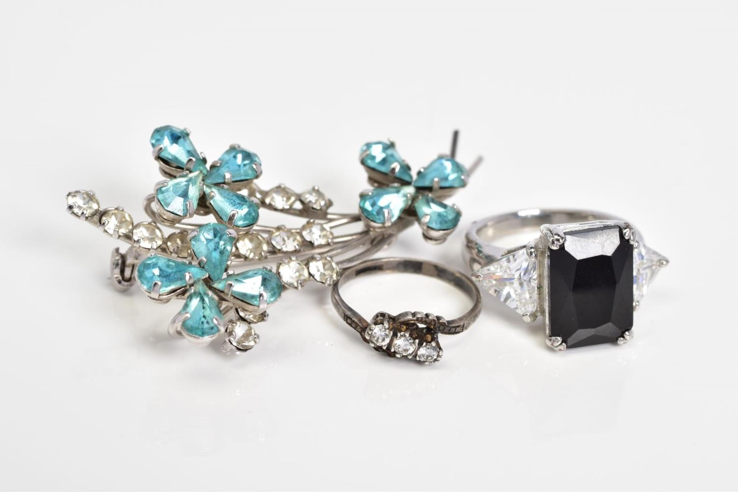 A SELECTION OF JEWELLERY, to include a silver ring set with three circular cut colourless stones assessed as paste, ring size J 1/2, with a silver hallmark for Birmingham, a white metal ring set with a large rectangular cut onyx, with triangular cut colourless paste shoulders, ring size M, a white metal floral brooch, set with blue and colourless paste