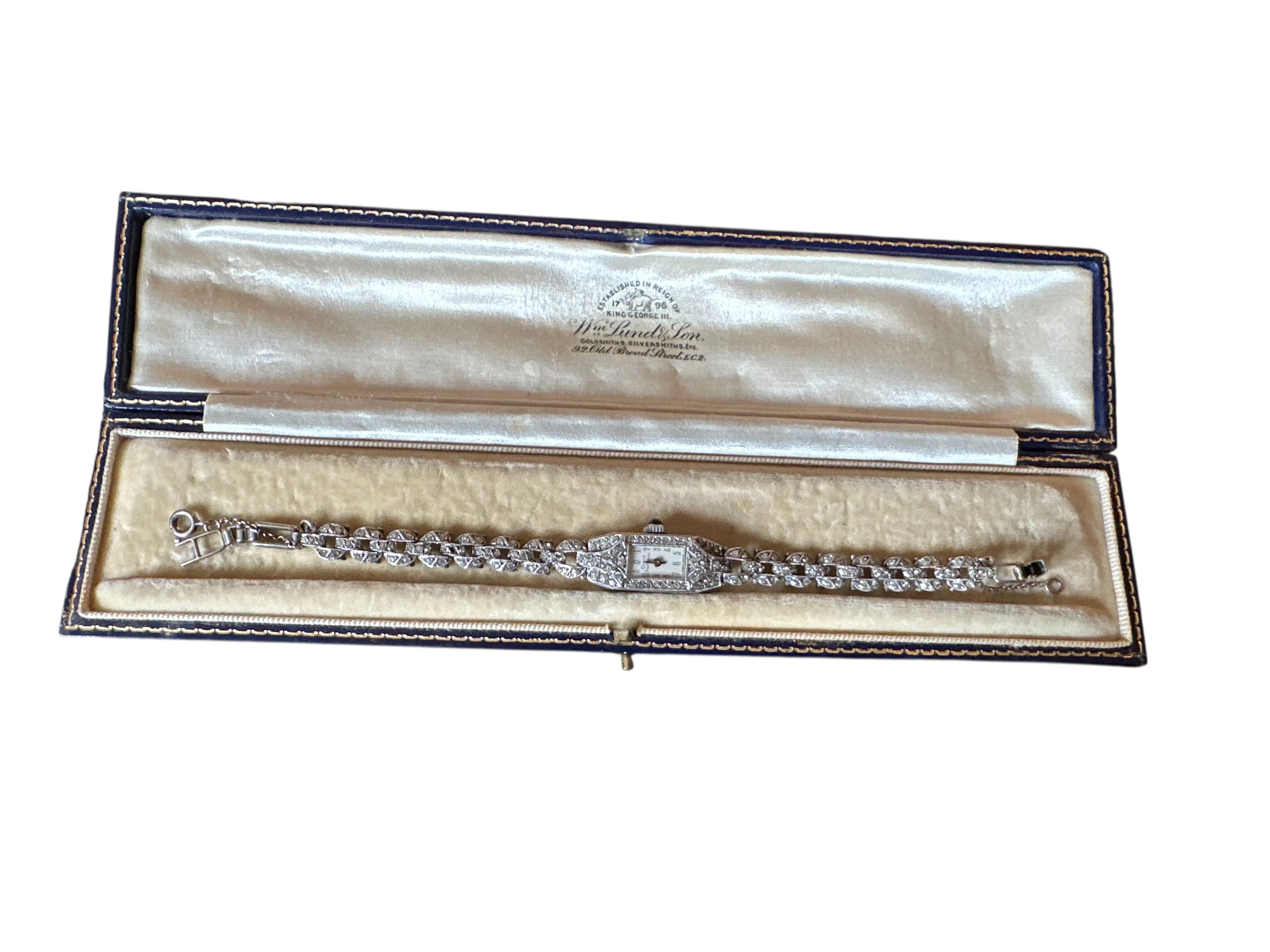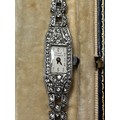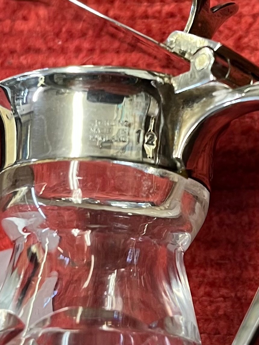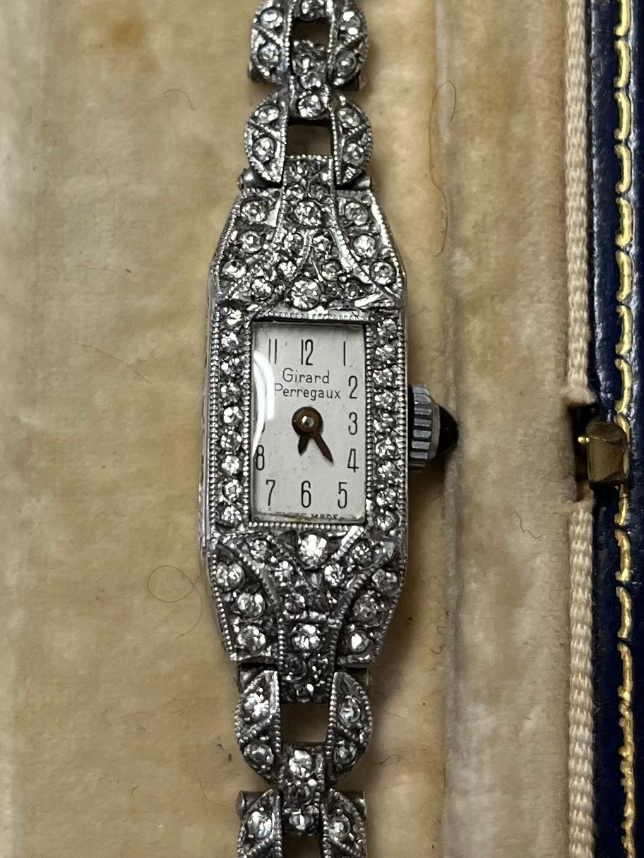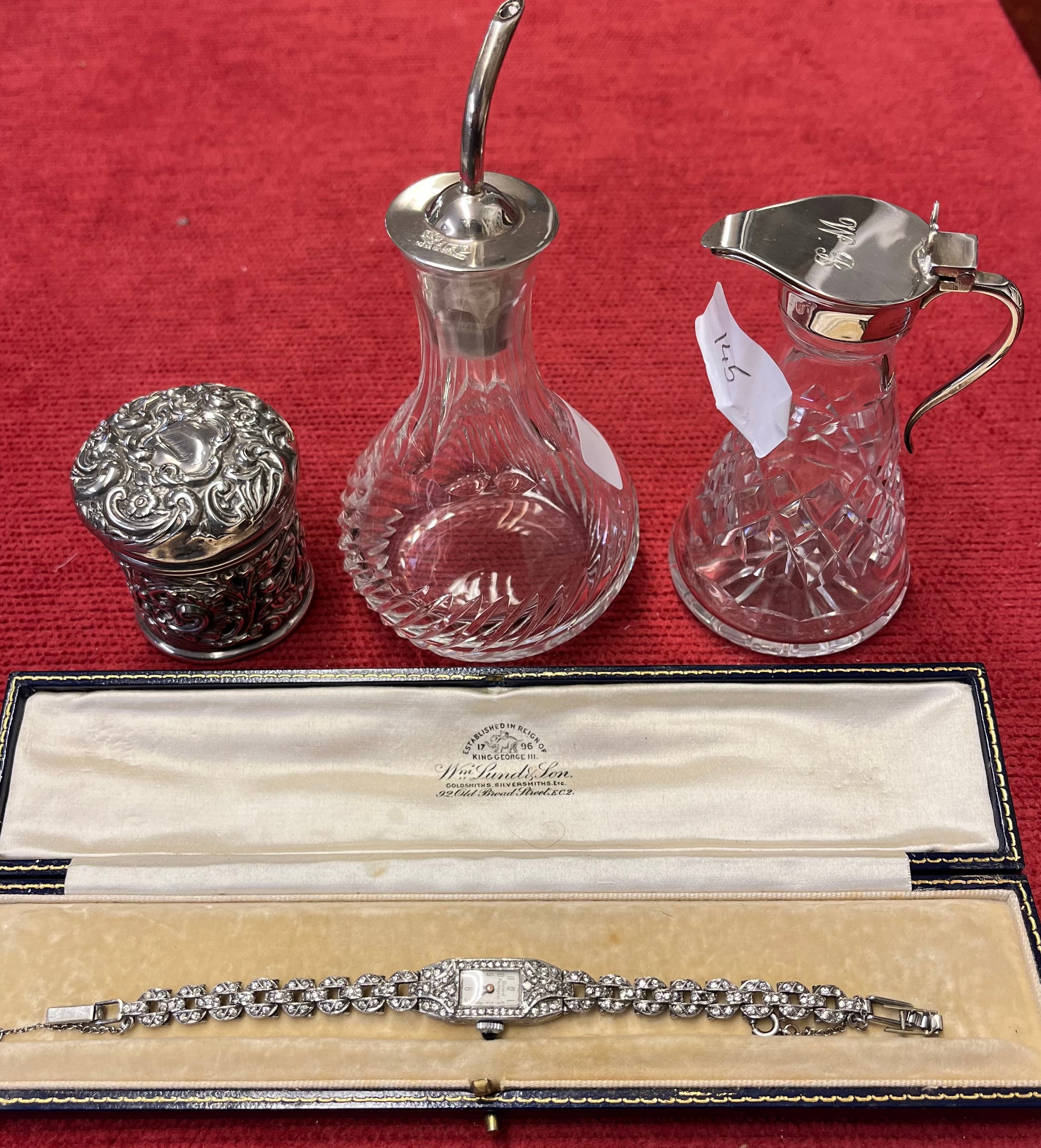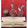 A collection of sterling silver items to include a lidded pot with glass liner, silver toped glass whisky noggin and a Girard Perragaux sterling silver and paste cocktail watch.