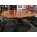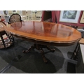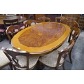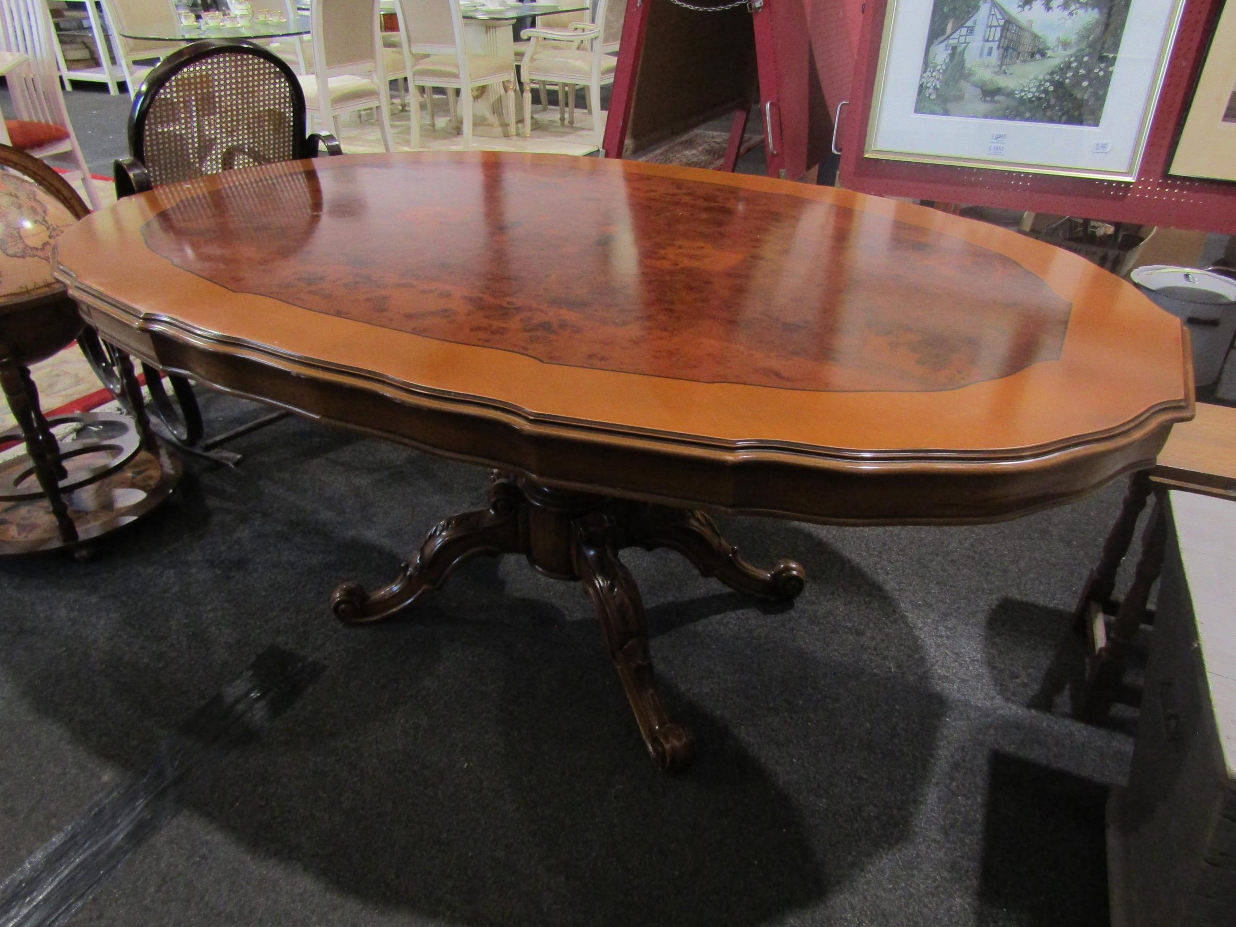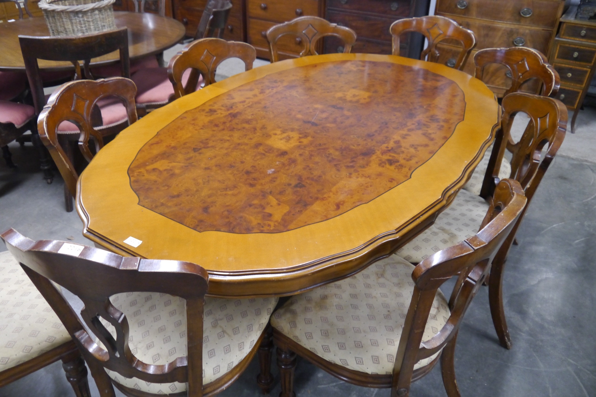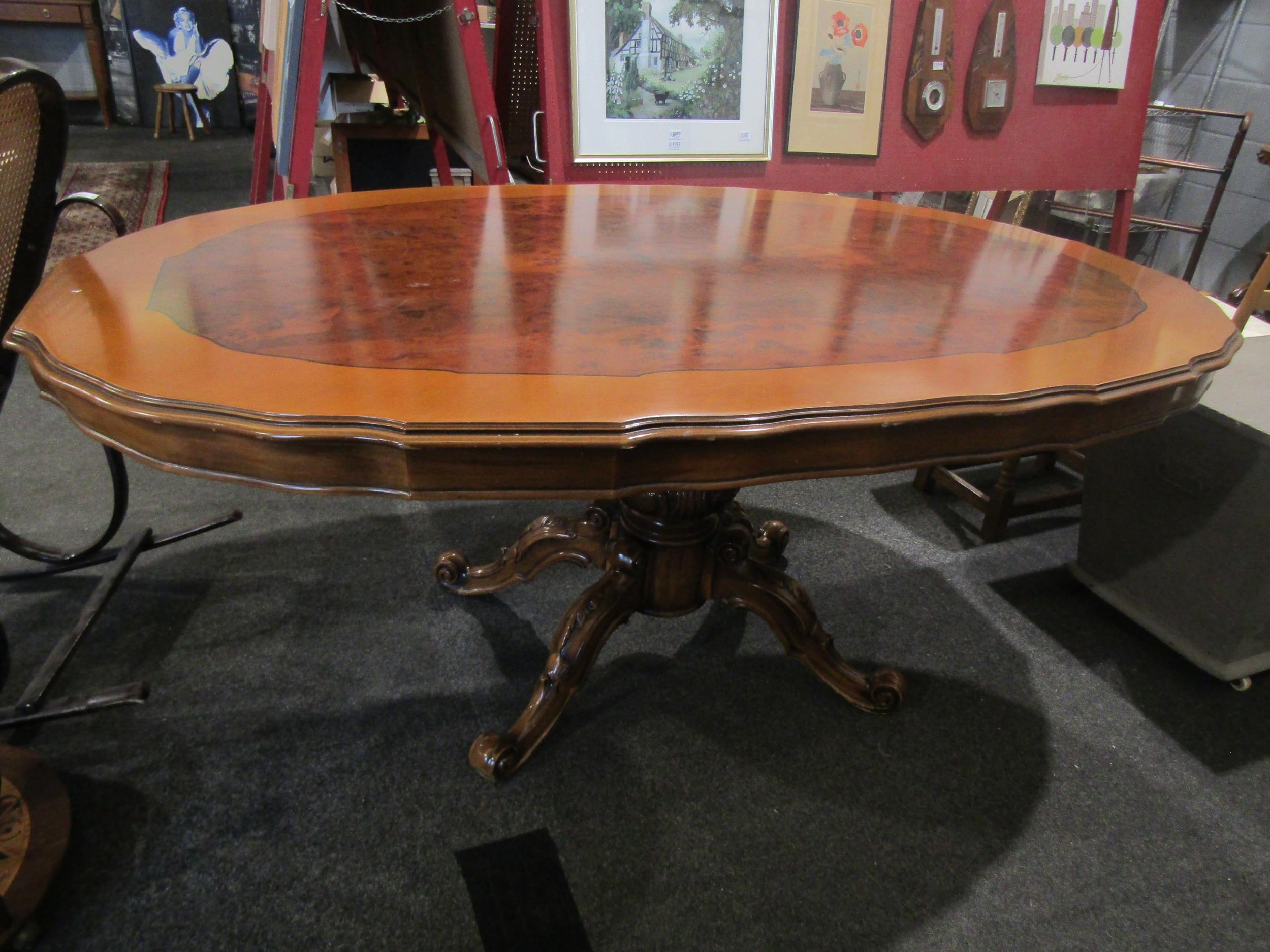 An Italian burr walnut shaped top dining table on four outswept legs with acanthus detail, 175cm long x 108cm wide