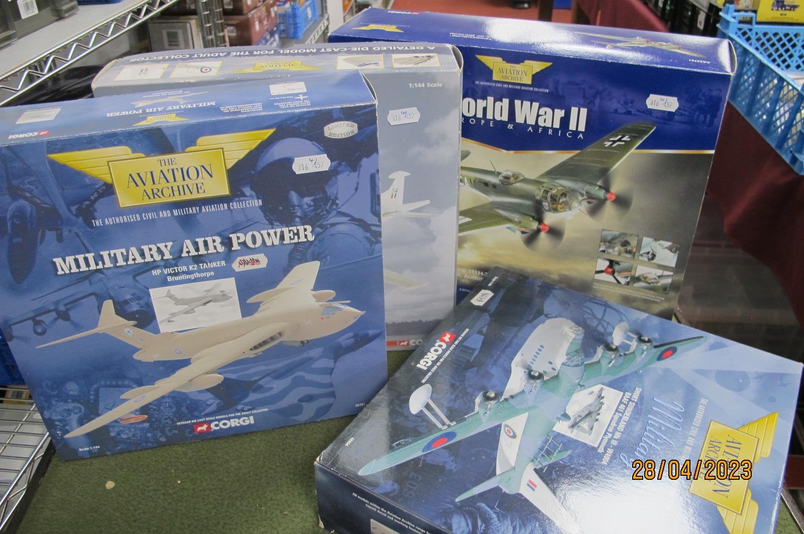 Four Corgi 'The Aviation Archive' Diecast Model Aircraft, comprising of #48701 HP Victor K2 Tanker, #48804 Short Sunderland MKIII-W4004, #AA33701 Heinkel HE III-HE-3-II/KGI 'Hindenburg', #AA35602 Hawker Siddley Nimrod MR.I, small parts missing, models may have previously been displayed, boxed.