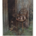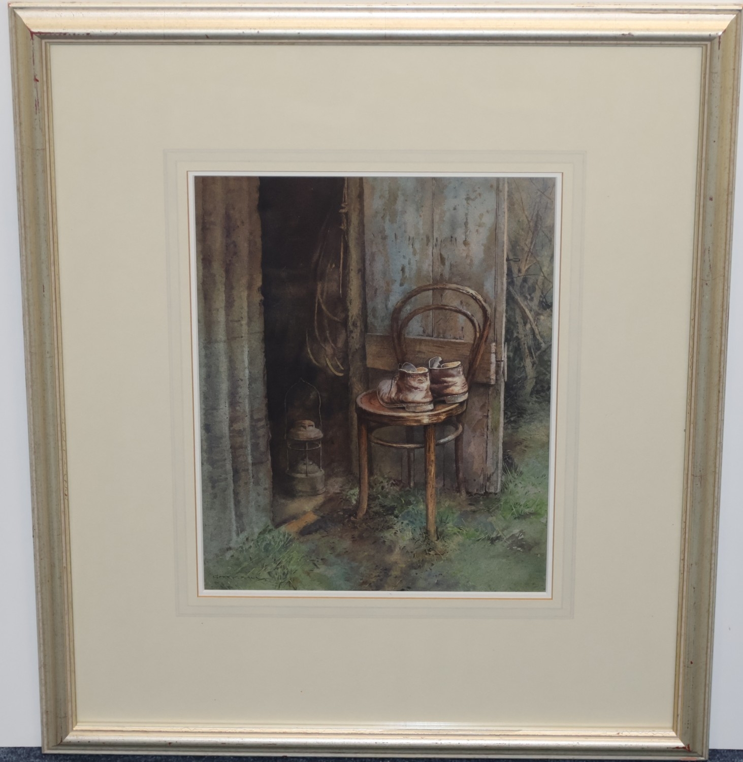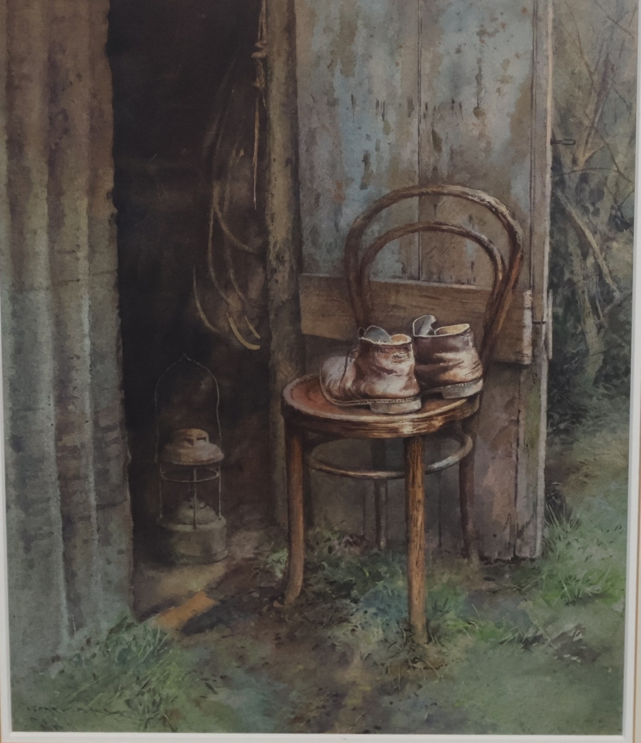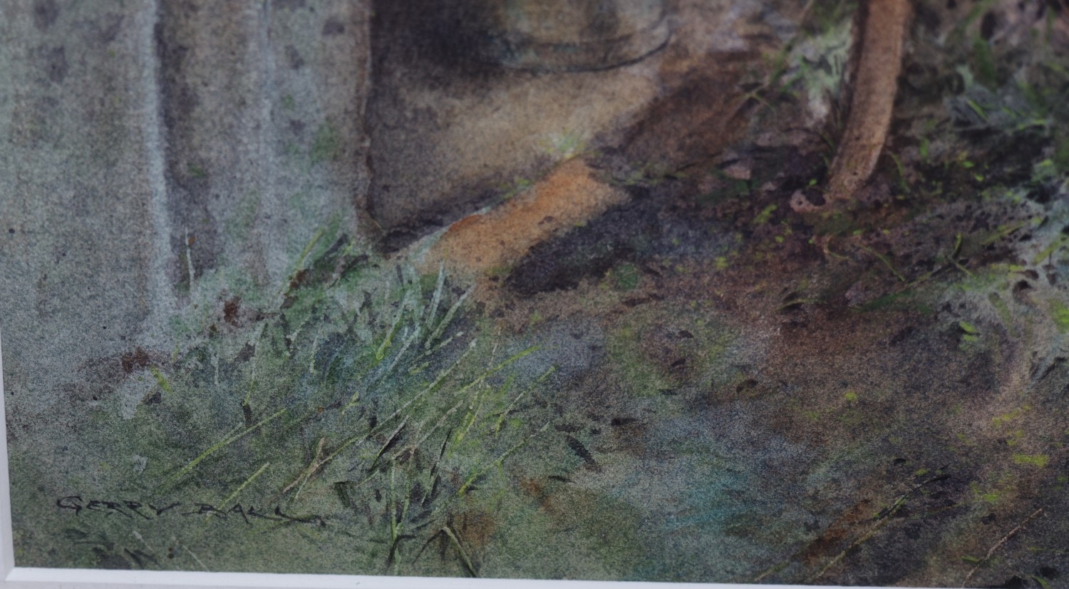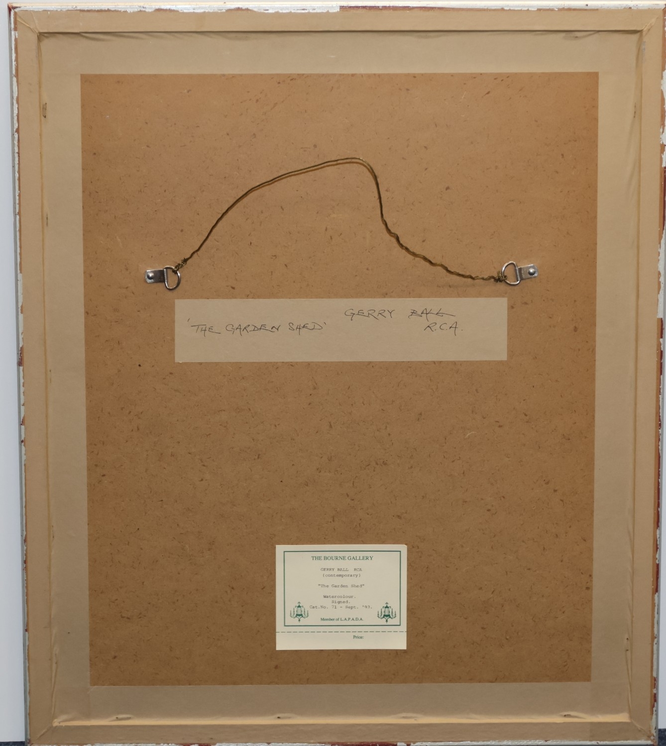Gerry Ball, watercolour, 32cm x 24.5cm, "The Garden Shed", signed and labelled to reverse, in silvered frame