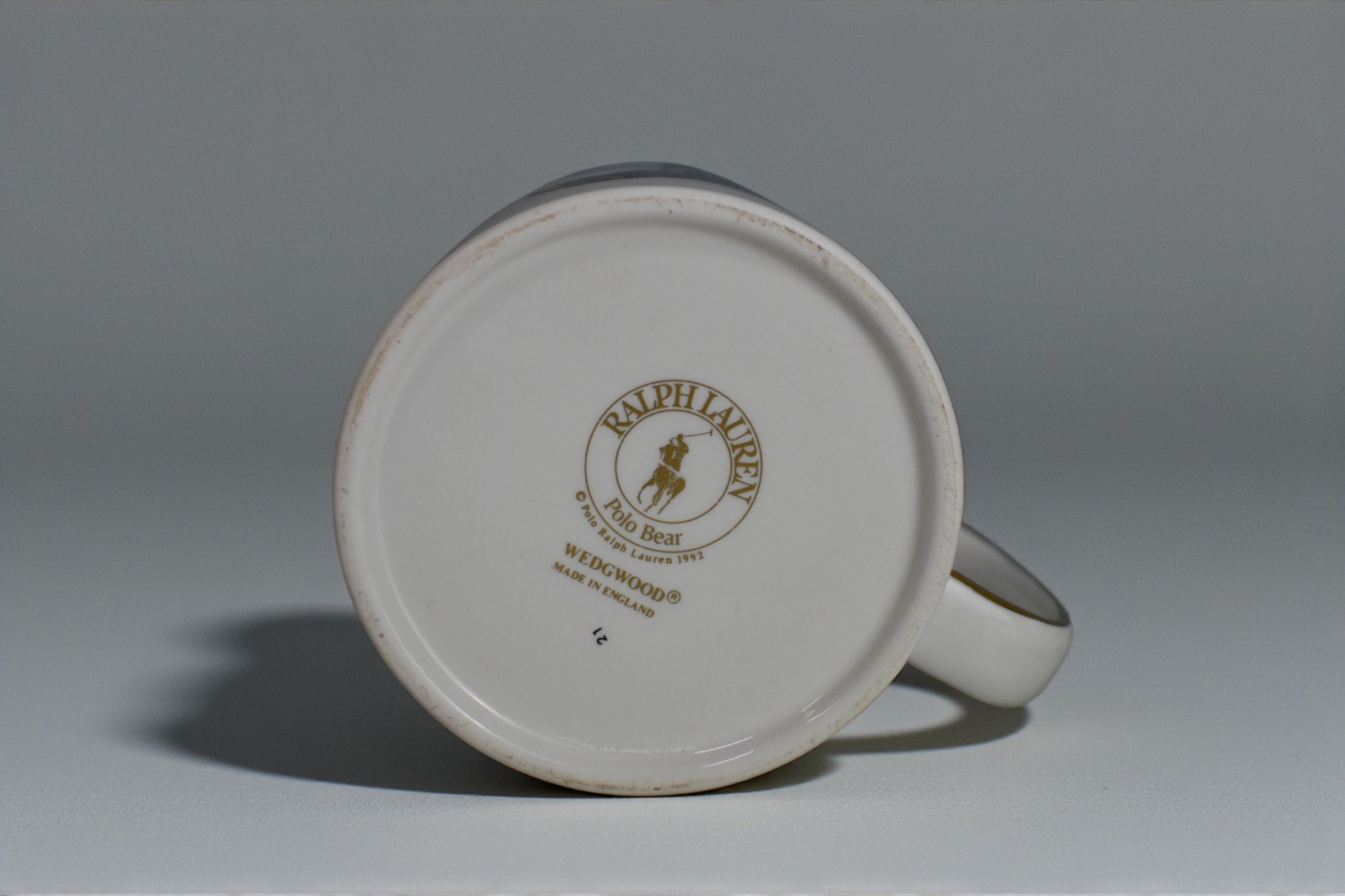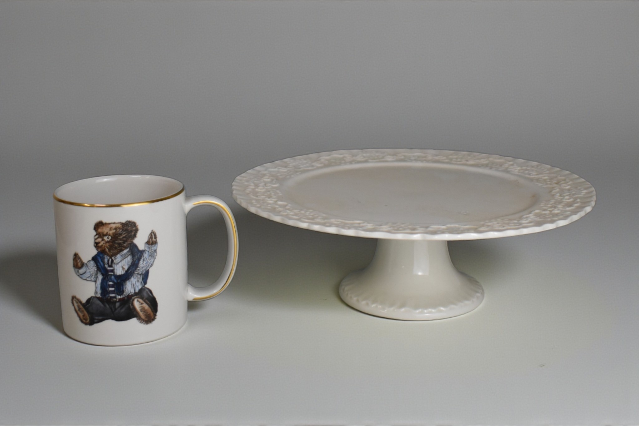 A Ralph Lauren Wedgwood Polo bear mug and a Ralph Lauren cake stand.