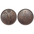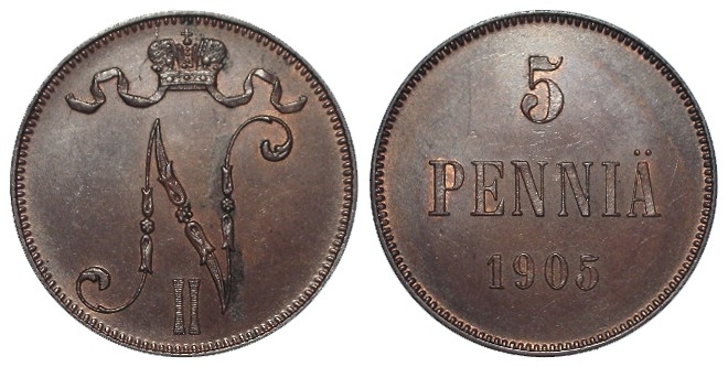 Finland 5 Pennia 1905 toned UNC, trace lustre. Scarce in high grade.