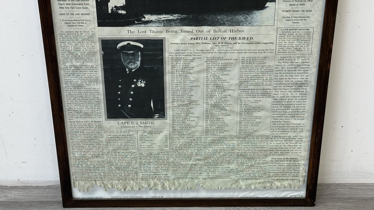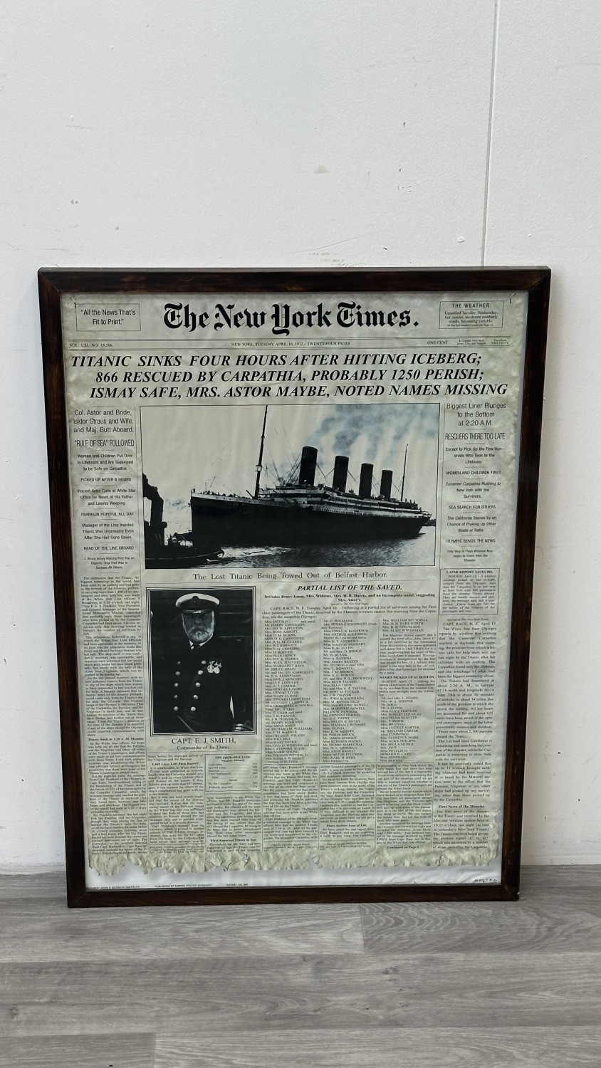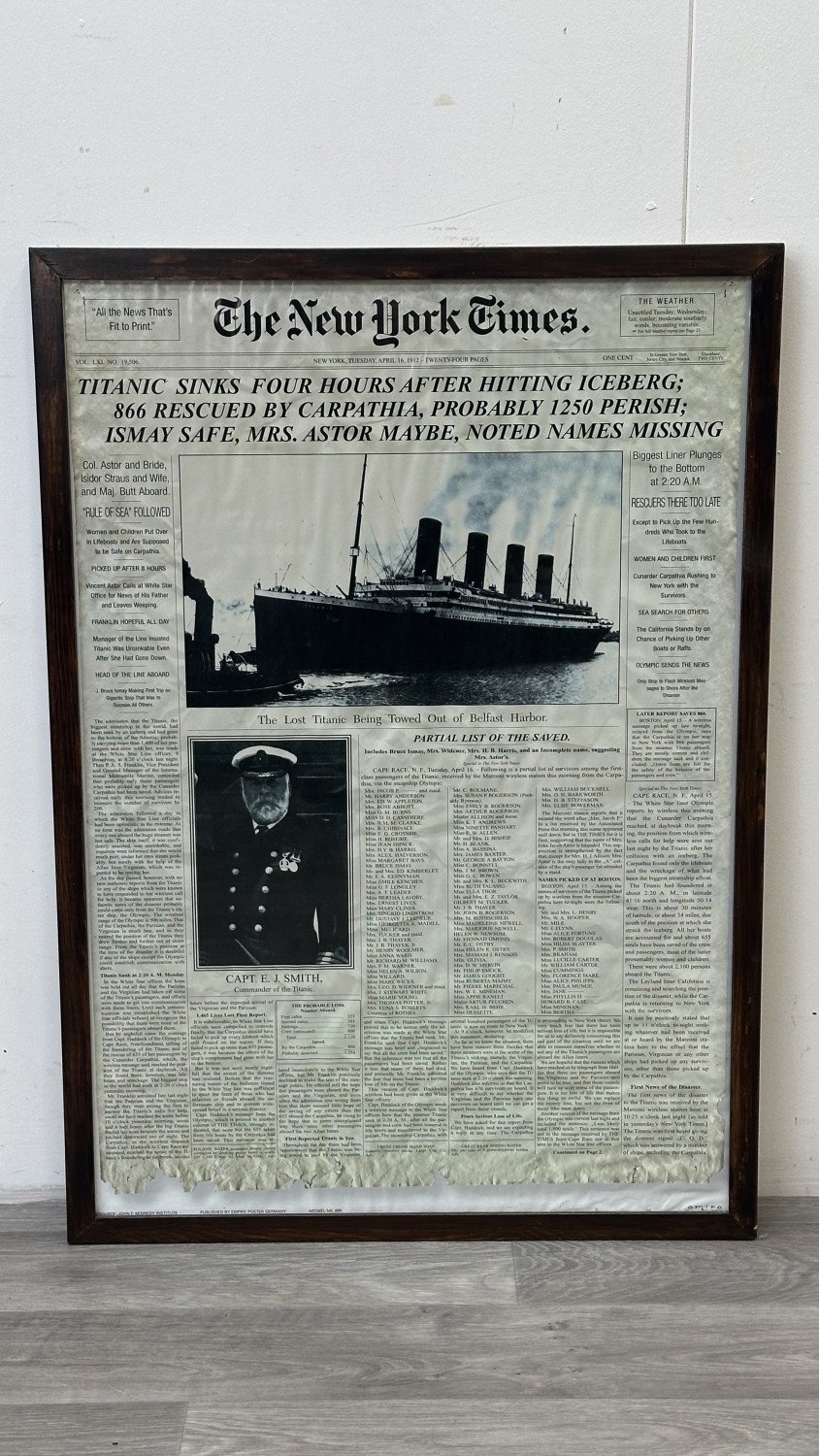 A framed reproduction The New York Times 'Titanic' Tuesday, April 16th, 1912 newspaper print, published by Empire Poster Germany - approx. 87cm high x 61cm wide